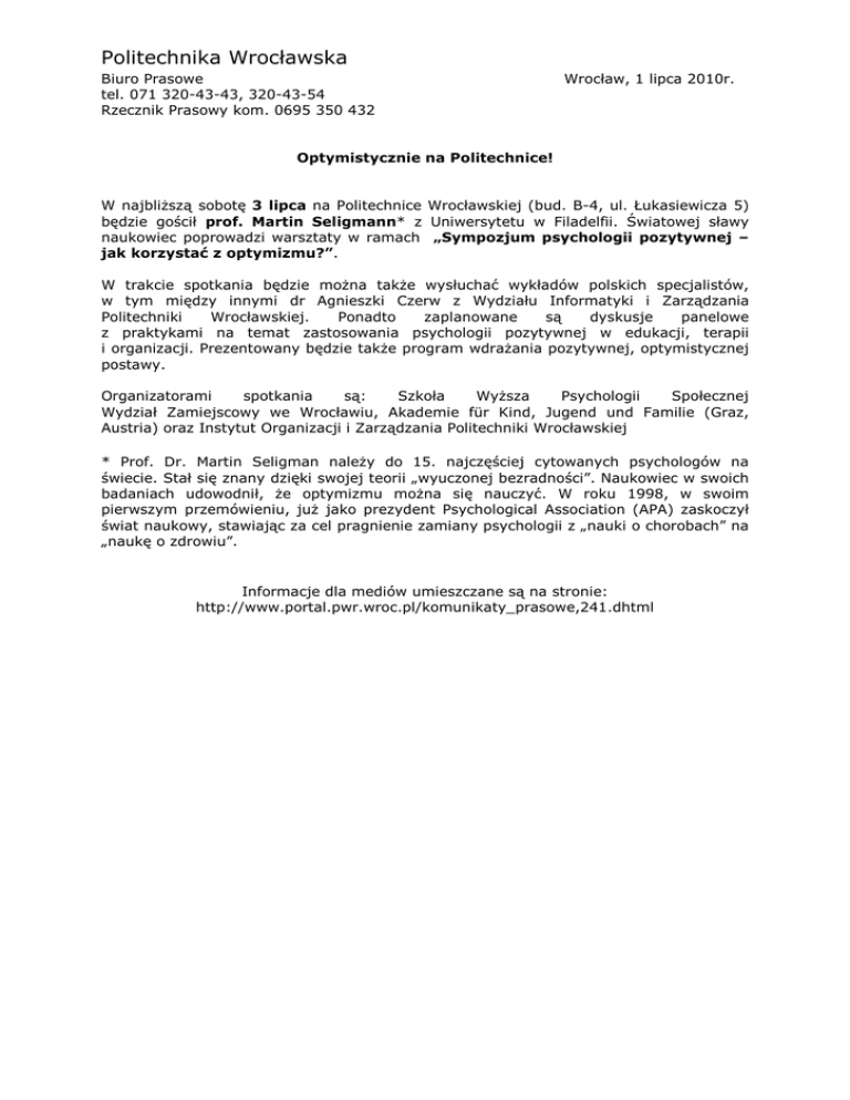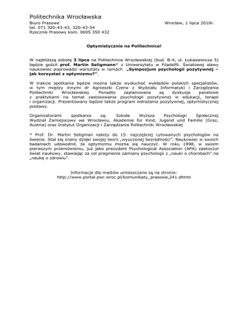 Politechnika Wrocławska Biuro Prasowe tel. 071 320-43-43, 320-43-54 Rzecznik Prasowy kom. 0695 350 432 Wrocław, 1 lipca 2010r. Optymistycznie na Politechnice! W najbliŜszą sobotę 3 lipca na Politechnice Wrocławskiej (bud. B-4, ul. Łukasiewicza 5) będzie gościł prof. Martin Seligmann* z Uniwersytetu w Filadelfii. Światowej sławy naukowiec poprowadzi warsztaty w ramach „Sympozjum psychologii pozytywnej – jak korzystać z optymizmu?”. W trakcie spotkania będzie moŜna takŜe wysłuchać wykładów polskich specjalistów, w tym między innymi dr Agnieszki Czerw z Wydziału Informatyki i Zarządzania Politechniki Wrocławskiej. Ponadto zaplanowane są dyskusje panelowe z praktykami na temat zastosowania psychologii pozytywnej w edukacji, terapii i organizacji. Prezentowany będzie takŜe program wdraŜania pozytywnej, optymistycznej postawy. Organizatorami spotkania są: Szkoła WyŜsza Psychologii Społecznej Wydział Zamiejscowy we Wrocławiu, Akademie für Kind, Jugend und Familie (Graz, Austria) oraz Instytut Organizacji i Zarządzania Politechniki Wrocławskiej * Prof. Dr. Martin Seligman naleŜy do 15. najczęściej cytowanych psychologów na świecie. Stał się znany dzięki swojej teorii „wyuczonej bezradności”. Naukowiec w swoich badaniach udowodnił, Ŝe optymizmu moŜna się nauczyć. W roku 1998, w swoim pierwszym przemówieniu, juŜ jako prezydent Psychological Association (APA) zaskoczył świat naukowy, stawiając za cel pragnienie zamiany psychologii z „nauki o chorobach” na „naukę o zdrowiu”. Informacje dla mediów umieszczane są na stronie: http://www.portal.pwr.wroc.pl/komunikaty_prasowe,241.dhtml