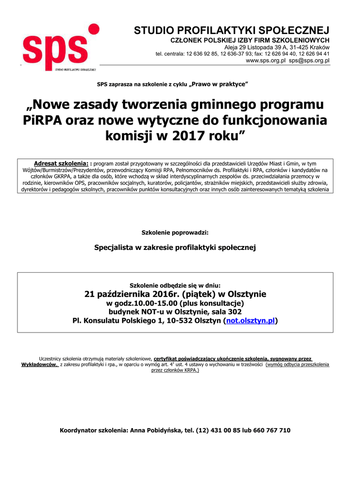STUDIO PROFILAKTYKI SPOŁECZNEJ CZŁONEK POLSKIEJ IZBY FIRM SZKOLENIOWYCH Aleja 29 Listopada 39 A, 31-425 Kraków tel. centrala: 12 636 92 85, 12 636-37 93; fax: 12 626 94 40, 12 626 94 41 www.sps.org.pl [email protected] SPS zaprasza na szkolenie z cyklu „Prawo w praktyce” „Nowe zasady tworzenia gminnego programu PiRPA oraz nowe wytyczne do funkcjonowania komisji w 2017 roku” Adresat szkolenia: : program został przygotowany w szczególności dla przedstawicieli Urzędów Miast i Gmin, w tym Wójtów/Burmistrzów/Prezydentów, przewodniczący Komisji RPA, Pełnomocników ds. Profilaktyki i RPA, członków i kandydatów na członków GKRPA, a także dla osób, które wchodzą w skład interdyscyplinarnych zespołów ds. przeciwdziałania przemocy w rodzinie, kierowników OPS, pracowników socjalnych, kuratorów, policjantów, strażników miejskich, przedstawicieli służby zdrowia, dyrektorów i pedagogów szkolnych, pracowników punktów konsultacyjnych oraz innych osób zainteresowanych tematyką szkolenia Szkolenie poprowadzi: Specjalista w zakresie profilaktyki społecznej Szkolenie odbędzie się w dniu: 21 października 2016r. (piątek) w Olsztynie w godz.10.00-15.00 (plus konsultacje) budynek NOT-u w Olsztynie, sala 302 Pl. Konsulatu Polskiego 1, 10-532 Olsztyn (not.olsztyn.pl) Uczestnicy szkolenia otrzymują materiały szkoleniowe, certyfikat poświadczający ukończenie szkolenia, sygnowany przez Wykładowców, z zakresu profilaktyki i rpa., w oparciu o wymóg art. 41 ust. 4 ustawy o wychowaniu w trzeźwości (wymóg odbycia przeszkolenia przez członków KRPA.) Koordynator szkolenia: Anna Pobidyńska, tel. (12) 431 00 85 lub 660 767 710 STUDIO PROFILAKTYKI SPOŁECZNEJ CZŁONEK POLSKIEJ IZBY FIRM SZKOLENIOWYCH Aleja 29 Listopada 39 A, 31-425 Kraków tel. centrala: 12 636 92 85, 12 636-37 93; fax: 12 626 94 40, 12 626 94 41 www.sps.org.pl [email protected] „Nowe zasady tworzenia gminnego programu PiRPA oraz nowe wytyczne do funkcjonowania komisji w 2017 roku”- program szkolenia: 21.10.2016 r. godz.10.00-15.00, NOT w Olsztynie godz.: 10.00-15.00 (13.00-13.30 Lunch): 1. Omówienie nowych zasad tworzenia i realizacji gminnego programu pirpa 2. Programy profilaktyczne dla nowych grup docelowych jako nowe zadanie własne gminy 3. Procedura Niebieskie Karty w komisji - analiza wytycznych pokontrolnych 4. Kontrola punktów sprzedaży napojów alkoholowych w oparciu o zapisy ustawowe, wytyczne NIKu 5. Rola komisji w weryfikacji oświadczeń przedsiębiorców składanych w styczniu 2017 - materiały przygotowujące do weryfikacji, przed złożeniem oświadczenia 6. Sądowa procedura zobowiązania do podjęcia leczenia odwykowego - przesłanki ustawowe, przydatne modele współpracy z sądem 7. Rozmowa motywacyjna z osobą pijącą - jak ją przeprowadzić? 8. Zaplanowanie wydatków środków alkoholowych pod katem efektywności, zgodności z prawem i logika postępowania 9. Kodeks Postępowania Administracyjnego w komisji- kiedy i jak? 10. Dane osobowe w komisji - etap wpłynięcia danych, dostępu do danych, przetwarzania danych, przechowywania, archiwizowania, utylizowania, rola ABI 15.00 Wręczenie certyfikatów ukończenia szkolenia od 15.00 Odpowiedzi na pytania i konsultacje indywidualne Koszt szkolenia: cena szkolenia wynosi 310 zł od 1 osoby i obejmuje: - poczęstunek- kawa, herbata, napoje, lunch, autorskie materiały szkoleniowe. - Uczestnicy szkolenia otrzymują materiały szkoleniowe, certyfikat poświadczający ukończenie szkolenia z zakresu profilaktyki i rpa., w oparciu o wymóg art. 41 ust. 4 ustawy o wychowaniu w trzeźwości Należność za udział w szkoleniu należy przesłać po szkoleniu, po otrzymaniu FV, w terminie 7 dni Dojazd na własny koszt. Koordynator szkolenia: Anna Pobidyńska, tel. (12) 431 00 85 lub 660 767 710 STUDIO PROFILAKTYKI SPOŁECZNEJ CZŁONEK POLSKIEJ IZBY FIRM SZKOLENIOWYCH Aleja 29 Listopada 39 A, 31-425 Kraków tel. centrala: 12 636 92 85, 12 636-37 93; fax: 12 626 94 40, 12 626 94 41 www.sps.org.pl [email protected] …………...................................... dnia KARTA ZGŁOSZENIA UCZESTNICTWA W SZKOLENIU NAZWA FORMY DOSKONALENIA: „Nowe zasady tworzenia gminnego programu PiRPA oraz nowe wytyczne do funkcjonowania komisji w 2017 roku” TERMIN I MIEJSCE: 21.10.2016 r. budynek NOT-u w Olsztynie, sala 302, godz. 10-15 Pl. Konsulatu Polskiego 1, 10-532 Olsztyn (not.olsztyn.pl) L.p. Imię i nazwisko (dane prosimy wpisywać drukowanymi literami) Funkcja TEL. KONTAKTOWY:………...............................…………………………………………………………....................……... ADRES E-MAIL:……………………………...............................…………………………………………....................………. FAKTURĘ VAT PROSZĘ WYSTAWIĆ NA:…………..............................…………………………….....................………… ADRES:……………………………………………..............................…… NIP:............…..….….…...........................………. Wyrażam zgodę na przetwarzanie moich danych osobowych przez Studio Profilaktyki Społecznej oraz Suprema Lex CSKiS, dla potrzeb zgłoszonego szkolenia, zgodnie z ustawą z dnia 29 sierpnia 1997 r. o ochronie danych osobowych (Dz. U. z 1997 r. Nr 133, poz. .883). Wyrażam zgodę na otrzymywanie informacji o szkoleniach i usługach firmy Studio Profilaktyki Społecznej oraz Suprema Lex CSKiS w rozumieniu ust. z dnia 18 lipca 2002r. o świadczeniu usług drogą elektroniczną na adres e-mail. Dane nie będą przekazywane podmiotom trzecim. AP ………………………..................…………………….. Pieczęć i podpis zgłaszającego oraz Instytucji zgłaszającej Oświadczam, iż środki wydatkowane na w/w szkolenie pochodzą w co najmniej 70% ze środków publicznych w rozumieniu ustawy o finansach publicznych. ………………………..................