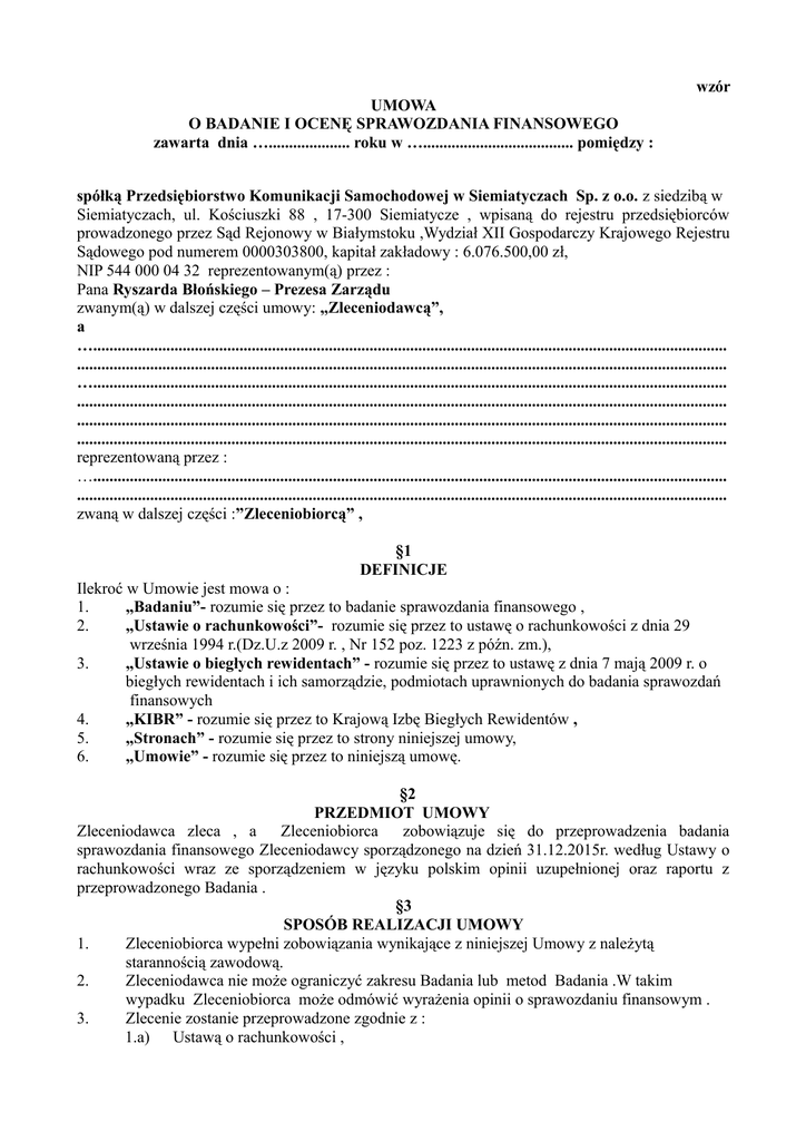 wzór UMOWA O BADANIE I OCENĘ SPRAWOZDANIA FINANSOWEGO zawarta dnia ….................... roku w …..................................... pomiędzy : spółką Przedsiębiorstwo Komunikacji Samochodowej w Siemiatyczach Sp. z o.o. z siedzibą w Siemiatyczach, ul. Kościuszki 88 , 17-300 Siemiatycze , wpisaną do rejestru przedsiębiorców prowadzonego przez Sąd Rejonowy w Białymstoku ,Wydział XII Gospodarczy Krajowego Rejestru Sądowego pod numerem 0000303800, kapitał zakładowy : 6.076.500,00 zł, NIP 544 000 04 32 reprezentowanym(ą) przez : Pana Ryszarda Błońskiego – Prezesa Zarządu zwanym(ą) w dalszej części umowy: „Zleceniodawcą”, a …............................................................................................................................................................ ................................................................................................................................................................ …............................................................................................................................................................ ................................................................................................................................................................ ................................................................................................................................................................ ................................................................................................................................................................ reprezentowaną przez : …............................................................................................................................................................ ................................................................................................................................................................ zwaną w dalszej części :”Zleceniobiorcą” , §1 DEFINICJE Ilekroć w Umowie jest mowa o : 1. „Badaniu”- rozumie się przez to badanie sprawozdania finansowego , 2. „Ustawie o rachunkowości”- rozumie się przez to ustawę o rachunkowości z dnia 29 września 1994 r.(Dz.U.z 2009 r. , Nr 152 poz. 1223 z późn. zm.), 3. „Ustawie o biegłych rewidentach” - rozumie się przez to ustawę z dnia 7 mają 2009 r. o biegłych rewidentach i ich samorządzie, podmiotach uprawnionych do badania sprawozdań finansowych 4. „KIBR” - rozumie się przez to Krajową Izbę Biegłych Rewidentów , 5. „Stronach” - rozumie się przez to strony niniejszej umowy, 6. „Umowie” - rozumie się przez to niniejszą umowę. §2 PRZEDMIOT UMOWY Zleceniodawca zleca , a Zleceniobiorca zobowiązuje się do przeprowadzenia badania sprawozdania finansowego Zleceniodawcy sporządzonego na dzień 31.12.2015r. według Ustawy o rachunkowości wraz ze sporządzeniem w języku polskim opinii uzupełnionej oraz raportu z przeprowadzonego Badania . §3 SPOSÓB REALIZACJI UMOWY 1. Zleceniobiorca wypełni zobowiązania wynikające z niniejszej Umowy z należytą starannością zawodową. 2. Zleceniodawca nie może ograniczyć zakresu Badania lub metod Badania .W takim wypadku Zleceniobiorca może odmówić wyrażenia opinii o sprawozdaniu finansowym . 3. Zlecenie zostanie przeprowadzone zgodnie z : 1.a) Ustawą o rachunkowości , 1.b) krajowymi standardami rewizji finansowej wydanymi przez KIBR, Ustawą o biegłych rewidentach , 4. Po wcześniejszym uzgodnieniu ze Zleceniodawcą , Zleceniobiorca jest upoważniony do otrzymania od kontrahentów Spółki i innych podmiotów wszelkich informacji , które Zleceniobiorca uzna za stosowne . §4 CZAS REALIZACJI UMOWY 1. Czynności związane z Badaniem będą przez Zleceniobiorcę wykonane do dnia 15.03.2016 r. pod warunkiem udostępnienia Zleceniobiorcy przez Zleceniodawcę do badania ksiąg rachunkowych (w tym dowodów księgowych) oraz niezbędnych danych i informacji o których mowa w §5. 2. Zleceniodawca przekaże Zleceniobiorcy sprawozdanie finansowe , będące przedmiotem Badania w terminie nieprzekraczalnym do dnia 15.02.2016r. 3. W przypadku niedotrzymania przez Zleceniodawcę terminu, o którym mowa w ust.2 ,okres Badania przez Zleceniobiorcę zostanie ponownie ustalony przez Strony , z uwzględnieniem możliwości wywiązania się z procedury zatwierdzania sprawozdania finansowego przez Zleceniodawcę . W przypadku niedotrzymania przez Zleceniodawcę terminów ustalonych w sposób , o którym mowa w zdaniu poprzednim powyższy harmonogram prac zostanie ponownie ustalony przez Zleceniodawcę . 4. Zleceniodawca otrzyma podpisane i parafowane siedem egzemplarzy opinii uzupełnionej o raport z Badania w wersji polskiej . 5. Każdy dodatkowy egzemplarz , uzgodniony ze Zleceniodawcą , będzie rozliczany według cennika usług Zleceniobiorcy . §5 OBOWIĄZKI ZLECENIODAWCY 1. Aby umożliwić Zleceniobiorcy prawidłowe wykonywanie niniejszej umowy , Zleceniodawca zobowiązuje się do : 1. udostępnienia wykonawcom umowy desygnowanym przez Zleceniobiorcę : a) kompletnych dokumentów organizacyjnych przedsiębiorstwa , b) umów zawartych przez Zleceniodawcę, udzielonych przez niego gwarancji, a także innych dokumentów tego rodzaju, c) sprawozdania finansowego oraz ksiąg rachunkowych i dowodów księgowych, d) wszelkich innych dokumentów mających związek z przedmiotem niniejszej umowy; 2. udzielenia wyczerpujących informacji i wyjaśnień niezbędnych do opracowania opinii i raportu z Badania : 3. składania przedstawicielom Zleceniobiorcy pisemnych oświadczeń , dotyczących między innymi: a) uznania przez kierownictwo Zleceniodawcy odpowiedzialności za prawidłowość i rzetelność sprawozdania finansowego , b) stwierdzenia, że według wiedzy i najlepszej wiary Zleceniodawcy sprawozdanie finansowe , będące przedmiotem opinii jest wolne od istotnych błędów i przeoczeń, c) potwierdzenia kompletności udos