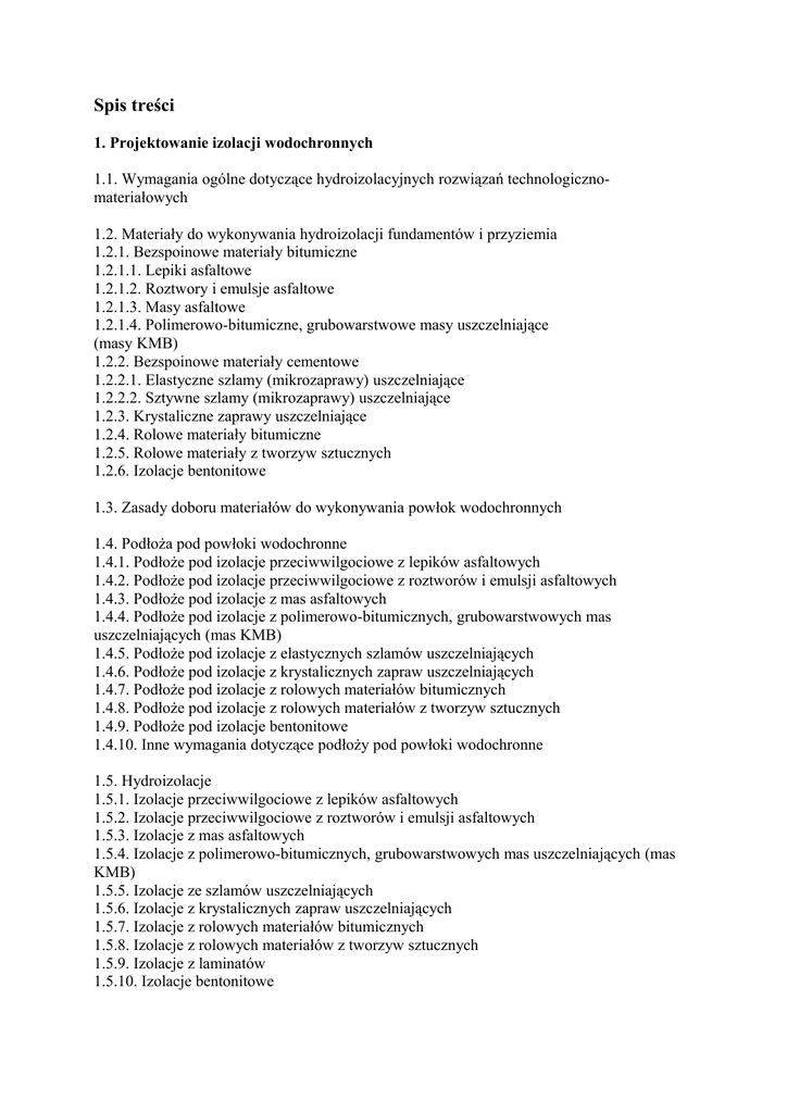 Spis treści 1. Projektowanie izolacji wodochronnych 1.1. Wymagania ogólne dotyczące hydroizolacyjnych rozwiązań technologicznomateriałowych 1.2. Materiały do wykonywania hydroizolacji fundamentów i przyziemia 1.2.1. Bezspoinowe materiały bitumiczne 1.2.1.1. Lepiki asfaltowe 1.2.1.2. Roztwory i emulsje asfaltowe 1.2.1.3. Masy asfaltowe 1.2.1.4. Polimerowo-bitumiczne, grubowarstwowe masy uszczelniające (masy KMB) 1.2.2. Bezspoinowe materiały cementowe 1.2.2.1. Elastyczne szlamy (mikrozaprawy) uszczelniające 1.2.2.2. Sztywne szlamy (mikrozaprawy) uszczelniające 1.2.3. Krystaliczne zaprawy uszczelniające 1.2.4. Rolowe materiały bitumiczne 1.2.5. Rolowe materiały z tworzyw sztucznych 1.2.6. Izolacje bentonitowe 1.3. Zasady doboru materiałów do wykonywania powłok wodochronnych 1.4. Podłoża pod powłoki wodochronne 1.4.1. Podłoże pod izolacje przeciwwilgociowe z lepików asfaltowych 1.4.2. Podłoże pod izolacje przeciwwilgociowe z roztworów i emulsji asfaltowych 1.4.3. Podłoże pod izolacje z mas asfaltowych 1.4.4. Podłoże pod izolacje z polimerowo-bitumicznych, grubowarstwowych mas uszczelniających (mas KMB) 1.4.5. Podłoże pod izolacje z elastycznych szlamów uszczelniających 1.4.6. Podłoże pod izolacje z krystalicznych zapraw uszczelniających 1.4.7. Podłoże pod izolacje z rolowych materiałów bitumicznych 1.4.8. Podłoże pod izolacje z rolowych materiałów z tworzyw sztucznych 1.4.9. Podłoże pod izolacje bentonitowe 1.4.10. Inne wymagania dotyczące podłoży pod powłoki wodochronne 1.5. Hydroizolacje 1.5.1. Izolacje przeciwwilgociowe z lepików asfaltowych 1.5.2. Izolacje przeciwwilgociowe z roztworów i emulsji asfaltowych 1.5.3. Izolacje z mas asfaltowych 1.5.4. Izolacje z polimerowo-bitumicznych, grubowarstwowych mas uszczelniających (mas KMB) 1.5.5. Izolacje ze szlamów uszczelniających 1.5.6. Izolacje z krystalicznych zapraw uszczelniających 1.5.7. Izolacje z rolowych materiałów bitumicznych 1.5.8. Izolacje z rolowych materiałów z tworzyw sztucznych 1.5.9. Izolacje z laminatów 1.5.10. Izolacje bentonitowe 1.6. Warstwy rozdzielające i ochronne 1.7. Detale 2. Warunki techniczne wykonania i odbioru robót 2.1. Wymagania ogólne dotyczące podłoża betonowego 2.2. Wymagania ogólne dotyczące podłoża murowego 2.3. Wymagania ogólne dotyczące podłoża z tynku 2.4. Izolacja z lepików asfaltowych 2.4.1. Wymagania stawiane podłożu 2.4.2. Przygotowanie podłoża 2.4.3. Kontrola stanu podłoża przed rozpoczęciem prac 2.4.4. Przygotowanie materiału 2.4.5. Aplikacja materiału 2.4.6. Kontrola podczas wykonywania powłoki wodochronnej 2.4.7. Kontrola po wykonaniu robót 2.4.8. Ułożenie warstw ochronnych 2.5. Izolacja z roztworów i emulsji asfaltowych 2.5.1. Wymagania stawiane podłożu 2.5.2. Przygotowanie podłoża 2.5.3. Kontrola stanu podłoża przed rozpoczęciem prac 2.5.4. Przygotowanie materiału 2.5.5. Aplikacja materiału 2.5.6. Kontrola podczas wykonywania powłoki wodochronnej 2.5.7. Kontrola po wykonaniu robót 2.5.8. Ułożenie warstw ochronnych 2.6. Izolacja z mas asfaltowych i mas KMB 2.6.1. Wymagania stawiane podłożu 2.6.2. Przygotowanie podłoża 2.6.3. Kontrola stanu podłoża przed rozpoczęciem prac 2.6.4. Przygotowanie materiału 2.6.5. Aplikacja materiału 2.6.6. Kontrola podczas wykonywania powłoki wodochronnej 2.6.7. Kontrola po wykonaniu robót 2.6.8. Ułożenie warstw ochronnych 2.7. Izolacja z mikrozapraw (szlamów) uszczelniających 2.7.1. Wymagania stawiane podłożu 2.7.2. Przygotowanie podłoża 2.7.3. Kontrola stanu podłoża przed rozpoczęciem prac 2.7.4. Przygotowanie materiału 2.7.5. Aplikacja materiału 2.7.6. Kontrola podczas wykonywania powłoki wodochronnej 2.7.7. Kontrola po wykonaniu robót 2.7.8. Ułożenie warstw ochronnych 2.8. Izolacja z krystalicznych zapraw uszczelniających 2.8.1. Wymagania stawiane podłożu 2.8.2. Przygotowanie podłoża 2.8.3. Kontrola stanu podłoża przed rozpoczęciem prac 2.8.4. Przygotowanie materiału 2.8.5. Aplikacja materiału 2.8.6. Kontrola podczas wykonywania powłoki wodochronnej 2.8.7. Kontrola po wykonaniu robót 2.8.8. Ułożenie warstw ochronnych 2.9. Izolacja z rolowych materiałów bitumicznych 2.9.1. Wymagania stawiane podłożu 2.9.2. Przygotowanie podłoża 2.9.3. Kontrola stanu podłoża przed rozpoczęciem prac 2.9.4. Przygotowanie materiału 2.9.5. Aplikacja materiału 2.9.5.1. Papy termozgrzewalne 2.9.5.2. Membrany samoprzylepne 2.9.5.3. Papy klejone lepikiem 2.9.6. Kontrola podczas wykonywania powłoki wodochronnej 2.9.7. Kontrola po wykonaniu robót 2.9.8. Ułożenie warstw ochronnych 2.10. Izolacja z materiałów rolowych z tworzyw sztucznych 2.10.1. Wymagania stawiane podłożu 2.10.2. Przygotowanie podłoża 2.10.3. Kontrola stanu podłoża przed rozpoczęciem prac 2.10.4. Przygotowanie materiału 2.10.5. Aplikacja materiału 2.10.6. Kontrola podczas wykonywania powłoki wodochronnej 2.10.7. Kontrola po wykonaniu robót 2.10.8. Ułożenie warstw ochronnych 2.11. Izolacja bentonitowa 2.11.1. Wymagania stawiane podłożu 2.11.2. Przygotowanie podłoża 2.11.3. Kontrola stanu podłoża przed rozpoczęciem prac 2.11.4. Przygotowanie materiału 2.11.5. Aplikacja materiału 2.11.6. Kontrola podczas wykonywania powłoki wodochronnej 2.11.7. Kontrola po wykonaniu robót 2.11.8. Ułożenie warstw ochronnych