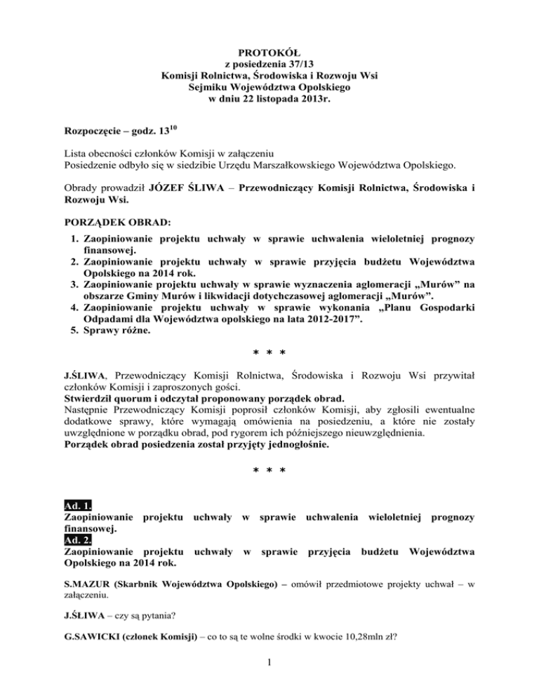 PROTOKÓŁ z posiedzenia 37/13 Komisji Rolnictwa, Środowiska i Rozwoju Wsi Sejmiku Województwa Opolskiego w dniu 22 listopada 2013r. Rozpoczęcie – godz. 1310 Lista obecności członków Komisji w załączeniu Posiedzenie odbyło się w siedzibie Urzędu Marszałkowskiego Województwa Opolskiego. Obrady prowadził JÓZEF ŚLIWA – Przewodniczący Komisji Rolnictwa, Środowiska i Rozwoju Wsi. PORZĄDEK OBRAD: 1. Zaopiniowanie projektu uchwały w sprawie uchwalenia wieloletniej prognozy finansowej. 2. Zaopiniowanie projektu uchwały w sprawie przyjęcia budŜetu Województwa Opolskiego na 2014 rok. 3. Zaopiniowanie projektu uchwały w sprawie wyznaczenia aglomeracji „Murów” na obszarze Gminy Murów i likwidacji dotychczasowej aglomeracji „Murów”. 4. Zaopiniowanie projektu uchwały w sprawie wykonania „Planu Gospodarki Odpadami dla Województwa opolskiego na lata 2012-2017”. 5. Sprawy róŜne. * * * J.ŚLIWA, Przewodniczący Komisji Rolnictwa, Środowiska i Rozwoju Wsi przywitał członków Komisji i zaproszonych gości. Stwierdził quorum i odczytał proponowany porządek obrad. Następnie Przewodniczący Komisji poprosił członków Komisji, aby zgłosili ewentualne dodatkowe sprawy, które wymagają omówienia na posiedzeniu, a które nie zostały uwzględnione w porządku obrad, pod rygorem ich późniejszego nieuwzględnienia. Porządek obrad posiedzenia został przyjęty jednogłośnie. * * * Ad. 1. Zaopiniowanie projektu uchwały w sprawie uchwalenia wieloletniej prognozy finansowej. Ad. 2. Zaopiniowanie projektu uchwały w sprawie przyjęcia budŜetu Województwa Opolskiego na 2014 rok. S.MAZUR (Skarbnik Województwa Opolskiego) – omówił przedmiotowe projekty uchwał – w załączeniu. J.ŚŁIWA – czy są pytania? G.SAWICKI (członek Komisji) – co to są te wolne środki w kwocie 10,28mln zł? 1 S.MAZUR – te środki to jakby rozliczenie budŜetów z lat poprzednich, które zostały generalnie na rachunku bankowym. G.SAWICKI – rozumiem, Ŝe to jest plan. S.MAZUR – to jest stan faktyczny. To nie wynika jakby wprost z rozliczenia roku 2013 bo wynik rozliczenia roku 2013 będzie znany dopiero w lutym 2014 roku. To są środki, które dzisiaj znajdują się na rachunku bankowym Województwa Opolskiego J.ŚLIWA – czy za miesiąc będą takie same? S.MAZUR – tak. J.ŚLIWA – czy to jest jakiś depozyt? S.MAZUR – to są środki znaczone, których nie moŜna wydać na inne cele niŜ ten, na który są przeznaczone, a dotyczą funduszu kolejowego. Po prostu w tym roku nie ma większych wydatków, a one mogą przejść na rok następny. J.ŚLIWA – czyli ktoś je juŜ naznaczył? S.MAZUR – tak. J.ŚLIWA – czy te 49,09% to stan na 30 września 2013? S.MAZUR – nie, na koniec roku. J.ŚLIWA – a skąd Pan wie, Ŝe 49,09% będzie na koniec roku? S.MAZUR – to jest oparte o przewidywane wykonanie. J.ŚLIWA – czyli to załoŜenie. S.MAZUR – tak. Oczywiście nie ma takiej moŜliwości, Ŝeby tego rodzaju dane sprawdziły się z dokładnością do 0,01%. Ta dana będzie inna, albo w górę albo w dół. J.ŚLIWA – to dlaczego za 2012 doszło do przekroczenia progu 60% zadłuŜenia skoro planujecie do 0,01%? Po całej Polsce się to rozniosło. S.MAZUR – to było wielokrotnie powtarzane, ale powtórzę raz jeszcze. Proszę zwrócić uwagę, Ŝe tutaj do 60% brakuje 11%. W tym momencie w roku 2012 przewidywane wykonanie w stosunku do tego limitu nie było na poziomie 11% tylko – o ile dobrze pamiętam – około 2%. Po prostu to załamanie się środków znaczonych było na większą skalę. Dzisiaj wykonanie dochodów na poziomie roku 397mln zł gwarantuje zmieszczenie się w tym wskaźniku 60%-owym. Te 397mln zł to jest mniej o 76mln zł w stosunku do przewidywanego wykonania. Jest Duzy margines bezpieczeństwa, którego nie było w roku 2012. G.SAWICKI – co się składa na obsługę długu? S.MAZUR – przy nowym wskaźniku długu wynoszącym 6,25% ta relacja musi być mniejsza od tego limitu 7,27%. Zwrócę jeszcze uwagę na zupełnie odwrotną logikę wzoru w stosunku do tego dotyczącego 60% progu zadłuŜenia. Przy zachowaniu stałej nadwyŜki operacyjnej im mniejsze dochody tym procent ja mam większy. Im niŜsze będzie wykonanie dochodu w roku 2013 tym poprawi mi się procent a nie pogorszy jak przy wskaźniku 60%-owym. Tam wzrost procentowy oznaczał pogorszenie się wskaźnika a tu wzrost tej składowej oznacza poprawienie się wskaźnika, bo zwiększa moŜliwy limit zadłuŜenia na rok następny. To teŜ było tłumaczone w przypadku roku 2012, Ŝe my musieliśmy mieć na uwadze nie tylko stare wskaźniki, ale takŜe wskaźnik nowy, bo bez 2 spełnienia tej relacji nie byłoby moŜliwe uchwalenie budŜetu na rok 2014. Ta relacja gwarantuje jeszcze jedną rzecz, Ŝe jeśli z tych503mln ujętych w projekcie budŜetu na rok 2014 dochodów będzie faktyczne wykonanie na poziomie 450mln – czyli wykonanie będzie poniŜej 90% - to i tak ta relacja podskoczy do poziomu około 7% ale będzie w dalszym ciągu poniŜej limitu zadłuŜenia. Tu jest odmienna sytuacja – limit zadłuŜenia nie jest zaleŜny od danego roku tylko od lat wcześniejszych. W tym nowym wskaźniku zadłuŜenia na rok 2014 jest równieŜ stosowny margines bezpieczeństwa na taką skalę w jakiej nie było go w roku 2012. G.SAWICKI – to jaka to moŜe być kwota bezpieczna? S.MAZUR – 450mln zł. G.SAWICKI – Pan mówił, Ŝe jakby było 90%. S.MAZUR – to optymizm, od 503mln odejmuję 10%. G.SAWICKI – czyli 50mln. S.MAZUR – tak. G.SAWICKI – i to jest bezpieczny poziom? S.MAZUR – tak, poniewaŜ w trakcie roku budŜetowego jak przejdziemy do poszczególnych źródeł dochodowych są takie źródła dochodowe, które rosną od 13 lat. J.ŚLIWA – czy moŜna mieć wraŜenie, Ŝe w przypadku zamian tych wskaźników, które były do tej pory do tych od 2014 jest to tylko rozluźnienie dyscypliny finansowej? S.MAZUR – nie. To jest kwestia jakby zwróceni