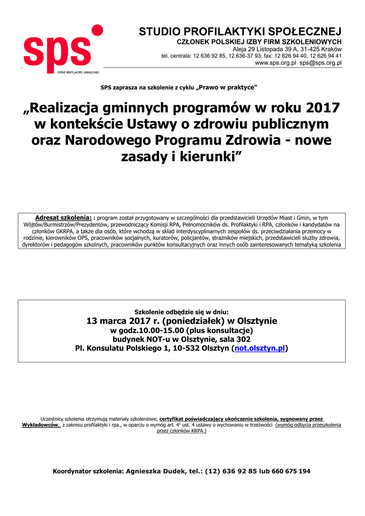 STUDIO PROFILAKTYKI SPOŁECZNEJ CZŁONEK POLSKIEJ IZBY FIRM SZKOLENIOWYCH Aleja 29 Listopada 39 A, 31-425 Kraków tel. centrala: 12 636 92 85, 12 636-37 93; fax: 12 626 94 40, 12 626 94 41 www.sps.org.pl [email protected] SPS zaprasza na szkolenie z cyklu „Prawo w praktyce” „Realizacja gminnych programów w roku 2017 w kontekście Ustawy o zdrowiu publicznym oraz Narodowego Programu Zdrowia - nowe zasady i kierunki” Adresat szkolenia: : program został przygotowany w szczególności dla przedstawicieli Urzędów Miast i Gmin, w tym Wójtów/Burmistrzów/Prezydentów, przewodniczący Komisji RPA, Pełnomocników ds. Profilaktyki i RPA, członków i kandydatów na członków GKRPA, a także dla osób, które wchodzą w skład interdyscyplinarnych zespołów ds. przeciwdziałania przemocy w rodzinie, kierowników OPS, pracowników socjalnych, kuratorów, policjantów, strażników miejskich, przedstawicieli służby zdrowia, dyrektorów i pedagogów szkolnych, pracowników punktów konsultacyjnych oraz innych osób zainteresowanych tematyką szkolenia Szkolenie odbędzie się w dniu: 13 marca 2017 r. (poniedziałek) w Olsztynie w godz.10.00-15.00 (plus konsultacje) budynek NOT-u w Olsztynie, sala 302 Pl. Konsulatu Polskiego 1, 10-532 Olsztyn (not.olsztyn.pl) Uczestnicy szkolenia otrzymują materiały szkoleniowe, certyfikat poświadczający ukończenie szkolenia, sygnowany przez Wykładowców, z zakresu profilaktyki i rpa., w oparciu o wymóg art. 41 ust. 4 ustawy o wychowaniu w trzeźwości (wymóg odbycia przeszkolenia przez członków KRPA.) Koordynator szkolenia: Agnieszka Dudek, tel.: (12) 636 92 85 lub 660 675 194 STUDIO PROFILAKTYKI SPOŁECZNEJ CZŁONEK POLSKIEJ IZBY FIRM SZKOLENIOWYCH Aleja 29 Listopada 39 A, 31-425 Kraków tel. centrala: 12 636 92 85, 12 636-37 93; fax: 12 626 94 40, 12 626 94 41 www.sps.org.pl [email protected] „Realizacja gminnych programów w roku 2017 w kontekście Ustawy o zdrowiu publicznym oraz Narodowego Programu Zdrowia - nowe zasady i kierunki”- program szkolenia: 13.03.2017 r. godz.10.00-15.00, NOT w Olsztynie godz.: 10.00-15.00 (13.00-13.30 lunch): 1. Nowelizacja ustawy o wychowaniu w trzeźwości i przeciwdziałaniu alkoholizmowi w zakresie realizacji gminnych programów profilaktyki i rozwiązywania problemów alkoholowych oraz przeciwdziałania narkomanii wynikająca z ustawy o zdrowiu publicznym. 2. Nowy tryb realizacji zadań z zakresu zdrowia publicznego wprowadzony ustawą o zdrowiu publicznym (konkurs ofert, przykłady ogłoszeń konkursowych) 3. Zadania gminy w zakresie rozwiązywania problemów alkoholowych wynikające z Narodowego Programu Zdrowia (rozporządzenie Rady Ministrów) – jak integrować gminne programy z Narodowym Programem Zdrowia - konkretne wskazówki i przykłady a) Promocja zdrowia Edukacja zdrowotna Szkolenie kadr Zadania regulacyjne i zapewnienie skutecznego egzekwowania przepisów, w tym m.in. zmniejszenie dostępności fizycznej alkoholu b) Profilaktyka, w tym zapisy NPZ dotyczące realizacji programów rekomendowanych Profilaktyka uniwersalna, Profilaktyka selektywna Profilaktyka wskazująca. c) Redukcja szkód, rehabilitacja (readaptacja, reintegracja) zdrowotna, społeczna i zawodowa 4. Obowiązek sprawozdawczości gmin z realizacji celów operacyjnych NPZ 5. Profilaktyka uniwersalna, selektywna i wskazująca opisana w Narodowym Programie Zdrowia jako zadanie dla gminy – przykłady konkretnych programów oraz omówienie bazy programów rekomendowanych. Miejsce sportu w profilaktyce. Socjoterapia jako przykład profilaktyki wskazującej. 6. Procedura zobowiązania do leczenia odwykowego - schemat postępowania, gromadzenie i ochrona danych osobowych oraz trwające prace nowelizacyjny w tym zakresie w kontekście postulatów zgłaszanych przez NIK. 15.00 Wręczenie certyfikatów ukończenia szkolenia od 15.00 Odpowiedzi na pytania i konsultacje indywidualne Koszt szkolenia: cena szkolenia wynosi 310 zł od 1 osoby i obejmuje: - poczęstunek- kawa, herbata, napoje, lunch, autorskie materiały szkoleniowe. - Uczestnicy szkolenia otrzymują materiały szkoleniowe, certyfikat poświadczający ukończenie szkolenia z zakresu profilaktyki i rpa., w oparciu o wymóg art. 41 ust. 4 ustawy o wychowaniu w trzeźwości Należność za udział w szkoleniu należy przesłać po szkoleniu, po otrzymaniu FV, w terminie 7 dni Dojazd na własny koszt. Koordynator szkolenia: Agnieszka Dudek, tel.: (12) 636 92 85 lub 660 675 194 STUDIO PROFILAKTYKI SPOŁECZNEJ CZŁONEK POLSKIEJ IZBY FIRM SZKOLENIOWYCH Aleja 29 Listopada 39 A, 31-425 Kraków tel. centrala: 12 636 92 85, 12 636-37 93; fax: 12 626 94 40, 12 626 94 41 www.sps.org.pl [email protected] …………...................................... dnia KARTA ZGŁOSZENIA UCZESTNICTWA W SZKOLENIU NAZWA FORMY DOSKONALENIA: „Realizacja gminnych programów w roku 2017 w kontekście Ustawy o zdrowiu publicznym oraz Narodowego Programu Zdrowia - nowe zasady i kierunki” TERMIN I MIEJSCE: 13.03.2017 r. budynek NOT-u w Olsztynie, sala 302, godz. 10:00-15:00 Pl. Konsulatu Polskiego 1, 10-532 Olsztyn (not.olsztyn.pl) L.p. Imię i nazwisko (dane prosimy wpisywać drukowanymi literami) Funkcja TEL. KONTAKTOWY:………...............................…………………………………………………………....................……... ADRES E-MAIL:……………………………...............................…………………………………………....................………. FAKTURĘ VAT PROSZĘ WYSTAWIĆ NA:…………..............................…………………………….....................………… ADRES:……………………………………………..............................…… NIP:............…..….….…...........................………. Wyrażam zgodę na przetwarzanie moich danych osobowych przez Studio Profilaktyki Społecznej oraz Suprema Lex CSKiS, dla potrzeb zgłoszonego szkolenia, zgodnie z ustawą z dnia 29 sierpnia 