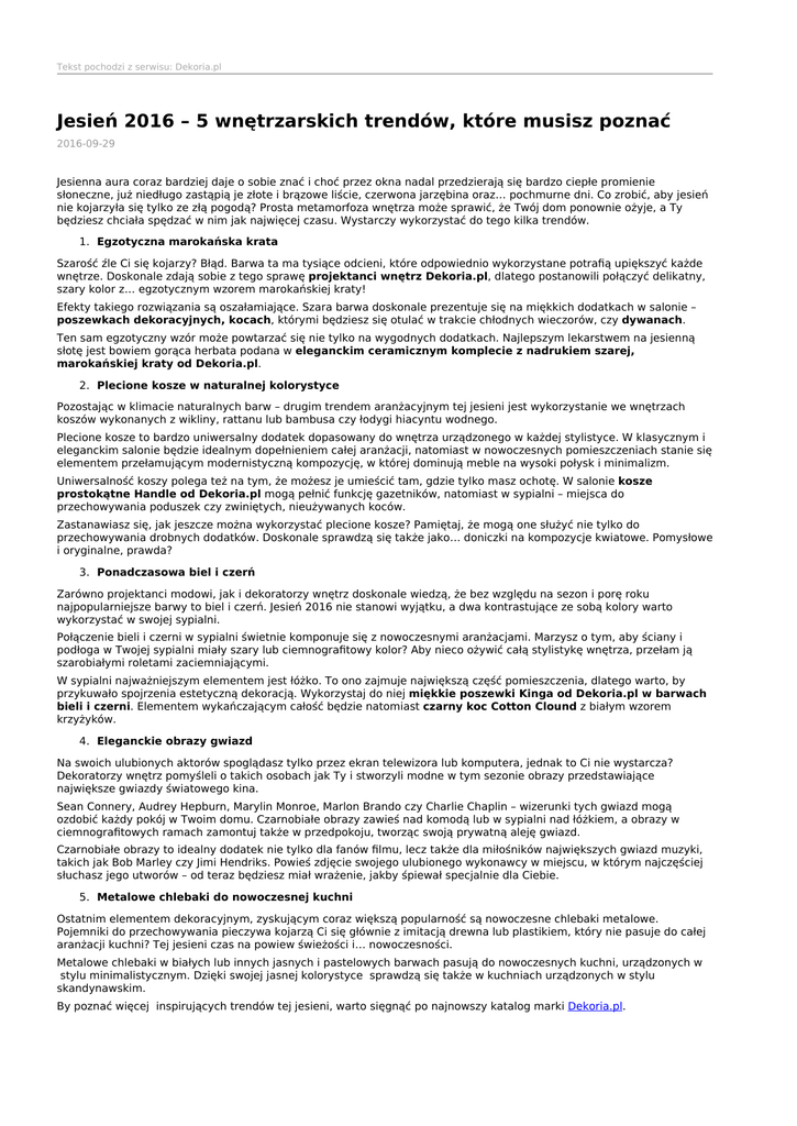 Tekst pochodzi z serwisu: Dekoria.pl Jesień 2016 – 5 wnętrzarskich trendów, które musisz poznać 2016-09-29 Jesienna aura coraz bardziej daje o sobie znać i choć przez okna nadal przedzierają się bardzo ciepłe promienie słoneczne, już niedługo zastąpią je złote i brązowe liście, czerwona jarzębina oraz… pochmurne dni. Co zrobić, aby jesień nie kojarzyła się tylko ze złą pogodą? Prosta metamorfoza wnętrza może sprawić, że Twój dom ponownie ożyje, a Ty będziesz chciała spędzać w nim jak najwięcej czasu. Wystarczy wykorzystać do tego kilka trendów. 1. Egzotyczna marokańska krata Szarość źle Ci się kojarzy? Błąd. Barwa ta ma tysiące odcieni, które odpowiednio wykorzystane potrafią upiększyć każde wnętrze. Doskonale zdają sobie z tego sprawę projektanci wnętrz Dekoria.pl, dlatego postanowili połączyć delikatny, szary kolor z… egzotycznym wzorem marokańskiej kraty! Efekty takiego rozwiązania są oszałamiające. Szara barwa doskonale prezentuje się na miękkich dodatkach w salonie – poszewkach dekoracyjnych, kocach, którymi będziesz się otulać w trakcie chłodnych wieczorów, czy dywanach. Ten sam egzotyczny wzór może powtarzać się nie tylko na wygodnych dodatkach. Najlepszym lekarstwem na jesienną słotę jest bowiem gorąca herbata podana w eleganckim ceramicznym komplecie z nadrukiem szarej, marokańskiej kraty od Dekoria.pl. 2. Plecione kosze w naturalnej kolorystyce Pozostając w klimacie naturalnych barw – drugim trendem aranżacyjnym tej jesieni jest wykorzystanie we wnętrzach koszów wykonanych z wikliny, rattanu lub bambusa czy łodygi hiacyntu wodnego. Plecione kosze to bardzo uniwersalny dodatek dopasowany do wnętrza urządzonego w każdej stylistyce. W klasycznym i eleganckim salonie będzie idealnym dopełnieniem całej aranżacji, natomiast w nowoczesnych pomieszczeniach stanie się elementem przełamującym modernistyczną kompozycję, w której dominują meble na wysoki połysk i minimalizm. Uniwersalność koszy polega też na tym, że możesz je umieścić tam, gdzie tylko masz ochotę. W salonie kosze prostokątne Handle od Dekoria.pl mogą pełnić funkcję gazetników, natomiast w sypialni – miejsca do przechowywania poduszek czy zwiniętych, nieużywanych koców. Zastanawiasz się, jak jeszcze można wykorzystać plecione kosze? Pamiętaj, że mogą one służyć nie tylko do przechowywania drobnych dodatków. Doskonale sprawdzą się także jako… doniczki na kompozycje kwiatowe. Pomysłowe i oryginalne, prawda? 3. Ponadczasowa biel i czerń Zarówno projektanci modowi, jak i dekoratorzy wnętrz doskonale wiedzą, że bez względu na sezon i porę roku najpopularniejsze barwy to biel i czerń. Jesień 2016 nie stanowi wyjątku, a dwa kontrastujące ze sobą kolory warto wykorzystać w swojej sypialni. Połączenie bieli i czerni w sypialni świetnie komponuje się z nowoczesnymi aranżacjami. Marzysz o tym, aby ściany i podłoga w Twojej sypialni miały szary lub ciemnografitowy kolor? Aby nieco ożywić całą stylistykę wnętrza, przełam ją szarobiałymi roletami zaciemniającymi. W sypialni najważniejszym elementem jest łóżko. To ono zajmuje największą część pomieszczenia, dlatego warto, by przykuwało spojrzenia estetyczną dekoracją. Wykorzystaj do niej miękkie poszewki Kinga od Dekoria.pl w barwach bieli i czerni. Elementem wykańczającym całość będzie natomiast czarny koc Cotton Clound z białym wzorem krzyżyków. 4. Eleganckie obrazy gwiazd Na swoich ulubionych aktorów spoglądasz tylko przez ekran telewizora lub komputera, jednak to Ci nie wystarcza? Dekoratorzy wnętrz pomyśleli o takich osobach jak Ty i stworzyli modne w tym sezonie obrazy przedstawiające największe gwiazdy światowego kina. Sean Connery, Audrey Hepburn, Marylin Monroe, Marlon Brando czy Charlie Chaplin – wizerunki tych gwiazd mogą ozdobić każdy pokój w Twoim domu. Czarnobiałe obrazy zawieś nad komodą lub w sypialni nad łóżkiem, a obrazy w ciemnografitowych ramach zamontuj także w przedpokoju, tworząc swoją prywatną aleję gwiazd. Czarnobiałe obrazy to idealny dodatek nie tylko dla fanów filmu, lecz także dla miłośników największych gwiazd muzyki, takich jak Bob Marley czy Jimi Hendriks. Powieś zdjęcie swojego ulubionego wykonawcy w miejscu, w którym najczęściej słuchasz jego utworów – od teraz będziesz miał wrażenie, jakby śpiewał specjalnie dla Ciebie. 5. Metalowe chlebaki do nowoczesnej kuchni Ostatnim elementem dekoracyjnym, zyskującym coraz większą popularność są nowoczesne chlebaki metalowe. Pojemniki do przechowywania pieczywa kojarzą Ci się głównie z imitacją drewna lub plastikiem, który nie pasuje do całej aranżacji kuchni? Tej jesieni czas na powiew świeżości i… nowoczesności. Metalowe chlebaki w białych lub innych jasnych i pastelowych barwach pasują do nowoczesnych kuchni, urządzonych w stylu minimalistycznym. Dzięki swojej jasnej kolorystyce sprawdzą się także w kuchniach urządzonych w stylu skandynawskim. By poznać więcej inspirujących trendów tej jesieni, warto sięgnąć po najnowszy katalog marki Dekoria.pl.