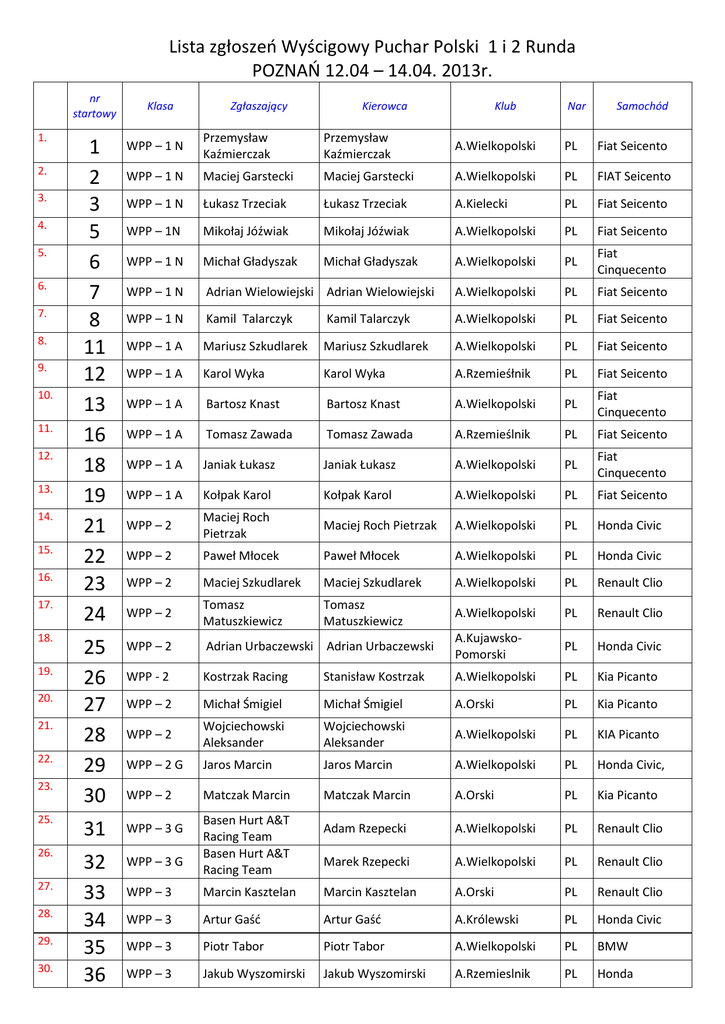 Lista zgłoszeń Wyścigowy Puchar Polski 1 i 2 Runda POZNAŃ 12.04 – 14.04. 2013r. nr startowy 1. Klasa Zgłaszający Kierowca Klub Nar Samochód 1 2 3 5 6 7 8 11 12 13 16 18 19 21 22 23 24 WPP – 1 N Przemysław Kaźmierczak Przemysław Kaźmierczak A.Wielkopolski PL Fiat Seicento WPP – 1 N Maciej Garstecki Maciej Garstecki A.Wielkopolski PL FIAT Seicento WPP – 1 N Łukasz Trzeciak Łukasz Trzeciak A.Kielecki PL Fiat Seicento WPP – 1N Mikołaj Jóźwiak Mikołaj Jóźwiak A.Wielkopolski PL Fiat Seicento WPP – 1 N Michał Gładyszak Michał Gładyszak A.Wielkopolski PL Fiat Cinquecento WPP – 1 N Adrian Wielowiejski Adrian Wielowiejski A.Wielkopolski PL Fiat Seicento WPP – 1 N Kamil Talarczyk Kamil Talarczyk A.Wielkopolski PL Fiat Seicento WPP – 1 A Mariusz Szkudlarek Mariusz Szkudlarek A.Wielkopolski PL Fiat Seicento WPP – 1 A Karol Wyka Karol Wyka A.Rzemieśłnik PL Fiat Seicento WPP – 1 A Bartosz Knast Bartosz Knast A.Wielkopolski PL Fiat Cinquecento WPP – 1 A Tomasz Zawada Tomasz Zawada A.Rzemieślnik PL Fiat Seicento WPP – 1 A Janiak Łukasz Janiak Łukasz A.Wielkopolski PL Fiat Cinquecento WPP – 1 A Kołpak Karol Kołpak Karol A.Wielkopolski PL Fiat Seicento WPP – 2 Maciej Roch Pietrzak Maciej Roch Pietrzak A.Wielkopolski PL Honda Civic WPP – 2 Paweł Młocek Paweł Młocek A.Wielkopolski PL Honda Civic WPP – 2 Maciej Szkudlarek Maciej Szkudlarek A.Wielkopolski PL Renault Clio WPP – 2 Tomasz Matuszkiewicz Tomasz Matuszkiewicz A.Wielkopolski PL Renault Clio 25 26 27 28 29 30 WPP – 2 Adrian Urbaczewski Adrian Urbaczewski A.KujawskoPomorski PL Honda Civic WPP - 2 Kostrzak Racing Stanisław Kostrzak A.Wielkopolski PL Kia Picanto WPP – 2 Michał Śmigiel Michał Śmigiel A.Orski PL Kia Picanto WPP – 2 Wojciechowski Aleksander Wojciechowski Aleksander A.Wielkopolski PL KIA Picanto WPP – 2 G Jaros Marcin Jaros Marcin A.Wielkopolski PL Honda Civic, WPP – 2 Matczak Marcin Matczak Marcin A.Orski PL Kia Picanto 25. 31 WPP – 3 G Adam Rzepecki A.Wielkopolski PL Renault Clio 26. 32 33 34 35 36 WPP – 3 G Marek Rzepecki A.Wielkopolski PL Renault Clio 2. 3. 4. 5. 6. 7. 8. 9. 10. 11. 12. 13. 14. 15. 16. 17. 18. 19. 20. 21. 22. 23. 27. 28. 29. 30. Basen Hurt A&T Racing Team Basen Hurt A&T Racing Team WPP – 3 Marcin Kasztelan Marcin Kasztelan A.Orski PL Renault Clio WPP – 3 Artur Gaść Artur Gaść A.Królewski PL Honda Civic WPP – 3 Piotr Tabor Piotr Tabor A.Wielkopolski PL BMW WPP – 3 Jakub Wyszomirski Jakub Wyszomirski A.Rzemieslnik PL Honda 31. 32. 33. 34. 35. 36. 37. 38. 39. 40. 41. 42. 43. 44. 45. 46. 47. 48. 49. 50. 51. 52. 53. 54. 55. 56. 57. 58. 59. 60. 61. 62. 63. 64. 37 38 41 42 43 44 45 46 47 48 49 304 305 306 WPP – 3 Konrad Walich Konrad Walich A.Wielkopolski PL Peugeot WPP-3 Cezary Ruszkowski Cezary Ruszkowski A.Rzemieślnik PL BMW WPP – 4 Dariusz Gałęzki Dariusz Gałęzki A.Wielkopolski PL Mitsubishi WPP – 4 Marek Wolf Marek Wolf A.Wielkopolski PL BMW WPP – 4 Wojciech Wower Wojciech Wower A.Wielkopolski PL BMW WPP – 4 Bokiej Dawid Bokiej Dawid A.Wielkopolski PL BMW WPP - 4 Jankowski Tomasz Jankowski Tomasz A.Wielkopolski PL BMW WPP -4 Piotr Iwański Piotr Iwański A. Wielkopolski PL BMW WPP -4 Mariusz Urbański Mariusz Urbański A.Wielkopolski PL BMW WPP-4 Janiński Marcin Janiński Marcin A.Wielkopolski PL BMW WPP-4 AVTek PSS Racing Team Palusko Bartosz A.Wielkopolski PL BMW WPP – 5 Mateusz Bartkowiak Mateusz Bartkowiak A.Wielkopolski PL BMW IS CUP WPP – 5 Kamil Urbaczewski Kamil Urbaczewski AKP Bydgoszcz PL BMW IS CUP Jarosław Sierakowski A.Wielkopolski PL BMW IS CUP 311 312 61 62 63 64 71 72 73 74 75 101 102 103 104 105 106 107 109 WPP – 5 Krzysztof Ratajczak A.Wielkopolski PL BMW IS CUP WPP - 5 Jarosław Sierakowski AVTek PSS 2acine Team WPP – 5 Szymon Waśkowski Szymon Waśkowski A.Wielkopolski PL BMW IS CUP WPP- 6 Łukasz Rawecki Łukasz Rawecki A.Wielkopolski PL BMW WPP – 6 Mariusz Kubiś Mariusz Kubiś A.Opolski PL Alfa Romeo WPP – 6 Robert Abramczyk Robert Abramczyk A.Wielkopolski PL BMW WPP – 6 Leszek Patan Leszek Patan A.Wielkopolski PL Honda Civic WPP – 7 Dariusz Sołtysiak Dariusz Sołtysiak A.Wielkopolski PL BMW WPP – 7 Jakub Gołębiowski Jakub Gołębiowski A.Wielkopolski PL BMW WPP – 7 Dziób Józef Dziób Józef A.Wielkopolski PL Alfa Romeo WPP – 7 Andrzej Moskalik Andrzej Moskalik A.Wielkopolski PL Lancia Delta WPP – 7 G Premium Motosport Krawczyk Piotr Poland A.Polski PL Mercedes SLS WPP – 8 Konrad Tadla Konrad Tadla A.Wielkopolski PL F-126p WPP – 8 `Kamil Osóbka Kamil Osóbka A.Wielkopolski PL F-126p WPP – 8 Chojnacki Jacek Chojnacki Jacek A.Rzemieślnik PL F-126p WPP – 8 Dawid Mrówczyński Dawid Mrówczyński A.Wielkopolski PL F-126p WPP – 8 Paweł Krakowski Paweł Krakowski A.Wielkopolski PL F-126p WPP – 8 Piotr Kowalski Piotr Kowalski A.Wielkopolski PL F-126p WPP – 8 Daniel Bachleda Daniel Bachleda A.Wielkopolski PL F-126p WPP – 8 Waldemar Waldemar A.Wielkopolski PL F-126p Mrówczyński 65. 66. 67. 68. 69. 70. 71. 72. 110 114 201 202 203 204 205 208 Mrówczyński WPP – 8 Marek Kurzętkowski Marek Kurzętkowski A.Wielkopolski PL F-126p WPP – 8 Henryk Pinis Henryk Pinis A.Częstochowski PL F-126p WPP – 8 Christophe Carion Christophe Carion A.Wielkopolski PL F-126p WPP – 8 Patryk Burchard Patryk Burchard A.Rzemieślnik PL F-126p WPP –8 Sławomir Wysmyk Sławomir Wysmyk MKM „Kometa”Łódź PL F-126p WPP – 8 Cattani Polska Piotr Jankowiak A.Wielkopolski PL F-126p WPP – 8 Jarosław Hercog Jarosław Hercog AK Częstochowa PL F-126p WPP – 8 Grzegorz Karczewski Grzegorz Karczewski A.Wielkopolski PL F-126p