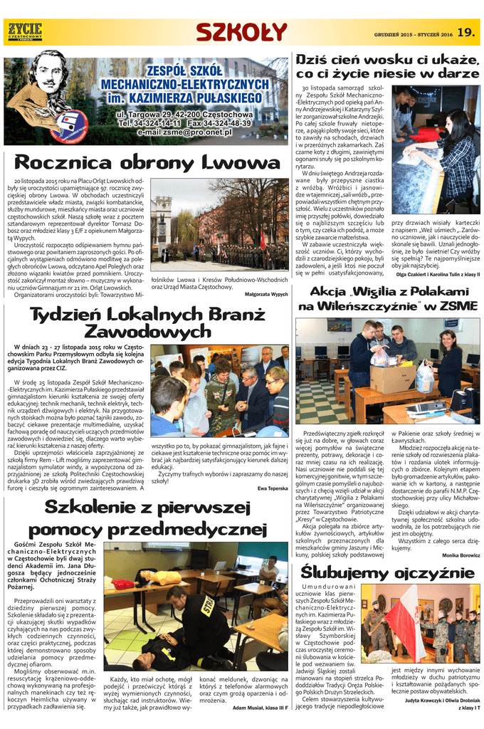GRUDZIEŃ 2015 – STYCZEŃ 2016 19. Dziś cień wosku ci ukaże, co ci życie niesie w darze Rocznica obrony Lwowa 20 listopada 2015 roku na Placu Orląt Lwowskich odbyły się uroczystości upamiętniające 97. rocznicę zwycięskiej obrony Lwowa. W obchodach uczestniczyli przedstawiciele władz miasta, związki kombatanckie, służby mundurowe, mieszkańcy miasta oraz uczniowie częstochowskich szkół. Naszą szkołę wraz z pocztem sztandarowym reprezentował dyrektor Tomasz Dobosz oraz młodzież klasy 3 E/F z opiekunem Małgorzatą Wypych. Uroczystość rozpoczęto odśpiewaniem hymnu państwowego oraz powitaniem zaproszonych gości. Po oficjalnych wystąpieniach odmówiono modlitwę za poległych obrońców Lwowa, odczytano Apel Poległych oraz złożono wiązanki kwiatów przed pomnikiem. Uroczystość zakończył montaż słowno – muzyczny w wykonaniu uczniów Gimnazjum nr 21 im. Orląt Lwowskich. Organizatorami uroczystości byli: Towarzystwo Mi- łośników Lwowa i Kresów Południowo-Wschodnich oraz Urząd Miasta Częstochowy. Małgorzata Wypych Tydzień Lokalnych Branż Zawodowych 30 listopada samorząd szkolny Zespołu Szkół Mechaniczno-Elektrycznych pod opieką pań Anny Andrzejewskiej i Katarzyny Szyller zorganizował szkolne Andrzejki. Po całej szkole fruwały nietoperze, a pająki plotły swoje sieci, które to zawisły na schodach, drzwiach i w przeróżnych zakamarkach. Zaś czarne koty z długimi, zawiniętymi ogonami snuły się po szkolnym korytarzu. W dniu świętego Andrzeja rozdawane były przepyszne ciastka z wróżbą. Wróżbici i jasnowidze w tajemniczej „sali wróżb „ przepowiadali wszystkim chętnym przyszłość. Wielu z uczestników poznało imię przyszłej połówki, dowiedziało się o najbliższym szczęściu lub o tym, czy czeka ich podróż, a może szybkie zawarcie małżeństwa. W zabawie uczestniczyła większość uczniów. Ci, którzy wychodzili z czarodziejskiego pokoju, byli zadowoleni, a jeśli ktoś nie poczuł się w pełni usatysfakcjonowany, przy drzwiach wisiały karteczki z napisem „Weź uśmiech „. Zarówno uczniowie, jak i nauczyciele doskonale się bawili. Uznali jednogłośnie, że było świetnie! Czy wróżby się spełnią? Te najpomyślniejsze oby jak najszybciej. Olga Czakiert i Karolina Tulin z klasy II Akcja „Wigilia z Polakami na Wileńszczyźnie” w ZSME W dniach 23 - 27 listopada 2015 roku w Częstochowskim Parku Przemysłowym odbyła się kolejna edycja Tygodnia Lokalnych Branż Zawodowych organizowana przez CIZ. W środę 25 listopada Zespół Szkół Mechaniczno-Elektrycznych im. Kazimierza Pułaskiego przedstawiał gimnazjalistom kierunki kształcenia ze swojej oferty edukacyjnej: technik mechanik, technik elektryk, technik urządzeń dźwigowych i elektryk. Na przygotowanych stoiskach można było poznać tajniki zawodu, zobaczyć ciekawe prezentacje multimedialne, uzyskać fachową poradę od nauczycieli uczących przedmiotów zawodowych i dowiedzieć się, dlaczego warto wybierać kierunki kształcenia z naszej oferty. Dzięki uprzejmości właściciela zaprzyjaźnionej ze szkołą firmy Rem - Lift mogliśmy zaprezentować gimnazjalistom symulator windy, a wypożyczona od zaprzyjaźnionej ze szkołą Politechniki Częstochowskiej drukarka 3D zrobiła wśród zwiedzających prawdziwą furorę i cieszyła się ogromnym zainteresowaniem. A wszystko po to, by pokazać gimnazjalistom, jak fajne i ciekawe jest kształcenie techniczne oraz pomóc im wybrać jak najbardziej satysfakcjonujący kierunek dalszej edukacji. Życzymy trafnych wyborów i zapraszamy do naszej szkoły! Ewa Teperska Szkolenie z pierwszej pomocy przedmedycznej Gośćmi Zespołu Szkół Mechaniczno-Elektrycznych w Częstochowie byli dwaj studenci Akademii im. Jana Długosza będący jednocześnie członkami Ochotniczej Straży Pożarnej. Przeprowadzili oni warsztaty z dziedziny pierwszej pomocy. Szkolenie składało się z prezentacji ukazującej skutki wypadków czyhających na nas podczas zwykłych codziennych czynności, oraz części praktycznej, podczas której demonstrowano sposoby udzielania pomocy przedmedycznej ofiarom. Mogliśmy obserwować m.in. resuscytację krążeniowo-oddechową wykonywaną na profesjonalnych manekinach czy też rękoczyn Heimlicha używany w przypadkach zadławienia się. Przedświąteczny zgiełk rozkręcił się już na dobre, w głowach coraz więcej pomysłów na świąteczne prezenty, potrawy, dekoracje i coraz mniej czasu na ich realizację. Nasi uczniowie nie poddali się tej komercyjnej gonitwie, w tym szczególnym czasie pomyśleli o najuboższych i z chęcią wzięli udział w akcji charytatywnej „Wigilia z Polakami na Wileńszczyźnie” organizowanej przez Towarzystwo Patriotyczne „Kresy” w Częstochowie. Akcja polegała na zbiórce artykułów żywnościowych, artykułów szkolnych przeznaczonych dla mieszkańców gminy Jaszuny i Mickuny, polskiej szkoły podstawowej w Pakienie oraz szkoły średniej w Ławryszkach. Młodzież rozpoczęła akcję na terenie szkoły od rozwieszenia plakatów i rozdania ulotek informujących o zbiórce. Kolejnym etapem było gromadzenie artykułów, pakowanie ich w kartony, a następnie dostarczenie do parafii N.M.P. Częstochowskiej przy ulicy Michałowskiego. Dzięki udziałowi w akcji charytatywnej społeczność szkolna udowodniła, że los potrzebujących nie jest im obojętny. Wszystkim z całego serca dziękujemy. Monika Borowicz Ślubujemy ojczyźnie Każdy, kto miał ochotę, mógł podejść i przećwiczyć którąś z wyżej wymienionych czynności, słuchając rad instruktorów. Wiemy już także, jak prawidłowo wy- konać meldunek, dzwoniąc na któryś z telefonów alarmowych oraz czym grożą oparzenia i odmrożenia. Adam Musiał, klasa III F Umundurowani uczniowie klas pierwszych Zespołu Szkół Mechaniczno-Elektrycznych im. Kazimierza Pułaskiego wraz z młodzieżą Zespołu Szkół im. Wisławy Szymborskiej w Częstochowie podczas