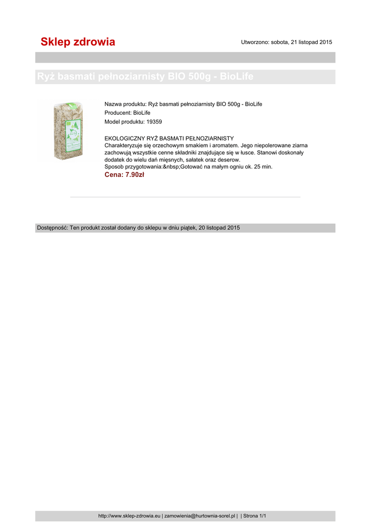 Ry¿ basmati pe³noziarnisty BIO 500g - BioLife - sklep