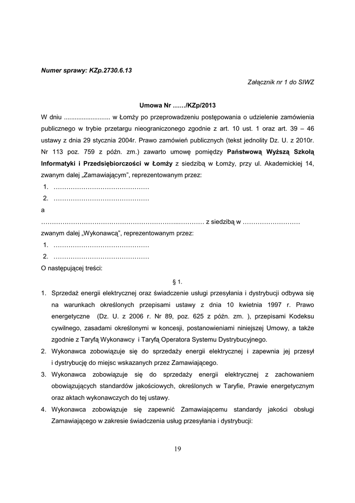 Numer sprawy: KZp.2730.6.13 Załącznik nr 1 do SIWZ Umowa Nr ……/KZp/2013 W dniu .......................... w Łomży po przeprowadzeniu postępowania o udzielenie zamówienia publicznego w trybie przetargu nieograniczonego zgodnie z art. 10 ust. 1 oraz art. 39 – 46 ustawy z dnia 29 stycznia 2004r. Prawo zamówień publicznych (tekst jednolity Dz. U. z 2010r. Nr 113 poz. 759 z późn. zm.) zawarto umowę pomiędzy Państwową Wyższą Szkołą Informatyki i Przedsiębiorczości w Łomży z siedzibą w Łomży, przy ul. Akademickiej 14, zwanym dalej „Zamawiającym”, reprezentowanym przez: 1. ……………………………………… 2. ……………………………………… a ………………………………………………………..………… z siedzibą w ……………………… zwanym dalej „Wykonawcą”, reprezentowanym przez: 1. ……………………………………… 2. ……………………………………… O następującej treści: § 1. 1. Sprzedaż energii elektrycznej oraz świadczenie usługi przesyłania i dystrybucji odbywa się na warunkach określonych przepisami ustawy z dnia 10 kwietnia 1997 r. Prawo energetyczne (Dz. U. z 2006 r. Nr 89, poz. 625 z późn. zm. ), przepisami Kodeksu cywilnego, zasadami określonymi w koncesji, postanowieniami niniejszej Umowy, a także zgodnie z Taryfą Wykonawcy i Taryfą Operatora Systemu Dystrybucyjnego. 2. Wykonawca zobowiązuje się do sprzedaży energii elektrycznej i zapewnia jej przesył i dystrybucję do miejsc wskazanych przez Zamawiającego. 3. Wykonawca zobowiązuje się do sprzedaży energii elektrycznej z zachowaniem obowiązujących standardów jakościowych, określonych w Taryfie, Prawie energetycznym oraz aktach wykonawczych do tej ustawy. 4. Wykonawca zobowiązuje się zapewnić Zamawiającemu standardy jakości obsługi Zamawiającego w zakresie świadczenia usług przesyłania i dystrybucji: 19 a) przyjmowania od Zamawiającego, przez całą dobę, zgłoszeń i reklamacji dotyczących dostarczania energii elektrycznej z sieci; b) bezzwłocznego przystąpienia do usuwania zakłóceń w dostarczaniu energii elektrycznej, spowodowanych nieprawidłową pracą sieci; c) udzielania Zamawiającemu, na jego żądanie, informacji o przewidywanym terminie wznowienia dostarczania energii elektrycznej przerwanego z powodu awarii w sieci; d) nieodpłatnego udzielania informacji w sprawie rozliczeń oraz aktualnych taryf i zmian przepisów prawa powszechnie obowiązującego w zakresie objętym umową; e) rozpatrywania wniosków lub reklamacji Zamawiającego w sprawie rozliczeń i udzielania odpowiedzi, nie później niż w terminie 14 dni od dnia złożenia wniosku lub zgłoszenia reklamacji; f) powiadamiania Zamawiającego o terminach i czasie planowanych przerw w dostawie energii elektrycznej §2 Strony zgodnie postanawiają iż okres wykonania usługi jest w czasookresie : od dnia podpisania umowy do 31.05.2014 r. z zastrzeżeniem iż świadczenie usługi na poszczególnych obiektach rozpocznie się od: 1) …………………-Budynek PWSIiP w Łomży - Akademicka 14 2) ……………….. - Budynek ITŻ w Łomży - Ul. Akademicka 14 3) ……………….. - Budynek ASP przy PWSIP w Łomży - Ul. Wiejska 14 4) ……………….. - Budynek DS - Ul. Wiejska 16A §3 1. Wynagrodzenie za dostarczoną energię elektryczną płatne będzie według cen zawartych w ofercie, niezmiennych w okresie trwania umowy (za wyjątkiem sytuacji opisanych w § 4 umowy) oraz cen i stawek opłat z tytułu dystrybucji energii elektrycznej zgodnie z obowiązującą w danym okresie Taryfą OSD. 2. Rozliczenia za sprzedaną energie elektryczną i świadczone usługi dystrybucji przeprowadza się zgodnie z zawartą umową oraz odpowiednio taryfą OSD. 3. Rozliczenie za dostarczoną energię i usługę dystrybucji odbywać się będzie zgodnie z rozliczeniami stosowanymi przez OSD na podstawie odczytów liczników poboru energii elektrycznej. 20 4. Należność za energię elektryczną oraz z tytułu dystrybucji energii elektrycznej regulowana będzie na podstawie prawidłowo wystawionej faktury VAT przez Wykonawcę za dany okres rozliczeniowy. 5. Do faktury Wykonawca dołączy załącznik, w którym wyspecyfikuje koszty dostarczonej energii dla każdego układu pomiarowo - rozliczeniowego. 6. Faktury będą płatne przelewem przez Zamawiającego na konto Wykonawcy wskazane w fakturze, w terminie do 21 dni od dnia jej wystawienia przez Wykonawcę wraz z załącznikiem, o którym mowa w pkt 5 pod warunkiem, że faktura wpłynie do Zamawiającego nie później niż 14 dni przed upływem terminu płatności. W przypadku opóźnień w dostarczeniu do Zamawiającego wystawionej faktury, termin płatności ulegnie przesunięciu o liczbę dni opóźnienia. 7. W przypadku rozbieżności pomiędzy terminem płatności wskazanym w fakturach a wskazanych w niniejszej umowie przyjmuje się, że obowiązującym terminem płatności jest termin wskazany w umowie. 8. W przypadku stwierdzenia błędów w pomiarze lub odczycie wskazań układu pomiarowo – rozliczeniowego, które spowodowały zawyżenie lub zaniżenie należności za pobraną energię elektryczną Wykonawca dokonuje korekty uprzednio wystawionej faktury według obowiązujących przepisów w zakresie dokonywania korekty faktur. §4 1. Zamawiający przewiduje możliwość zmiany istotnych postanowień zawartej umowy w stosunku do treści oferty, na podstawie której dokonano wyboru Wykonawcy w wypadku: 1.1 zmiany przepisów Prawa energetycznego lub wydanych na tej podstawie przepisów wykonawczych mających zastosowanie do Umowy, w tej sytuacji postanowienia Umowy sprzeczne z nimi stracą ważność zaś w ich miejsce będą miały zastosowanie przepisy znowelizowanego prawa, 1.2 zmiany (wprowadzenia nowej) Instrukcji Ruchu i Eksploatacji Sieci Rozdzielczej (Dystrybucyjnej) OSD, 1.3 zmiany organów uprawnionych do reprezentacji zarówno Zamawiającego ja