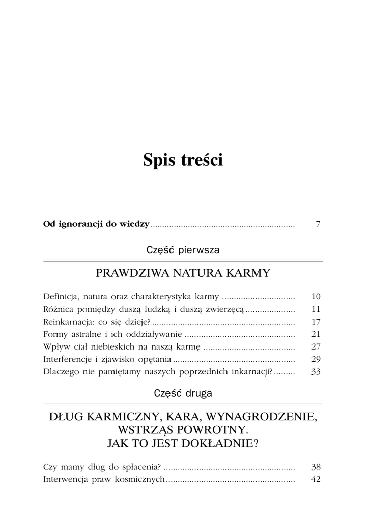Spis treści Od ignorancji do wiedzy .............................................................. 7 Czêæ pierwsza PRAWDZIWA NATURA KARMY Definicja, natura oraz charakterystyka karmy ............................... Ró¿nica pomiêdzy dusz¹ ludzk¹ i dusz¹ zwierzêc¹ ..................... Reinkarnacja: co siê dzieje? ............................................................. Formy astralne i ich oddzia³ywanie ............................................... Wp³yw cia³ niebieskich na nasz¹ karmê ....................................... Interferencje i zjawisko opêtania .................................................... Dlaczego nie pamiêtamy naszych poprzednich inkarnacji? ......... 10 11 17 21 27 29 33 Czêæ druga DŁUG KARMICZNY, KARA, WYNAGRODZENIE, WSTRZĄS POWROTNY. JAK TO JEST DOKŁADNIE? Czy mamy d³ug do sp³acenia? ........................................................ Interwencja praw kosmicznych ....................................................... 38 42 $ KARMA i REINKARNACJA. Nowe objanienia Ró¿ne rodzaje wstrz¹su powrotnego ............................................. Niewiarygodne konsekwencje zjawiska karmicznego .................. Opónione wstrz¹sy powrotne ....................................................... Pozytywne manifestacje karmy ....................................................... 55 56 74 79 Czêæ trzecia NASZE ZDROWIE – NASTĘPSTWO KARMICZNE? ród³o naszych chorób .................................................................... Ró¿norodne przyczyny karmiczne .................................................. Czy istniej¹ aberracje karmiczne? ................................................... Nieszczêliwe wypadki: rezultat przypadku? ................................. Co nale¿y czyniæ, aby cieszyæ siê dobrym zdrowiem? ................ 86 91 93 99 104 Czêæ czwarta PRZEZNACZENIE – PRZYPADEK CZY WOLNOŚĆ? Jak ¿yæ ze swoj¹ karm¹? .................................................................. Czy mo¿na zmodyfikowaæ karmê? ................................................. Jaka jest nasza czêæ wolnoci? ...................................................... 108 111 111