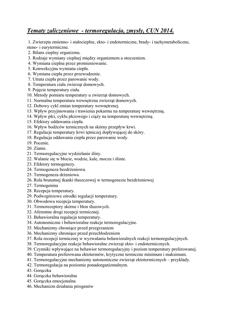Tematy zaliczeniowe - termoregulacja, zmysły, CUN 2014.