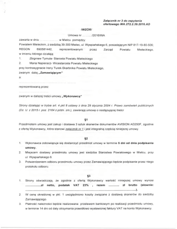 Załącznik nr 3 do zapytania ofertowego WA.272.2.39.2016.AD łWZÓRI Umowa n r .........../2016/WA zawarta w d niu......................w Mielcu pomiędzy: Powiatem Mieleckim, z siedzibą 39-300 Mielec, ul. Wyspiańskiego 6, posiadającym NIP 817-19-80-506; REGON 690581442, reprezentowanym przez Zarząd Powiatu Mieleckiego, w imieniu którego działają: 1. Zbigniew Tymuła- Starosta Powiatu Mieleckiego 2. Maria Napieracz- Wicestarosta Powiatu Mieleckiego przy kontrasygnacie Ireny Turek-Skarbnika Powiatu Mieleckiego, zwanym dalej „Zamawiającym” a: reprezentowaną przez: zwanym w dalszej treści umowy „Wykonawcą” Strony działając w trybie art. 4 pkt 8 ustawy z dnia 29 stycznia 2004 r. Prawo zamówień publicznych (Dz. U. z 2015 r. poz. 2164 z późn. zm.), zawierają umowę o następującej treści §1 Przedmiotem umowy jest zakup i dostawa 3 sztuk skanerów dokumentów AVISION AD250F, zgodnie z ofertą Wykonawcy, która stanowi załącznik nr 1 i jest integralną częścią niniejszej umowy. §2 1. Wykonawca zobowiązuje się dostarczyć przedmiot umowy w terminie 5 dni od dnia podpisania umowy. 2. Miejscem dostawy przedmiotu umowy jest siedziba Starostwa Powiatowego w Mielcu, przy ul. Wyspiańskiego 6. 3. Potwierdzeniem odbioru przedmiotu umowy przez Zamawiającego będzie podpisanie przez niego protokołu odbioru. §3 1. Strony oświadczają, że zgodnie z ofertą Wykonawcy wartość niniejszej umowy wynosi .................. zł netto, podatek VAT 23% , razem ............ zł brutto (słownie: ........................................................................................................................... )• 2. W cenę określonej w pkt. 1 uwzględniono koszty związane z dostawą skanerów do siedziby Zamawiającego. 3. Płatność należności będzie realizowana przelewem bankowym po realizacji przedmiotu umowy, w terminie 14 dni od daty otrzymania prawidłowo wystawionej faktury VAT na konto Wykonawcy. 4. Rozliczenie i zapłata wynagrodzenia za przedmiot umowy dokonana będzie na podstawie protokołu odbioru podpisanego bez zastrzeżeń przez Zamawiającego i Wykonawcę. 5. Jako datę zapłaty faktury rozumie się datę obciążenia rachunku Zamawiającego. 6. Za każdy dzień opóźnienia w zapłacie wynagrodzenia Wykonawca może żądać od Zamawiającego odsetek ustawowych. §4 Osobami uprawnionymi do reprezentowania stron w trakcie realizacji umowy są: - po stronie Zamawiającego: Pan Piotr Hnat, tel. 17 78 00 432, e-mail: [email protected] - po stronie Wykonawcy:.................................... . tel.........................................e-mail:......................... §5 1. Wykonawca oświadcza, że towar oferowany Zamawiającemu jest wolny od wad fizycznych i prawnych oraz spełnia wszelkie normy jakościowe i techniczne stawiane takim wyrobom przez prawo polskie. 2. Przedmiot umowy objęty jest 24 miesięczną gwarancją. 3. Okres gwarancji liczony jest od dnia podpisania protokołu odbioru przez Zamawiającego bez zastrzeżeń. 4. Niezależnie od uprawnień przysługujących Zamawiającemu z tytułu udzielonej gwarancji, Zamawiającemu przysługują uprawnienia z tytułu rękojmi za wady fizyczne i prawne. 5. Wykonawca zobowiązuje się do świadczenia serwisu gwarancyjnego w oparciu o gwarancję producenta. 6. Zgłoszenie awarii lub innej nieprawidłowości w działaniu urządzenia następuje telefonicznie na nr .......................... lub pisemnie drogą elektroniczną na adres e-mail:........................ 7. W ramach gwarancji Wykonawca zobowiązuje się, działając na swój koszt i ryzyko do naprawy lub wymiany reklamowanego towaru, w tym do jego transportu z i do siedziby Zamawiającego. 8. Wykonawca przystąpi do naprawy reklamowanego towaru stanowiącego przedmiot umowy w terminie nie dłuższym niż 5 dni roboczych od dnia otrzymania przez Wykonawcę zgłoszenia, a naprawa zostanie zakończona w terminie do 21 dni kalendarzowych od dnia odbioru reklamowanego towaru. 9. Okres gwarancji przedłuża się o czas naprawy sprzętu. 10. W przypadku niemożliwości usunięcia zgłoszonych wad przedmiotu umowy, lub przekroczenia terminów o których mowa w pkt 8 niniejszego paragrafu Wykonawca jest zobowiązany do bezpłatnej wymiany sprzętu na nowy o takich samych lub wyższych parametrach technicznych, uzgodnionych z Zamawiającym, w miejsce sprzętu uszkodzonego. 11. W przypadku wymiany na nowy sprzęt okres gwarancji biegnie na nowo i liczony jest od daty odbioru nowego sprzętu. §6 Strony zastrzegają kary umowne w następujących wypadkach i wysokościach: 1) Wykonawca może zapłacić Zamawiającemu karę umowną: a) za opóźnienie w wykonaniu przedmiotu umowy - w wysokości 5 % wynagrodzenia umownego brutto określonego w §3 należnego za wykonanie zamówienia za każdy dzień opóźnienia, b) za opóźnienie w usunięciu wad stwierdzonych w okresie gwarancji i rękojmi - w wysokości 0,2 % wynagrodzenia umownego brutto określonego w §3 za każdy dzień opóźnienia liczonego od dnia wyznaczonego na usunięcie wad, c) za odstąpienie od umowy z przyczyn zależnych od Wykonawcy w wysokości 25 % wynagrodzenia umownego brutto określonego w §3 . 2) Zamawiający za zwłokę w zapłacie faktury zapłaci Wykonawcy odsetki w wysokości odsetek ustawowych za opóźnienie w transakcjach handlowych. 3) Roszczenia o zapłatę należnych kar umownych nie będą pozbawiać Zamawiającego prawa żądania odszkodowania uzupełniającego na zasadach ogólnych, jeżeli wysokość ewentualnej szkody przekroczy wysokość zastrzeżonej kary umownej. 4) Termin zapłaty kary umownej wynosi 5 dni roboczych od dnia skutecznego doręczenia Stronie wezwania do zapłaty. W razie opóźnienia z zapłatą kary umownej Strona uprawniona do otrzymania kary umownej może żądać odsetek ustawowych za każdy dzień opóźnienia. 5) Wykonawca nie może zbywać na rzecz osób trzecich wierzytelności powstałych w wyniku realizacji niniejszej umowy 