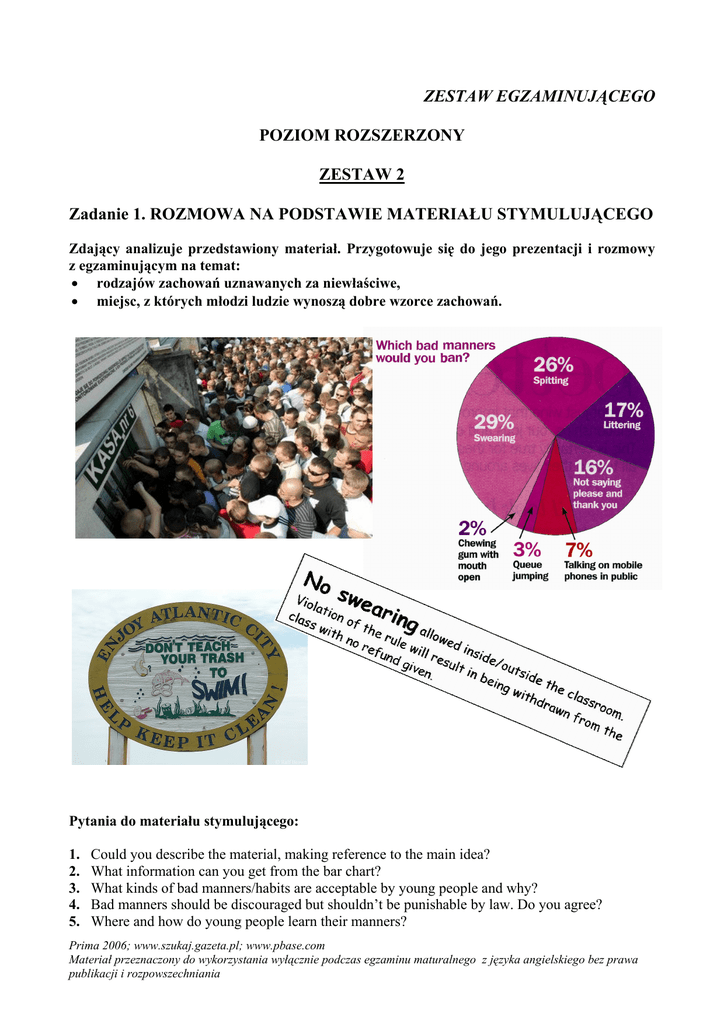 ZESTAW EGZAMINUJĄCEGO POZIOM ROZSZERZONY ZESTAW 2 Zadanie 1. ROZMOWA NA PODSTAWIE MATERIAŁU STYMULUJĄCEGO Zdający analizuje przedstawiony materiał. Przygotowuje się do jego prezentacji i rozmowy z egzaminującym na temat: • rodzajów zachowań uznawanych za niewłaściwe, • miejsc, z których młodzi ludzie wynoszą dobre wzorce zachowań. Pytania do materiału stymulującego: 1. 2. 3. 4. 5. Could you describe the material, making reference to the main idea? What information can you get from the bar chart? What kinds of bad manners/habits are acceptable by young people and why? Bad manners should be discouraged but shouldn’t be punishable by law. Do you agree? Where and how do young people learn their manners? Prima 2006; www.szukaj.gazeta.pl; www.pbase.com Materiał przeznaczony do wykorzystania wyłącznie podczas egzaminu maturalnego z języka angielskiego bez prawa publikacji i rozpowszechniania ZESTAW EGZAMINUJĄCEGO POZIOM ROZSZERZONY ZESTAW 2 Zadanie 2. PREZENTACJA TEMATU I DYSKUSJA Zdający zapoznaje się z podanymi tematami. Wybiera jeden i przygotowuje się do jego 2-3 minutowej prezentacji oraz dyskusji z egzaminującym. 1. Will the increasing popularity of digital media inevitably lead to the demise of traditional paper media as the main source of information and entertainment? Express your views. 2. To what extent do you agree with the statement: “England and America are two countries separated by a common language” (G.B. Shaw)? Justify your opinion. Materiał przeznaczony do wykorzystania wyłącznie podczas egzaminu maturalnego z języka angielskiego bez prawa publikacji i rozpowszechniania