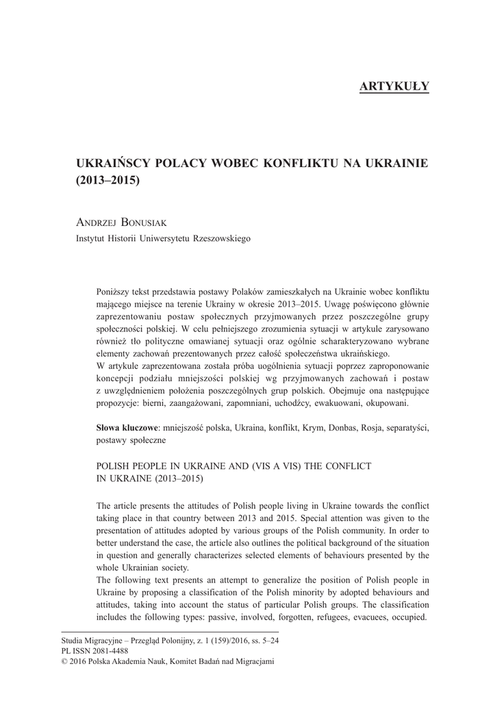 ARTYKUŁY UKRAIŃSCY POLACY WOBEC KONFLIKTU NA UKRAINIE (2013–2015) ANDRZEJ BONUSIAK Instytut Historii Uniwersytetu Rzeszowskiego Poniższy tekst przedstawia postawy Polaków zamieszkałych na Ukrainie wobec konfliktu mającego miejsce na terenie Ukrainy w okresie 2013–2015. Uwagę poświęcono głównie zaprezentowaniu postaw społecznych przyjmowanych przez poszczególne grupy społeczności polskiej. W celu pełniejszego zrozumienia sytuacji w artykule zarysowano również tło polityczne omawianej sytuacji oraz ogólnie scharakteryzowano wybrane elementy zachowań prezentowanych przez całość społeczeństwa ukraińskiego. W artykule zaprezentowana została próba uogólnienia sytuacji poprzez zaproponowanie koncepcji podziału mniejszości polskiej wg przyjmowanych zachowań i postaw z uwzględnieniem położenia poszczególnych grup polskich. Obejmuje ona następujące propozycje: bierni, zaangażowani, zapomniani, uchodźcy, ewakuowani, okupowani. Słowa kluczowe: mniejszość polska, Ukraina, konflikt, Krym, Donbas, Rosja, separatyści, postawy społeczne POLISH PEOPLE IN UKRAINE AND (VIS A VIS) THE CONFLICT IN UKRAINE (2013–2015) The article presents the attitudes of Polish people living in Ukraine towards the conflict taking place in that country between 2013 and 2015. Special attention was given to the presentation of attitudes adopted by various groups of the Polish community. In order to better understand the case, the article also outlines the political background of the situation in question and generally characterizes selected elements of behaviours presented by the whole Ukrainian society. The following text presents an attempt to generalize the position of Polish people in Ukraine by proposing a classification of the Polish minority by adopted behaviours and attitudes, taking into account the status of particular Polish groups. The classification includes the following types: passive, involved, forgotten, refugees, evacuees, occupied. Studia Migracyjne – Przegląd Polonijny, z. 1 (159)/2016, ss. 5–24 PL ISSN 2081-4488 © 2016 Polska Akademia Nauk, Komitet Badań nad Migracjami 6 Andrzej Bonusiak Keywords: Polish minority, Ukraine, conflict, Crimea, the Donbass, Russia, separatists, social attitudes Powstanie niepodległej Ukrainy rozbudziło nadzieje jej mieszkańców na szybkie wyjście z kryzysu. Liczono na europeizację kraju, poprawę sytuacji życiowej i perspektyw ludności. Niestety, w istocie rzeczy nowopowstałemu państwu nie udało się rozwiązać żadnego z odziedziczonych problemów, co więcej pojawiło się szereg innych. Niewątpliwie czynnikami wpływającymi na taką sytuację były m.in. marazm społeczny, brak społeczeństwa obywatelskiego i słabość elit. Realnie szansa na zmianę tego stanu rzeczy pojawiła się trzykrotnie. Pierwszy raz w 1991 r., kiedy to na drodze referendum zatwierdzono deklarację niepodległości1, drugi raz w dobie pomarańczowej rewolucji (2004)2 oraz trzeci raz w okresie 1 Referendum odbyło się 1.12.1991 r. Na pytanie: „Czy zgadza się Pan /Pani z Aktem ogłoszenia niepodległości Ukrainy?” ponad 90% głosujących odpowiedziało „tak”. Głosowanie było poprzedzone zmianami politycznymi w ZSRR oraz przeobrażeniami społeczno-politycznymi i gospodarczymi doby Michaiła Gorbaczowa. Ich rezultatem było powstanie na terenach Ukrainy (i w pozostałych republikach radzieckich) opozycji dążącej najpierw do przebudowy państwa, a następnie do suwerenności, por.: A. Chojnowski (1997), Ukraina, Warszawa: Wydawnictwo „Trio”, s. 201–203 i nast.; J. Darski (1993), Ukraina. Historia, współczesność, konflikty narodowe, Warszawa: Instytut Polityczny, s. 30–36 i nast.; J. Hrycak (2000), Historia Ukrainy, 1772–1999. Narodziny nowoczesnego narodu, Lublin: Instytut Europy Środkowo-Wschodniej, s. 310–322; A.J. Madera (2000), Między Rosją a Europą. Ukraina na rozdrożu, Rzeszów: Firma SAS Wanda Tarnawska, s. 40–41, 51, 68–74; Ukraina /15-lecie ukraińskiej niepodległości, http://www.psz. pl/162-wschod/ukraina-15-lecie-ukrainskiej-niepodleglosci [data dostępu: 27.06.2015]. 2 Przez to pojęcie rozumie się masowe protesty społeczne mające miejsce w okresie pomiędzy II turą wyborów prezydenckich a zaprzysiężeniem na stanowisko prezydenta W. Juszczenki (od 21.11.2004 r. do 23.01.2005 r.). Rozpoczęto je na wezwanie liderów opozycji W. Juszczenki i J. Tymoszenko, po ogłoszeniu zwycięstwa W. Janukowycza, kiedy okazało się, że oficjalne dane odbiegają od realnych o ponad 10%. Ostatecznie w wyniku mediacji międzynarodowej oraz rozmów wewnętrznych doprowadzono do porozumienia i powtórki II tury wyborów. Niestety, choć władzę objął kandydat opozycji, doszło do rozpadu bloku „pomarańczowej koalicji”. Zaniechano reform ekonomicznych i postulowanego zbliżenia z Europą, co doprowadziło do sukcesu W. Janukowycza w kolejnych wyborach prezydenckich i odejścia od idei zrywu, por.: A. Górska (2005), Dokąd zmierzasz Ukraino?, „Punkt Widzenia”, Warszawa: Ośrodek Studiów Wschodnich (dalej: OSW), s. 5–6, 9 i nast.; J. Hrycak (2009), Re: Birth of Ukraine, w: J. Hrycak, Nowa Ukraina. Nowe interpretacje, Wrocław: Kolegium Europy Wschodniej, s. 177–197; J. Konieczna (2005), Pomarańczowa rewolucja na Ukrainie. Próba zrozumienia przyczyn, „Prace”, nr 18, Warszawa: OSW, s. 5–17; S. Matuszczak, A. Sarna (2013), Od stabilizacji do stagnacji. Próby reform Wiktora Janukowycza, „Punkt Widzenia”, Warszawa: OSW, s. 9; M. Wojciechowski (2006), Pomarańczowy majdan, Warszawa: Wydawnictwo W.A.B., s. 5–333; M. Ziółkowski (2008), Projekt: Ukraina, Wrocław: Kolegium Europy Wschodniej, s. 68–76, 92–131; Pomarańczowa rewolucja –Ukraina spogląda w stronę wolności, http://www.polskieradio.pl/39/156/Artykul/1294703,Pomaranczowarewolucja-Ukraina-spoglada-w-strone-wolnosci [data dostępu: 27.07.2015]. Ukraińscy Polacy wobec konfliktu na Ukrainie (2013–2015