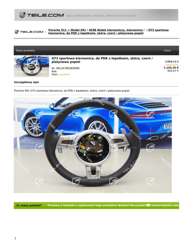Porsche 911 > Model 991 / 403B Wałek kierowniczy, kierownica / / GT3 sportowa kierownica, do PDK z łopatkami, skóra, czerń / platynowa popiel Dane produktu Cena GT3 sportowa kierownica, do PDK z łopatkami, skóra, czerń / platynowa popiel Nr: 99134780383DRN Rok: Stan: używany 2.858,11 € rabat 60% 1.143,25 € 929,47 € Szczegółowy opis Porsche 991 GT3 sportowa kierownica, do PDK z łopatkami, skóra, czerń / platynowa popiel masz pytanie? 1 Prosimy o kontakt z opiekunem tego produktu: Norbert Buczyński [email protected] 2 3