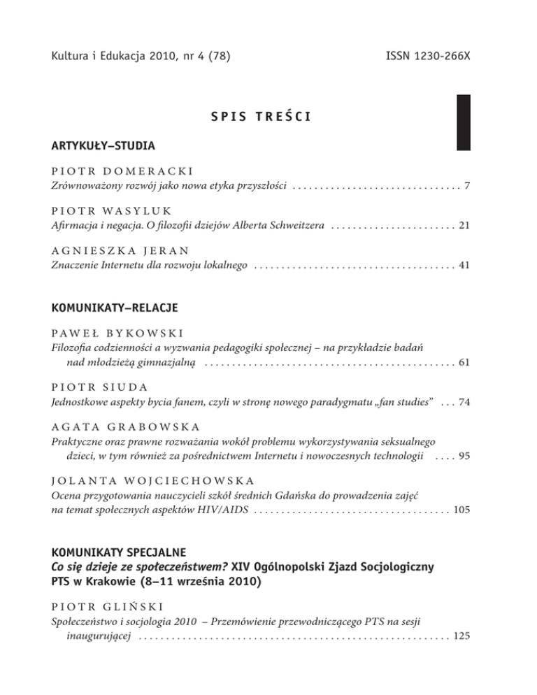 Kultura i Edukacja 2010, nr 4 (78) ISSN 1230-266X SPIS TREŚCI ARTYKUŁY–STUDIA PIOTR DOMERACKI Zrównoważony rozwój jako nowa etyka przyszłości . . . . . . . . . . . . . . . . . . . . . . . . . . . . . . . 7 P I O T R WA S Y L U K Afirmacja i negacja. O filozofii dziejów Alberta Schweitzera . . . . . . . . . . . . . . . . . . . . . . . 21 AGNIESZKA JERAN Znaczenie Internetu dla rozwoju lokalnego . . . . . . . . . . . . . . . . . . . . . . . . . . . . . . . . . . . . . 41 KOMUNIKATY–RELACJE PAW E Ł B Y K O W S K I Filozofia codzienności a wyzwania pedagogiki społecznej – na przykładzie badań nad młodzieżą gimnazjalną . . . . . . . . . . . . . . . . . . . . . . . . . . . . . . . . . . . . . . . . . . . . . . 61 PIOTR SIUDA Jednostkowe aspekty bycia fanem, czyli w stronę nowego paradygmatu „fan studies” . . . 74 A G ATA G R A B O W S K A Praktyczne oraz prawne rozważania wokół problemu wykorzystywania seksualnego dzieci, w tym również za pośrednictwem Internetu i nowoczesnych technologii . . . . 95 J O L A N TA WO J C I E C H O W S K A Ocena przygotowania nauczycieli szkół średnich Gdańska do prowadzenia zajęć na temat społecznych aspektów HIV/AIDS . . . . . . . . . . . . . . . . . . . . . . . . . . . . . . . . . . . . 105 KOMUNIKATY SPECJALNE Co się dzieje ze społeczeństwem? XIV Ogólnopolski Zjazd Socjologiczny PTS w Krakowie (8–11 września 2010) PIOTR GLIŃSKI Społeczeństwo i socjologia 2010 – Przemówienie przewodniczącego PTS na sesji inaugurującej . . . . . . . . . . . . . . . . . . . . . . . . . . . . . . . . . . . . . . . . . . . . . . . . . . . . . . . . . 125 AGNIESZKA JERAN Społeczeństwo ma się… dobrze, w socjologii polskiej „przejścia fazowego” nie było… . . . 139 M A R E K N O WA K XIV Zjazd Socjologiczny W Krakowie. Kilka impresji osoby zaangażowanej w organizację Zjazdu Poznańskiego w 2004 roku . . . . . . . . . . . . . . . . . . . . . . . . . . . . 146 ALICJA CHYŁA „Ciało w przestrzeni społecznej” – relacja z obrad grupy tematycznej . . . . . . . . . . . . . . 156 A L E K S A N D R A N O WA K O W S K A K U T R A „Pomiędzy realnością a wirtualnością. Internet i nowe technologie w życiu codziennym” – sprawozdanie z prac grupy tematycznej . . . . . . . . . . . . . . . . . . . . . . . 162 K R Z Y S Z T O F F RY S Z TA C K I Kilka słów o XIV Ogólnopolskim Zjeździe Socjologicznym . . . . . . . . . . . . . . . . . . . . . . . 166 RECENZJE–SPRAWOZDANIA Grażyna Krzyminiewska (rec.): Maria Nawojczyk, Przedsiębiorczość. O trudnościach w aplikacji teorii . . . . . . . . . . . . . . . . . . . . . . . . . . . . . . . . . . . . . . . . . 170 Maria Nawojczyk: Komentarz do recenzji książki Przedsiębiorczość. O trudnościach w aplikacji teorii . . . . . . . . . . . . . . . . . . . . . . . . . . . . . . . . . . . . . . . . . 175 Cezary Marasiński (rec.): Benjamin R. Barber, Skonsumowani. Jak rynek psuje dzieci, infantylizuje dorosłych i połyka obywateli . . . . . . . . . . . . . . . 178 Karolina Garczyńska-Grabowska (rec.): Małgorzata Gawrycka, Julita Wasilczuk, Patrycja Zwiech, Szklany sufit i ruchome schody. Kobiety na rynku pracy . . . . . . . . 181 Piotr Skuza (rec.): Krzysztof Tomasik, Homobiografie. Pisarki i pisarze polscy XIX i XX wieku . . . . . . . . . . . . . . . . . . . . . . . . . . . . . . . . . . . . . . . . . . . . . . . . . . . . . . . 188 Natalia Krzyżanowska: „Za rok o tej samej porze”, czyli o II Kongresie Kobiet . . . . . . . 193 Justyna Czekajewska: Sprawozdanie z konferencji „Sztuka Matek” . . . . . . . . . . . . . . . . . 204 Kultura i Edukacja 2010, no. 4 (78) ISSN 1230-266X CONTENTS ARTICLES–STUDIES PIOTR DOMERACKI Sustainable Development as a New Ethics of the Future . . . . . . . . . . . . . . . . . . . . . . . . . . . 7 Being conscious of multi – and interdisciplinary character of the idea of sustainable development the author of this article limits his consideration exclusively to the ecophilosophical dimension. The thesis he would like to risk to set comes from conviction that the problem of sustainable development, in its philosophical, and especially in an ethical variant, is as much new as deeply and firmly set in the philosophical tradition. It is then a new old problem; new, because it touches upon an unprecedented, as Philippe Saint Marc described it, crisis of our civilization; old, because the ideas it assumes and says, at least in their broad outline, have been functioning in philosophy almost since the dawn of it, anyway since the Socratic anthropocentric turning point. The author calls for acknowledging the idea of sustainable development as opening a new perspective in ecophilosophy and through it initiating a new paradigm in the philosophy in 21th century of return to the human being reconciled with nature. At bases of the principle of sustainable development lies the structural aiming at future, which is expressed, on an ethical level, out of authentic and committed concern for the future development of mankind. The ethics of sustainable development as a new ethics for the future is then, when all is said and done, according to Hans Jonas’ words, the ethics of unavoidable responsibility for the future generations. P I O T R WA S Y L U K Affirmation and Negation. On Albert Schweitzer’s Philosophy of History . . . . . . . . . . . . . 21 In this article i try to prove, that aim of the philosophy of Albert Schweitzer is to discover real meaning of history. Important is, that his philosophical inquiry may be seen as attempt to rehab philosophical view on history which lies beyond ordinary historical purview. His life – and world affirmation are the basis of his view on historical process and decline of the Western Civilization diagnosis. Quite optimistic view, makes him understand main factors of this decline and push him to find a medicine. Negative effects of mass culture and global conflict threats let him know, that science