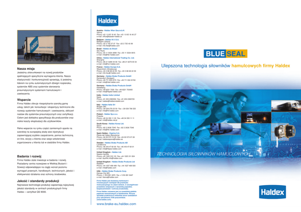 Austria - Haldex Wien Ges.m.b.H. Vienna Phone +43 1 8 65 16 40 Fax +43 1 8 65 16 40 27 e-mail: [email protected] Belgium - Haldex N.V./S.A. Balegem (Ghent) Phone +32 2 725 37 07 Fax +32 2 725 40 99 e-mail: [email protected] Brazil - Haldex do Brasil Sčo Paulo Phone +55 11 5034 4999 Fax +55 11 5034 9515 e-mail: [email protected] China - Haldex International Trading Co. Ltd. Shanghai Phone +86 21 6289 44 69 Fax +86 21 6279 05 54 e-mail: [email protected] Nasza misja Jesteśmy ukierunkowani na rozwój produktów spełniających specyficzne wymagania klienta. Nasza elastyczność i konkurencyjność sprawiają, iż jesteśmy liderem na rynku automatycznych dźwigni rozpieraka, systemów ABS oraz systemów sterowania pneumatycznymi systemami hamulcowymi i zawieszenia. Wsparcie Firma Haldex oferuje niespotykanie szeroką gamę usług, takich jak: konsultacje i ekspertyzy techniczne dla rozwoju systemów hamulcowych i zawieszenia, obliczeń nastaw dla systemów pneumatycznych oraz certyfikacji. Celem jest dokładna specyfikacja dla producentów oraz niskie koszty eksploatacji dla użytkowników. Pełne wsparcie na rynku części zamiennych oparte na szerokiej na europejską skalę sieci dystrybucji zapewniającej szybkie zaopatrzenie, pomoc techniczną on-line, wizyty u klienta oraz sesje szkoleniowe organizowane u klienta lub w siedzibie firmy Haldex. Badania i rozwój France - Haldex Europe S.A. Weyersheim (Strasbourg) Phone +33 3 88 68 22 00 Fax +33 3 88 68 22 09 e-mail: [email protected] Germany - Haldex Brake Products GmbH Denkendorf (Stuttgart) Phone +49 711 934 9170 Fax +49 711 934 91740 e-mail: [email protected] Germany - Haldex Brake Products GmbH Heidelberg Phone +49 6221 7030 Fax +49 6221 703400 e-mail: [email protected] India - Haldex India Limited Nasik Phone +91 253 2380094 Fax +91 253 2380729 e-mail: [email protected] Italy - Haldex Italia Srl Muggio (Mi) Phone +39 039 278 23 50 Fax: +39 039 796 525 e-mail: [email protected] Poland - Haldex Sp.z.o.o. Praszka Phone +48 34 350 11 00 Fax +48 34 350 11 11 e-mail: [email protected] South Korea - Haldex Korea Ltd. Seoul Phone +82 2 2636 7545 Fax +82 2 2636 7548 e-mail: [email protected] Spain Haldex - Espčna S.A. Parets del Valles (Barcelona) Phone +34 93 573 10 30 Fax +34 93 573 07 28 e-mail: [email protected] Sweden - Haldex Brake Products AB Landskrona Phone +46 418 47 60 00 Fax +46 418 47 60 01 e-mail: [email protected] United Kingdom - Haldex Ltd. Newton Aycliffe Phone +44 1325 310 110 Fax +44 1325 311 834 e-mail: [email protected] Firma Haldex stale inwestuje w badania i rozwój. Posiadamy centra rozwojowe w Wielkiej Brytanii i Szwecji odpowiadające na ciągły wzrost poziomu wymagań prawnych, handlowych, technicznych, jakości i efektywności działania oraz ochrony środowiska. Jakość i standardy produkcji Najnowsze technologie produkcji zapewniają najwyższej jakości standardy w centrach produkcyjnych firmy Haldex – certyfikat QS 9000. United Kingdom - Haldex Brake Products Ltd Redditch Phone +44 1527 499 499 Fax +44 1527 499 500 e-mail: [email protected] USA - Haldex Brake Products Corp. Kansas City MO Phone +1 816 891 2470 Fax +1 816 891 9447 e-mail: [email protected] Firma Haldex jest dostawcą markowych i innowacyjnych rozwiązań dla przemysłu motoryzacyjnego na całym świecie, w szczególności produktów związanych z dynamiką pojazdów, bezpieczeństwem i ochroną środowiska. Firma Haldex notowana jest na szwedzkiej giełdzie papierów wartościowych w Sztokholmie. Roczna sprzedaż przekracza 6 miliardów koron szwedzkich przy zatrudnieniu 4100 pracowników. (www.haldex.com) www.brake-eu.haldex.com Ulepszona technologia siłowników hamulcowych firmy Haldex Siłowniki firmy Haldex do pneumatycznych systemów hamulcowych Siłowniki do hamulców tarczowych naczep i przyczep Podwójna membranowa konstrukcja redukuje koszty i masę dając wyjątkową efektywność. Stworzony i przetestowany tak by gwarantował trwałość i większą żywotność. Dostępność odmian: 16/24 (skok 57mm) – w sprzedaży 20/24 (skok 64mm) – w fazie testów 24/24 (skok 64mm) – w fazie testów 20/30 (skok 64mm) – w fazie testów 24/30 (skok 64mm) – w fazie testów Dwie odmiany: kompletna, część sprężynowa. Podwójne membranowo – sprężynowe siłowniki do hamulców bębnowych naczep i przyczep Pierwszy wybór producentów naczep i przyczep oraz operatorów flot ze względu na prostotę montażu, długą żywotność i niskie koszty eksploatacji. Dostępna również pełna gama komór membranowych. Dostępność odmian: 20/30 (skok 76mm) 24/30 (skok 76mm) 30/30 (skok 76mm) Dwie odmiany: kompletna, część sprężynowa. Przez ponad 80 lat, technologie firmy Haldex sprawiały, iż ładunki dociarały do miejsca przeznaczenia. Dziś, każde rozwiązanie firmy Haldex – czy jest to pojedyncza część, czy też kompletny system – oparte jest na latach doświadczenia i na milionach przejechanych kilometrów. Produkty Blue Seal reprezentują najnowsze osiągnięcia w technologii systemów hamulcowych na świecie. Zamocowany do obudowy niebieski korek utrzymuje się na swoim miejscu, chroniąc wnętrze siłownika przed zanieczyszczeniami. Poddane indywidualnej obróbce cieplnej sprężyny dociskowe. Sprężyny dociskowe chronione są warstwą epoksydową. Innowacja, jakość i zależność, które zdefiniowały technologię podwójnych siłowników membranowo – sprężynowych w Europie są teraz dostępne bezpośrednio w postaci linii produktów Blue Seal. Haldex opracował pierwsze podwójne membranowo – sprężynowe siłowniki na świecie i był pionierem w tej dziedzinie w Europie. • Konstrukcja z bardzo wytrzymałą sprężyną (specjalna obróbka cieplna) w celu uzyskania maksymalnej siły wyjściowej i większej żywotności. Pokryta warstwą epoksydową dla ochrony antykorozyjnej Innowacje firmy Haldex • Pierwsze podwójne membranowo – sprężynowe siłowniki na świecie, zapewniające mniej kosztown