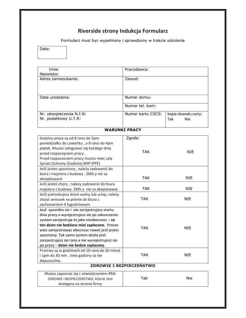 Riverside strony Indukcja Formularz Formularz musi byc wypelniony i sprawdzony w trakcie szkolenia Data: Imie: Nazwisko: Adres zamieszkania: Pracodawca: Data urodzenia: Numer domu: Zawod: Numer tel. kom: Nr. ubezpieczenia N.I.N: Nr. podatkowy U.T.R: Numer karty CSCS: kopia dowodu carty: Tak Nie WARUNKI PRACY Godziny pracy są od 8 rano do 5pm poniedziałku do czwartku , a 8 rano do 4pm piątek. Musisz zalogować się każdego dnia przed rozpoczęciem pracy . Przed rozpoczeciem pracy musisz miec caly Sprzet Ochrony Osobistej BHP (PPE) Jeśli jestes spozniony , należy zadzwonić do biura i majstera z budowy . SMS-y nie sa akceptowane Jeśli jesteś chory , nalezy zadzwonić do biura majstera z budowy. SMS-y nie sa akeptowane. Jeśli potrzebujesz dzień wolny lub urlop, należy złożyć wniosek na piśmie do biura z zachowaniem 4 tygodniowym Jesli spozniles sie i nie zarejestrujesz startu dnia pracy a wyrejestrujesz sie po zakonczeniu system zarejestruje to jako nieobecnosc – za ten dzien nie bedziesz mial zaplacone. Prosze wiec zarejestrowac obecnosc nawet jesli jestes spozniony. Tak samo system dziala jesli zarejestrujesz sie rano a nie wyrejestrujesz sie po pracy – dzien nie bedzie zaplacony. Przerwy są w godzinach od 10 rano do 20 minut i 1pm do 30 min . Inne godziny sa nie dopuszczlne. Zgoda: TAK NIE TAK NIE TAK NIE TAK NIE TAK NIE TAK NIE ZDROWIE I BEZPIECZEŃSTWO Musisz zapoznać się z oświadczeniem RML ZDROWIE I BEZPIECZEŃSTWO, ktora Jest dostępna na stronie firmy Tak Nie Musisz zapoznac sie z indukcja glownego wykonawcy przed rozpoczeciem pracy Musisz sie zgodzic na prace i byc zapoznany z tymczasowymi metodami tej pracy. Tak Nie Tak Nie SOO BHP (PPE) powinien być noszony caly czas, kamizelka ochronna, obuwie ochronne, kask, rekawice moga byc wymagane na budowie RML zaopatrzy kazdego. Pracownicy musza sie prezentowac profesjonalnie, krotkie spodenki sa zabronione. Tak Nie KOMUNIKACJA Twoj jezyk ojczysty? Stopien jezyka angielskiego (zaznacz ) B.dobrze Zero Dobrze Srednio Imie i nazwisko, numer telefonu najbliższej osoby z ktora mozemy sie skontaktowac w razie wypadku : OŚWIADCZENIE : Potwierdzam, ze powyzsze informacje sa prawidlowei , ze zapoznalem sie i rozumiem zasady bezpieczenstwa. Zaloguj się przez osobę robi indukcji : Podpis:…………………………………… Podpisano : ................................... indukcja Świadek Wszystkie pytania zostały wysłuchane w sposób zadowalający.