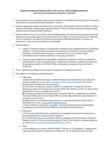Regulamin ogólnopolskiego konkursu dla uczniów szkół ponadgimnazjalnych „Fizyczne i Astronomiczne Stypendia w Toruniu” 1. Celem Konkursu jest zainteresowanie uczniów studiami na Wydziale Fizyki, Astronomii i Informatyki Stosowanej Uniwersytetu Mikołaja Kopernika w Toruniu. 2. Konkurs organizują wspólnie Wydział Fizyki, Astronomii i Informatyki Stosowanej UMK w Toruniu i Fundacja Aleksandra Jabłońskiego. Dziekan Wydziału i Prezes Zarządu Fundacji powołują Komisję Konkursową do przeprowadzenia Konkursu. 3. Konkurs adresowany jest do uczniów szkół ponadgimnazjalnych, którzy zamierzają rozpocząć studia stacjonarne pierwszego stopnia na kierunkach astronomia, fizyka, lub fizyka techniczna na Wydziale Fizyki, Astronomii i Informatyki Stosowanej Uniwersytetu Mikołaja Kopernika w Toruniu, nie później niż w roku uzyskania świadectwa maturalnego. 4. Istota Konkursu: o Udział w Konkursie polega na samodzielnym napisaniu pracy popularnonaukowej lub będąca raportem z własnych badań i przygotowaniu prezentacji na dowolny temat bezpośrednio związany z fizyką lub astronomią (praca i prezentacja na ten sam temat). Osoby zakwalifikowane do finału przedstawią w nim ustne prezentacje. o Laureaci zostaną nagrodzeni stypendiami, bezpłatnymi miejscami w domach studenckich (akademikach) i zestawami podręczników akademickich. Realizacja nagród uwarunkowana jest podjęciem studiów na WFAiIS UMK na kierunkach astronomia, fizyka lub fizyka techniczna. 5. Wraz z ogłoszeniem kolejnej edycji Konkursu organizatorzy podają jej terminarz. 6. Szczegółowe wymagania i przebieg Konkursu o Zgłoszenia i. Zgłoszenie do Konkursu polega na nadesłaniu poprawnie wypełnionej karty zgłoszenia (wzór do pobrania ze strony http://www.fizyka.umk.pl/wfaiis/?q=node/16648 ) wraz z pisemną pracą konkursową oraz prezentacją. ii. Praca musi być napisana w języku polskim, na komputerze. Jej objętość nie może przekraczać pięciu stron formatu A4 (czcionka Times New Roman, rozmiar 12, kolor czarny, odstęp półtora wiersza, marginesy po 2,5 cm). iii. Prezentacja powinna być przygotowana w formacie PDF lub w programie Power Point (Microsoft Office) albo Impress (Open Office). Ma być odpowiednia do zaprezentowania w czasie od 15 do 25 minut. iv. Zgłoszenia wraz z elektroniczną wersją pracy i z prezentacją należy przesłać pocztą elektroniczną na adres: [email protected] v. Prace konkursowe muszą być oryginalne, autorskie. Przedstawienie niesamodzielnej (cudzej) pracy prowadzi do dyskwalifikacji na dowolnym etapie Konkursu. o Eliminacje i. Treść i forma nadesłanych prac spełniających wymagania formalne jest oceniana przez Komisję Konkursową w skali od 0 do 20 punktów. ii. Do finału dopuszcza się uczestników, którzy w postępowaniu eliminacyjnym otrzymali najlepsze wyniki, w liczbie nie przekraczającej 20 osób. Lista finalistów zostanie ogłoszona na stronie http://www.fizyka.umk.pl/wfaiis/?q=node/18136 o Finał i. Finał odbędzie się na terenie WFAiIS UMK w Toruniu, ul. Grudziądzka 5. Organizatorzy zapewniają zaproszonym zamiejscowym finalistom oraz ich opiekunom-nauczycielom (najwyżej jeden opiekun ze szkoły lub rodzic/ opiekun prawny) noclegi, catering w dniu Konkursu oraz pokrywają koszty przejazdu (na podstawie złożonych oświadczeń - w przypadku przejazdu transportem publicznym do oświadczenia załącza się bilety poświadczające odbycie podróży). ii. Finaliści przedstawiają ustnie swoje prace przed Komisją Konkursową, innymi uczestnikami Konkursu, ich opiekunami i gośćmi. iii. Dopuszcza się przedstawienie w finale prezentacji udoskonalonej w stosunku do nadesłanej, ale na zgłoszony temat. iv. Czas trwania prezentacji ustala Organizator na podstawie liczby finalistów i możliwości organizacyjnych. Czas ten nie może być krótszy niż 15 minut, ani dłuższy niż 25 minut. W zaproszeniu do finału uczestnicy otrzymują informację o dopuszczalnej długości prezentacji. v. Komisja Konkursowa ocenia wystąpienia finałowe w skali od 0 do 20. vi. Autorzy najwyżej ocenionych wystąpień finałowych (nie więcej niż 10 osób) zostają laureatami Konkursu. Komisja Konkursowa rozdziela pomiędzy laureatów nagrody. 7. Nagrody: o Trzy stypendia w wysokości 300 zł miesięcznie wypłacane przez pierwsze dwa semestry studiów (10 miesięcy, od października do lipca). (Organizatorzy zakładają, że na drugim roku studiów dobrzy studenci otrzymają standardowe stypendium za dobre wyniki w nauce). o Trzy miejsca w domu studenckim* na okres pierwszego roku studiów (10 miesięcy) na WFAiIS UMK. (*laureat pokrywa we własnym zakresie podatek od przyjętej nagrody w wysokości 10% miesięcznego czynszu za akademik, kwota ta zależy od lokalizacji wybranego akademika, pokoju (1-os, 2-os) oraz jego standardu (podstawowy, podwyższony)), w najdroższy możliwym wariancie wysokość płaconego podatku nie przekracza kwoty 60 zł miesięcznie). o Cztery „bony podręcznikowe” o wartości 500 zł do wykorzystania w czasie pierwszych dwóch lat studiów na WFAiIS UMK. o Warunkiem realizacji nagród: stypendiów, miejsc w domach studenckich oraz bonów podręcznikowych jest podjęcie studiów na kierunku astronomia, fizyka lub fizyka techniczna. o Wszyscy laureaci otrzymują przywilej rekrutacyjny w postaci maksymalnej liczby punktów przy ubieganiu się o przyjęcie na dowolny kierunek studiów prowadzony przez Wydział Fizyki, Astronomii i Informatyki Stosowanej UMK (tj. astronomia, automatyka i robotyka, fizyka, fizyka techniczna i informatyka stosowana). o Dla wszystkich finalistów przewidziane są drobne upominki. 8. Odwołania: o Od decyzji Komisji Konkursowej możliwe jest odwołanie w formie pisemnej w ciągu tygodnia od ogłoszenia wyników odpowiedniej części Konkursu. Odwołanie musi być poparte argumentami, które mogłyby skłonić Komisję Konkursową do zmiany postanowienia. o Decyzja Komisji po rozpatrzeniu odwołan