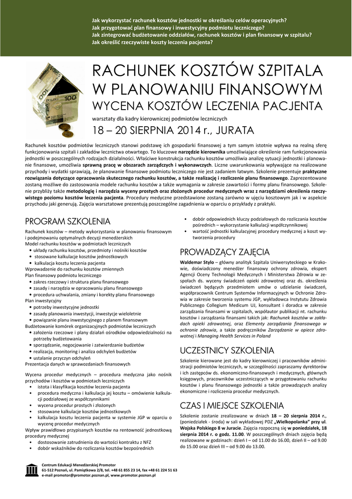 Jak wykorzystać rachunek kosztów jednostki w określaniu celów operacyjnych? Jak przygotować plan finansowy i inwestycyjny podmiotu leczniczego? Jak zintegrować budżetowanie oddziałów, rachunek kosztów i plan finansowy w szpitalu? Jak określić rzeczywiste koszty leczenia pacjenta? RACHUNEK KOSZTÓW SZPITALA W PLANOWANIU FINANSOWYM WYCENA KOSZTÓW LECZENIA PACJENTA warsztaty dla kadry kierowniczej podmiotów leczniczych 18 – 20 SIERPNIA 2014 r., JURATA Rachunek kosztów podmiotów leczniczych stanowi podstawę ich gospodarki finansowej a tym samym istotnie wpływa na realną sferę funkcjonowania szpitali i zakładów lecznictwa otwartego. To kluczowe narzędzie kierownika umożliwiające określenie ram funkcjonowania jednostki w poszczególnych rodzajach działalności. Właściwe konstrukcja rachunku kosztów umożliwia analizę sytuacji jednostki i planowanie finansowe, umożliwia sprawną pracę w obszarach zarządczych i wykonawczych. Liczne uwarunkowania wpływające na realizowane przychody i wydatki sprawiają, że planowanie finansowe podmiotu leczniczego nie jest zadaniem łatwym. Szkolenie prezentuje praktyczne rozwiązania dotyczące opracowania skutecznego rachunku kosztów, a także realizację i rozliczenie planu finansowego. Zaprezentowane zostaną możliwe do zastosowania modele rachunku kosztów a także wymagania w zakresie zawartości i formy planu finansowego. Szkolenie przybliży także metodologię i narzędzia wyceny prostych oraz złożonych procedur medycznych wraz z narzędziami określenia rzeczywistego poziomu kosztów leczenia pacjenta. Procedury medyczne przedstawione zostaną zarówno w ujęciu kosztowym jak i w aspekcie przychodu jaki generują. Zajęcia warsztatowe prezentują poszczególne zagadnienia w oparciu o przykłady z praktyki. PROGRAM SZKOLENIA • Rachunek kosztów – metody wykorzystania w planowaniu finansowym i podejmowaniu optymalnych decyzji menedżerskich Model rachunku kosztów w podmiotach leczniczych • układy rachunku kosztów, przedmioty i nośniki kosztów • stosowane kalkulacje kosztów jednostkowych • kalkulacja kosztu leczenia pacjenta Wprowadzenie do rachunku kosztów zmiennych Plan finansowy podmiotu leczniczego • zakres rzeczowy i struktura planu finansowego • zasady i narzędzia w opracowaniu planu finansowego • procedura uchwalania, zmiany i korekty planu finansowego Plan inwestycyjny • potrzeby inwestycyjne jednostki • zasady planowania inwestycji, inwestycje wieloletnie • powiązanie planu inwestycyjnego z planem finansowym Budżetowanie komórek organizacyjnych podmiotów leczniczych • założenia rzeczowe i plany działań ośrodków odpowiedzialności na potrzeby budżetowania • sporządzanie, negocjowanie i zatwierdzanie budżetów • realizacja, monitoring i analiza odchyleń budżetów • ustalanie przyczyn odchyleń Prezentacja danych w sprawozdaniach finansowych • Wycena procedur medycznych – procedura medyczna jako nośnik przychodów i kosztów w podmiotach leczniczych • istota i klasyfikacja kosztów leczenia pacjenta • procedura medyczna i kalkulacja jej kosztu – omówienie kalkulacji podziałowej ze współczynnikami • wycena procedur prostych i złożonych • stosowane kalkulacje kosztów jednostkowych • kalkulacja kosztu leczenia pacjenta w systemie JGP w oparciu o wycenę procedur medycznych Wpływ prawidłowo przypisanych kosztów na rentowność jednostkową procedury medycznej • dostosowanie zatrudnienia do wartości kontraktu z NFZ • dobór wskaźników do rozliczania kosztów bezpośrednich Centrum Edukacji Menedżerskiej Promotor 61-512 Poznań, ul. Pamiątkowa 2/8, tel. +48 61 855 23 14, fax +48 61 224 51 63 e-mail [email protected], www.promotor.poznan.pl dobór odpowiednich kluczy podziałowych do rozliczania kosztów pośrednich – wykorzystanie kalkulacji współczynnikowej wartość jednostki kalkulacyjnej procedury medycznej a koszt wytworzenia procedury PROWADZĄCY ZAJĘCIA Waldemar Stylo – główny analityk Szpitala Uniwersyteckiego w Krakowie, doświadczony menedżer finansowy ochrony zdrowia, ekspert Agencji Oceny Technologii Medycznych i Ministerstwa Zdrowia w zespołach ds. wyceny świadczeń opieki zdrowotnej oraz ds. określenia świadczeń będących przedmiotem umów o udzielanie świadczeń, współpracownik Centrum Systemów Informacyjnych w Ochronie Zdrowia w zakresie tworzenia systemu JGP, wykładowca Instytutu Zdrowia Publicznego Collegium Medicum UJ, konsultant i doradca w zakresie zarządzania finansami w szpitalach, współautor publikacji nt. rachunku kosztów i zarządzania finansami takich jak: Rachunek kosztów w zakładach opieki zdrowotnej, oraz Elementy zarządzania finansowego w ochronie zdrowia, a także podręczników Zarządzanie w opiece zdrowotnej i Managing Health Services in Poland UCZESTNICY SZKOLENIA Szkolenie kierowane jest do kadry kierowniczej i pracowników administracji podmiotów leczniczych, w szczególności zapraszamy dyrektorów i ich zastępców ds. ekonomiczno-finansowych i medycznych, głównych księgowych, pracowników uczestniczących w przygotowaniu rachunku kosztów i planu finansowego jednostki a także prowadzących analizy ekonomiczne i rozliczenia procedur medycznych. CZAS I MIEJSCE SZKOLENIA Szkolenie zostanie zrealizowane w dniach 18 – 20 sierpnia 2014 r., (poniedziałek - środa) w sali wykładowej PDZ „Wielkopolanka” przy ul. Wojska Polskiego 8 w Juracie. Zajęcia rozpoczną się w poniedziałek, 18 sierpnia 2014 r. o godz. 11.00. W poszczególnych dniach zajęcia będą realizowane w godzinach: dzień I – od 11.00 do 16.00, dzień II – od 9.00 do 15.00 oraz dzień III – od 9.00 do 13.00. RACHUNEK KOSZTÓW W PLANOWANIU FINANSOWYM WYCENA KOSZTÓW LECZENIA PACJENTA WARUNKI UCZESTNICTWA Cena uczestnictwa jednej osoby w szkoleniu wynosi 890,- PLN. Cena obejmuje zajęcia warsztatowe, konsultacje, bogate materiały szkoleniowe, przybory do pisania, imienny certyfikat u