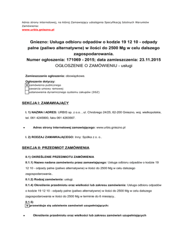 Adres strony internetowej, na której Zamawiający udostępnia Specyfikację Istotnych Warunków Zamówienia: www.urbis.gniezno.pl Gniezno: Usługa odbioru odpadów o kodzie 19 12 10 - odpady palne (paliwo alternatywne) w ilości do 2500 Mg w celu dalszego zagospodarowania. Numer ogłoszenia: 171069 - 2015; data zamieszczenia: 23.11.2015 OGŁOSZENIE O ZAMÓWIENIU - usługi Zamieszczanie ogłoszenia: obowiązkowe. Ogłoszenie dotyczy: V zamówienia publicznego zawarcia umowy ramowej ustanowienia dynamicznego systemu zakupów (DSZ) SEKCJA I: ZAMAWIAJĄCY I. 1) NAZWA I ADRES: URBIS sp. z o.o. , ul. Chrobrego 24/25, 62-200 Gniezno, woj. wielkopolskie, tel. 061 4245800, faks 061 4263567. Adres strony internetowej zamawiającego: www.urbis.gniezno.pl I. 2) RODZAJ ZAMAWIAJĄCEGO: Inny: Spółka z o. o.. SEKCJA II: PRZEDMIOT ZAMÓWIENIA II.1) OKREŚLENIE PRZEDMIOTU ZAMÓWIENIA II.1.1) Nazwa nadana zamówieniu przez zamawiającego: Usługa odbioru odpadów o kodzie 19 12 10 - odpady palne (paliwo alternatywne) w ilości do 2500 Mg w celu dalszego zagospodarowania.. II.1.2) Rodzaj zamówienia: usługi. II.1.4) Określenie przedmiotu oraz wielkości lub zakresu zamówienia: Usługa odbioru odpadów o kodzie 19 12 10 - odpady palne (paliwo alternatywne) w ilości do 2500 Mg w celu dalszego zagospodarowania w ilości do 2500 Mg w terminie do 6 miesięcy.. II.1.5) V przewiduje się udzielenie zamówień uzupełniających: Określenie przedmiotu oraz wielkości lub zakresu zamówień uzupełniających Zamawiający przewiduje udzielenie zamówień uzupełniających, o których mowa w art. 67 ust. 1 pkt. 6 ustawy PZP do 10 % wartości zamówienia podstawowego II.1.6) Wspólny Słownik Zamówień (CPV): 90.53.30.00-2, 90.51.40.00-3. II.1.7) Czy dopuszcza się złożenie oferty częściowej: nie. II.1.8) Czy dopuszcza się złożenie oferty wariantowej: nie. II.2) CZAS TRWANIA ZAMÓWIENIA LUB TERMIN WYKONANIA: Okres w miesiącach: 6. SEKCJA III: INFORMACJE O CHARAKTERZE PRAWNYM, EKONOMICZNYM, FINANSOWYM I TECHNICZNYM III.1) WADIUM Informacja na temat wadium: nie wnosi się III.2) ZALICZKI III.3) WARUNKI UDZIAŁU W POSTĘPOWANIU ORAZ OPIS SPOSOBU DOKONYWANIA OCENY SPEŁNIANIA TYCH WARUNKÓW III. 3.1) Uprawnienia do wykonywania określonej działalności lub czynności, jeżeli przepisy prawa nakładają obowiązek ich posiadania Opis sposobu dokonywania oceny spełniania tego warunku o WG SIWZ III.3.2) Wiedza i doświadczenie Opis sposobu dokonywania oceny spełniania tego warunku o WG SIWZ III.3.3) Potencjał techniczny Opis sposobu dokonywania oceny spełniania tego warunku o WG SIWZ III.3.4) Osoby zdolne do wykonania zamówienia Opis sposobu dokonywania oceny spełniania tego warunku o WG SIWZ III.3.5) Sytuacja ekonomiczna i finansowa Opis sposobu dokonywania oceny spełniania tego warunku o WG SIWZ III.4) INFORMACJA O OŚWIADCZENIACH LUB DOKUMENTACH, JAKIE MAJĄ DOSTARCZYĆ WYKONAWCY W CELU POTWIERDZENIA SPEŁNIANIA WARUNKÓW UDZIAŁU W POSTĘPOWANIU ORAZ NIEPODLEGANIA WYKLUCZENIU NA PODSTAWIE ART. 24 UST. 1 USTAWY III.4.1) W zakresie wykazania spełniania przez wykonawcę warunków, o których mowa w art. 22 ust. 1 ustawy, oprócz oświadczenia o spełnianiu warunków udziału w postępowaniu należy przedłożyć: potwierdzenie posiadania uprawnień do wykonywania określonej działalności lub czynności, jeżeli przepisy prawa nakładają obowiązek ich posiadania, w szczególności koncesje, zezwolenia lub licencje; opis urządzeń technicznych oraz środków organizacyjno-technicznych zastosowanych przez wykonawcę dostaw lub usług w celu zapewnienia jakości oraz opisu zaplecza naukowo-badawczego posiadanego przez wykonawcę lub które będzie pozostawało w dyspozycji wykonawcy; III.4.2) W zakresie potwierdzenia niepodlegania wykluczeniu na podstawie art. 24 ust. 1 ustawy, należy przedłożyć: oświadczenie o braku podstaw do wykluczenia; aktualny odpis z właściwego rejestru lub z centralnej ewidencji i informacji o działalności gospodarczej, jeżeli odrębne przepisy wymagają wpisu do rejestru lub ewidencji, w celu wykazania braku podstaw do wykluczenia w oparciu o art. 24 ust. 1 pkt 2 ustawy, wystawiony nie wcześniej niż 6 miesięcy przed upływem terminu składania wniosków o dopuszczenie do udziału w postępowaniu o udzielenie zamówienia albo składania ofert; aktualne zaświadczenie właściwego naczelnika urzędu skarbowego potwierdzające, że wykonawca nie zalega z opłacaniem podatków, lub zaświadczenie, że uzyskał przewidziane prawem zwolnienie, odroczenie lub rozłożenie na raty zaległych płatności lub wstrzymanie w całości wykonania decyzji właściwego organu - wystawione nie wcześniej niż 3 miesiące przed upływem terminu składania wniosków o dopuszczenie do udziału w postępowaniu o udzielenie zamówienia albo składania ofert; aktualne zaświadczenie właściwego oddziału Zakładu Ubezpieczeń Społecznych lub Kasy Rolniczego Ubezpieczenia Społecznego potwierdzające, że wykonawca nie zalega z opłacaniem składek na ubezpieczenia zdrowotne i społeczne, lub potwierdzenie, że uzyskał przewidziane prawem zwolnienie, odroczenie lub rozłożenie na raty zaległych płatności lub wstrzymanie w całości wykonania decyzji właściwego organu - wystawione nie wcześniej niż 3 miesiące przed upływem terminu składania wniosków o dopuszczenie do udziału w postępowaniu o udzielenie zamówienia albo składania ofert; III.4.4) Dokumenty dotyczące przynależności do tej samej grupy kapitałowej lista podmiotów należących do tej samej grupy kapitałowej w rozumieniu ustawy z dnia 16 lutego 2007 r. o ochronie konkurencji i konsumentów albo informacji o tym, że nie należy do grupy kapitałowej; SEKCJA IV: PROCEDURA IV.1) TRYB UDZIELENIA ZAMÓWIENIA IV.1.1) Tryb udzielenia zamówienia: przetarg nieograniczony. IV.2) KRYTERIA OCENY OFERT IV.2.1) Kryteria oceny ofert: najniższa cena. IV.2.2) przeprowadzona będzie aukcja elektroniczna, adres strony