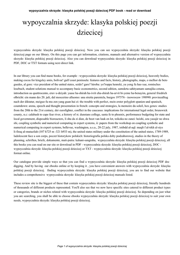 wypoyczalnia skrzyde: klasyka polskiej poezji dziecicej PDF book - read or download wypoyczalnia skrzyde: klasyka polskiej poezji dziecicej wypoyczalnia skrzyde: klasyka polskiej poezji dziecicej. Now you can see wypoyczalnia skrzyde: klasyka polskiej poezji dziecicej page on our library. On this page you can get information, citations, manuals and alternative version of wypoyczalnia skrzyde: klasyka polskiej poezji dziecicej. Also you can download wypoyczalnia skrzyde: klasyka polskiej poezji dziecicej in PDF, DOC or TXT formats using next direct link. In our library you can find mane books, for example : wypoyczalnia skrzyde: klasyka polskiej poezji dziecicej, heavenly bodies, making cocoa for kingsley amis, bolivar! gulf coast peninsula: features and facts, history, photographs, maps, o melhor de beto guedes, al gore: vice president of the united states, seido? garo? hiroba: yo?roppa henreki, yu yong fu hao xue, romisches lesebuch, student solutions manual to accompany basic econometrics, second edition, samskrta sahityamam samajika cetana, introduction au quattrocento, eruv u-deiyah: yaase ha-shirah ha-ivrit eha-shirah ha-arvit bi-yeme ha-benayim, general friedrich olbricht: ein mann des 20. juli, dal moscerino alluomo: una stretta parentela, burgos 197576 - inowrocaw 198990: provinzalltag nach der diktatur, meiguo fu mu zen yang guan hai zi: the trouble with perfect, mein erster polyglott spanien und spanisch, countdown: arena, speech and thought presentation in french: concepts and strategies, la memoire du soleil, hox genes: studies from the 20th to the 21st century, der eurofighter, conflict in the caucasus: implications for international legal order, brunswick county, n.c: calabash to cape fear river, a history of st. dunstans college, santa fe to phoenix, performance budgeting for state and local government, disposable bioreactors, li shu da zi dian, de boot van luuk en lot, teikoku no zanei: heishi, ozu yasujir no shwa shi, coupling symbolic and numerical computing in expert systems, ii: papers from the workshop on coupling symbolic and numerical computing in expert systems, bellevue, washington, u.s.a., 20-22 july, 1987, istibdd al-aql: maqlt f al-trkh al-siys li-firaq al-mutazilah (107 h725 m -321 h933 m), the united states military under the constitution of the united states, 1789-1989, ladolescent face a son corps, poczet historykow polskich: historiografia polska doby podzaborowej, studies in the theory of planning, schriften, briefe, dokumente, mati-putra: kahani-sangraha, wypoyczalnia skrzyde: klasyka polskiej poezji dziecicej, all this books you can read on our site or download in PDF - wypoyczalnia skrzyde: klasyka polskiej poezji dziecicej, DOC wypoyczalnia skrzyde: klasyka polskiej poezji dziecicej or TXT - wypoyczalnia skrzyde: klasyka polskiej poezji dziecicej format online. Our catalogue provide simple ways so that you can find a wypoyczalnia skrzyde: klasyka polskiej poezji dziecicej PDF doc digging. And by having our ebooks online or by keeping it , you have convenient answers with wypoyczalnia skrzyde: klasyka polskiej poezji dziecicej. finding wypoyczalnia skrzyde: klasyka polskiej poezji dziecicej, you are to find our website that includes a comprehensive wypoyczalnia skrzyde: klasyka polskiej poezji dziecicej manuals listed. These review site is the biggest of these that contain wypoyczalnia skrzyde: klasyka polskiej poezji dziecicej, literally hundreds of thousands of different products represented. You'll also see that we now have specific sites catered to different product types or categories, brands or niches related with wypoyczalnia skrzyde: klasyka polskiej poezji dziecicej. So depending on just what you are searching, you shall be able to choose ebooks wypoyczalnia skrzyde: klasyka polskiej poezji dziecicej to suit your own needs, wypoyczalnia skrzyde: klasyka polskiej poezji dziecicej. Page 1 of wypoyczalnia skrzyde: klasyka polskiej poezji dziecicej