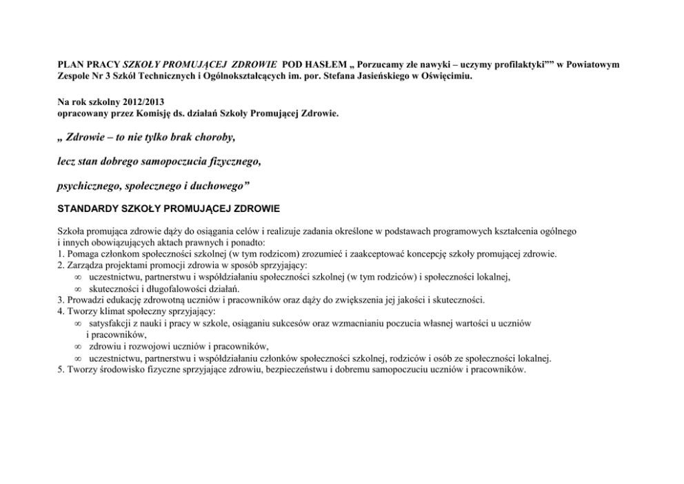 Plan pracy szkoły promującej zdrowie pod hasłem