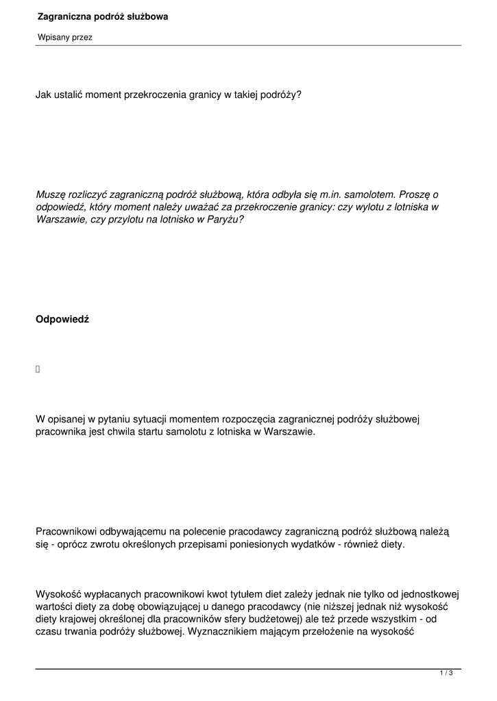 Zagraniczna podróż służbowa Wpisany przez Jak ustalić moment przekroczenia granicy w takiej podróży? Muszę rozliczyć zagraniczną podróż służbową, która odbyła się m.in. samolotem. Proszę o odpowiedź, który moment należy uważać za przekroczenie granicy: czy wylotu z lotniska w Warszawie, czy przylotu na lotnisko w Paryżu? Odpowiedź W opisanej w pytaniu sytuacji momentem rozpoczęcia zagranicznej podróży służbowej pracownika jest chwila startu samolotu z lotniska w Warszawie. Pracownikowi odbywającemu na polecenie pracodawcy zagraniczną podróż służbową należą się - oprócz zwrotu określonych przepisami poniesionych wydatków - również diety. Wysokość wypłacanych pracownikowi kwot tytułem diet zależy jednak nie tylko od jednostkowej wartości diety za dobę obowiązującej u danego pracodawcy (nie niższej jednak niż wysokość diety krajowej określonej dla pracowników sfery budżetowej) ale też przede wszystkim - od czasu trwania podróży służbowej. Wyznacznikiem mającym przełożenie na wysokość 1/3 Zagraniczna podróż służbowa Wpisany przez wypłacanych pracownikowi kwot są tutaj progi czasowe, określone w rozporządzeniu (...) z tytułu podróży służbowej poza granicami kraju. Dlatego tak istotne jest prawidłowe ustalenie momentów rozpoczęcia i zakończenia podroży służbowej, bo to one bezpośrednio wyznaczają jej czas, a tym samym wysokość przysługujących pracownikowi diet. Sposób liczenia czasu podróży pracownika poza granicami kraju precyzuje § 3 ww. rozporządzenia. W przypadku podróży odbywanej środkiem komunikacji lotniczej czas pobytu w podróży służbowej liczony jest od chwili startu samolotu w drodze za granicę z ostatniego lotniska w kraju do chwili lądowania samolotu w drodze powrotnej na pierwszym lotnisku w kraju. Z pytania wynika, że pracownik udał się w zagraniczną podróż samolotem. Wylot za granicę miał miejsce z lotniska w Warszawie. Zatem należy uznać, że było to ostatnie lotnisko w kraju, z którego wylot następował bezpośrednio za granicę. Tym samym momentem rozpoczęcia zagranicznej podróży służbowej pracownika był moment startu samolotu z tego właśnie lotniska. Ważne 2/3 Zagraniczna podróż służbowa Wpisany przez Należy podkreślić, że projektowane rozporządzenie w sprawie podróży służbowych w kraju i poza jego granicami zawiera w powyższym zakresie analogiczne rozwiązanie do tego, które jest zawarte w rozporządzeniu obowiązującym obecnie. Zatem również na podstawie nowego rozporządzenia w przypadku zagranicznej podróży służbowej odbywanej samolotem momentem jej rozpoczęcia będzie moment startu samolotu za granicę z ostatniego lotniska w kraju. Podstawa prawna: § 3 rozporządzenia Ministra Pracy i Polityki Społecznej z 19 grudnia 2002 r. w sprawie wysokości oraz warunków ustalania należności przysługujących pracownikowi zatrudnionemu w państwowej lub samorządowej jednostce sfery budżetowej z tytułu podróży służbowej poza granicami kraju (Dz.U. nr 236, poz. 1991 ze zm.). Anna Welsyng radca prawny, doradca podatkowy 3/3