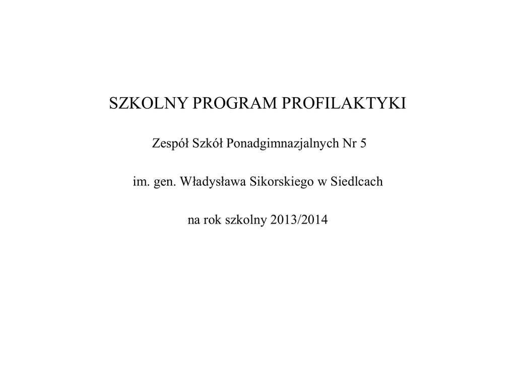 SZKOLNY PROGRAM PROFILAKTYKI Zespół Szkół Ponadgimnazjalnych Nr 5 im. gen. Władysława Sikorskiego w Siedlcach na rok szkolny 2013/2014 Program działań profilaktycznych w szkole opracowany zostal na podstawie analizy sytuacji wychowawczej, która stanowi nieodłączny element tego programu. Planowana profilaktyka odbywać się będzie z aktywnym udziałem wskazanych w programie osób - głównie pracowników szkoły, rodziców, samorządu uczniowskiego, wspieranych szeroką wspólpracą z instytucjami i osobami działającymi w kierunku pomocy ludziom znajdującym się w trudnej sytuacji życiowej, rodzinnej i materialnej. Ze względu na złożoność problemów związanych z socjalizacją młodzieży, realizacja działań profilaktycznych odbywać się będzie w trzech sferach: 1. działania w zakresie profilaktyki zdrowotnej 2. działania w zakresie profilaktyki społecznej 3. działania w zakresie profilaktyki uzależnień Ad. 1 W profilaktyce zdrowotnej niezbędne jest propagowanie wśród młodzieży zdrowego stylu życia. Ważna jest też dyskusja nad problemami związanymi z wczesną inicjacją seksualną. Istotne wydaje się też wskazywanie problemów i możliwości zapobiegania skutkom wynikającym z chorób dotykających młodzież, takich jak anoreksja, bulimia, depresja, itp. Należy również podjąć starania w celu pozyskiwania środków na wspieranie finansowe uczniów z rodzin o słabej kondycji materialnej, wynikającej z bezrobocia czy innych dysfunkcji. Ad. 2 W profilaktyce społecznej należy podjąć działania w kierunku kształtowania właściwych postaw w stosunkach międzyludzkich, zapobiegające zagrożeniom agresji, psychomanipulacji, przestępczości. W związku z tym należy kształtować u młodzieży pewne umiejętności psychologiczne i społeczne, a mianowicie: - umiejętność wyznaczania celów życiowych - umiejętność podejmowania decyzji - umiejętność budowania adekwatnej samooceny - umiejętność rozpoznawania i radzenia sobie z presją mediów i rówieśników - umiejętność rozwiązywania konfliktów - umiejętność dobrego komunikowania się z innymi - umiejętność tworzenia sojuszy Ad. 3 W profilaktyce uzależnień działania powinny koncentrować się na informowaniu młodzieży i ich rodziców o mechanizmach uzależnień od środków psychoaktywnych, na rozwijaniu umiejętności odpowiedzialnego podejmowania decyzji w tym zakresie, na umiejętności radzenia sobie w trudnych sytuacjach życiowych oraz - najszerzej rzecz ujmując - na sprzyjaniu rozwojowi osobowości uczniów. Cel nadrzędny- zapobieganie szeroko pojetej patologii społecznej wśród młodzieży Cele szczegółowe: zapobieganie agresji zapobieganie uzależnieniom nauka kulturalnego zachowauia się w kontaktach z innymi ludźmi promocja zdrowego stylu życia dbanie o zdrowie psychiczne uczniów Formy realizacji i metody pracy: .' warsztaty zajęcia specjalistyczne psychoedukacyjne rozmowy indywidualne z uczniami i rodzicami pogadanki audycje i środki audiowizualne radiowe konkursy zajęcia pozalekcyjne wycieczki współpraca z instytucjami wspomagającymi szkołę, młodzież i rodziców w procesie wychowania i profilaktyki ZADANIA REALIZOWANE W RAMACH SZKOLNEGO PROGRAMU PROFILAKTYCZNEGO W ROKU SZKOLNYM 2013/2014 -. 1. Analiza sytuacji wychowawczej w szkole ZADANIA FORMA REALIZACJI OSOBA TERMIN ODPOWIEDZIALNA REALIZACJI Diagnozowanie stanu bezpieczeństwa w szkole Ankiety Pedagog, psycholog, wychowawcy X w pierwszych klasach oraz raz w roku szkolnym w pozostałych klasach Diagnozowanie sytuacji ucznia w rodzinie Ankiety, rozmowy z rodzicami Pedagog, psycholog wychowawcy Wg potrzeb Diagnozowanie sytuacji wychowawczej w poszczególnych klasach Ankiety, rozmowy z uczniami Wychowawcy Cały rok Wychowawcy 2 razy w roku Wychowawcy IX Dokonywanie analizy sytuacji wychowawczej Przedstawienie przez w szkole na posiedzeniach Rad Pedagogicznych wychowawców analiz ankiet i Zespołach Wychowawczych diagnozujących sytuację wychowawczą w klasie, dyskusja Ustalenie, z jakimi ocenami ze sprawowania uczniowie klas pierwszych ukończyli gimnazja Analiza świadectw gimnazjalnych ZADANIA FORMA REALIZACJI OSOBA TERMIN ODPOWIEDZIALNA REALIZACJI Organizowanie konkursów propagujących zdrowy styl życia Plakaty, aforyzmy Samorząd szkolny Wg potrzeb Stały kontakt z rodzicami uczniów sprawiających problemy wychowawcze Rozmowy indywidualne Wychowawcy, pedagog, psycholog Cały rok Pedagogizacja rodziców Konsultacje Pedagog, psycholog, wychowawcy Wg potrzeb Omawianie problemów dotyczących profilaktyki na spotkaniach dyrekcji z przedstawicielami grona pedagogicznego Dyskusje, informacja dyrekcji szkoły Dyrektor 2 razy w roku szkolnym Konsultacje indywidualne z rodzicami w zakresie rozwiązywania problemów wychowawczych Rozmowy z zainteresowanymi rodzicami Pedagog, psycholog, wychowawcy Wg potrzeb Nauczyciele wychowania fizycznego Cały rok Ustalenie listy młodzieży z różnymi problemami Współpraca z pielęgniarką, zdrowotnymi ćwiczenia korektywne korygujące wady postawy ZADANIA FORMA REALIZACJI OSOBA TERMIN ODPOWIEDZIALNA REALIZACJI Wychowanie przez kulturę jako alternatywna - zajęcia pozalekcyjne forma spędzania czasu wolnego i zainteresowań - wycieczki - wyjścia do kina, muzeum - współpraca z instytucjami kulturalnymi w mieście - dbanie o kulturę słowa Wychowawcy, nauczyciele przedmiotów, pracownicy szkoły Zgodnie z harmonogramem, życzeniami i możliwościami uczniów Finansowe wspieranie uczniów będących w trudnej sytuacji materialnej Pedagog, psycholog Wychowawcy, Wg możliwości Zapomogi, stypendia 2. Podejmowanie działań profilaktycznych w zespołach klasowych, w indywidualnej pracy z uczniami i w pracy z rodzicami ZADANIA FORMA REALIZACJI OSOBA TERMIN ODPOWIEDZIALNA REALIZACJI Prowadzenie zajęć z zakresu: - integracji klasy - profilaktyki uzależnień - umiejętności interpersonalnych - rozwiązywania problemów klasowych Zajęcia warsztat