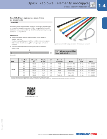 Opaski kablowe i elementy mocujące 1.4 Opaski kablowe rozpinalne Opaski kablowe ząbkowane zewnętrznie do znakowania Seria LR55 Rozpinalne opaski wielokrotnego użytku są doskonałym rozwiązaniem w przypadku instalacji tymczasowych lub w przypadku konieczności dokładania lub usuwania kabli, np. identyfikacja logistyczna, produkcja opakowań lub wiązek kabli. Właściwości • Rozpinalne opaski kablowe wielokrotnego użytku dostępna w wielu kolorach • Przedłużona zapadka zapewnia łatwe i szybkie rozpinanie opasek • Różne kolory do zastosowań, gdzie wymagane jest oznaczanie kolorami • Ząbkowanie zewnętrzne minimalizujące ryzyko uszkodzenia izolacji kabla L Opaski rozpinalne LR55 nadają się idealnie do kolorowych oznaczeń. W Wykaz materiałów, zob. str. 24. Seria LR55 TYP LR55R Szerokość (W) Długość (L) Wiązka Ø max Symbol materiału Kolor Ilość w opak. Nr art. 4,7 195,0 50,0 245 PA66 Czerwony (RD) 25 szt. 115-00003 4,7 195,0 50,0 245 PA66 Naturalny (NA) 25 szt. 115-00008 4,7 195,0 50,0 245 PA66 Niebieski (BU) 25 szt. 115-00006 4,7 195,0 50,0 245 PA66 Zielony (GN) 25 szt. 115-00005 4,7 195,0 50,0 245 PA66 Żółty (YE) 25 szt. 115-00004 4,7 195,0 50,0 245 PA66HS Czarny (BK) 25 szt. 115-00002 Wszystkie dane w mm. Zastrzegamy sobie prawo do ewentualnych zmian technicznych. Minimalna ilość zamówienia (MOQ) może się różnić w zależności od zawartości opakowania. Dostępne mogą być również inne opcje opakowania. Data wydania: 10/2015 Film instruktażowy: LR55 Więcej informacji: www.HellermannTyton.pl/mocowanie 77 Opaski kablowe i elementy mocujące 1.0 Informacje techniczne Przegląd właściwości materiałów Symbol materiału Temperatura pracy Kolor** CR -20 °C do +80 °C Czarny (BK) Etylentetrafluoroetylen E/TFE -80 °C to +170 °C Niebieski (BU) UL94 V0 Poliacetal POM -40 °C do +90 °C, (+110 °C, 500 h) Naturalny (NA) UL94 HB Poliamid 11 PA11 -40 °C do +85 °C, (+105 °C, 500 h) Czarny (BK) UL94 HB Poliamid 12 PA12 -40 °C do +85 °C, (+105 °C, 500 h) Czarny (BK) UL94 HB Poliamid 4.6 PA46 -40 °C do +150 °C (5000 h), +195 °C (500 h) Naturalny (NA), Szary (GY) UL94 V2 •Odporność na działanie wysokich temperatur •Duża wrażliwość na działanie wilgoci •Niska emisja dymu podczas spalania Poliamid 6 PA6 -40 °C do +80 °C Czarny (BK) UL94 V2 •Wysoka wytrzymałość na rozciąganie Poliamid 6.6 PA66 -40 °C do +85 °C, (+105°C, 500 h) Czarny (BK), Naturalny (NA) UL94 V2 •Wysoka wytrzymałość na rozciąganie PA66HIR -40 °C do +80 °C, (+105 °C, 500 h) Czarny (BK) UL94 HB Poliamid 6.6 odporny na udary mech. i wyższą temp. PA66HIRHS -40 °C do +105 °C Czarny (BK) UL94 HB Poliamid 6.6 odporny na udary mech. scan black PA66HIR(S) -40 °C do +80 °C, (+105 °C, 500 h) Czarny (BK) UL94 HB PA66W -40 °C do +85 °C, (+105 °C, 500 h) Czarny (BK) UL94 V2 •Wysoka wytrzymałość na rozciąganie •Odporność na promieniowanie UV Czarny (BK) UL94 HB •Podwyższona elastyczność (ograniczona kruchliwość) •Zwiększona elastyczność w niskiej temperaturze •Podwyższona maksymalna temperatura pracy •Wysoka wytrzymałość na rozciąganie z odpornością na promieniowanie UV Chloropren Poliamid 6.6 odporny na udary mech. Poliamid 6.6 odporny na UV Poliamid 6.6 odporny na UV, udary mech. i wyższą temp. Poliamid 6.6 odporny na UV i wyższą temperaturę Poliamid 6.6 odporny na wyższą temperaturę Poliamid 6.6 V0 PA66HIRHSW -40 °C do +110 °C Klasa palności Właściwości materiału* •Odporność na działanie warunków atmosferycznych •Wysoka wytrzymałość na rozciąganie •Odporność na promieniowanie radioaktywne •Odporność na UV •Brak wrażliwości na wilgoć (nie absorbuje wody) •Dobra odporność chemiczna na: kwasy, zasady i związki •Mała podatność na kruszenie się •Elastyczność w niskich temperaturach •Niewrażliwość na działanie wilgoci •Odporność na udary mechaniczne •Biotworzywo otrzymywane z oleju roślinnego •Wysoka udarność w niskich temperaturach •Bardzo słabe wchłanianie wilgoci •Odporność na działanie warunków atmosferycznych •Dobra odporność chemiczna •Dobra odporność chemiczna na działanie: kwasów, zasad i utleniaczy •Odporność na promieniowanie UV •Podwyższona elastyczność (ograniczona kruchliwość) •Zwiększona elastyczność w niskiej temperaturze •Podwyższona elastyczność (ograniczona kruchliwość) •Zwiększona elastyczność w niskiej temperaturze •Podwyższona maksymalna temperatura pracy •Podwyższona elastyczność (ograniczona kruchliwość) •Zwiększona elastyczność w niskiej temperaturze PA66HSW -40 °C do +105 °C Czarny (BK) UL94 V2 •Wysoka wytrzymałość na rozciąganie •Podwyższona maksymalna temperatura pracy •Odporność na promieniowanie UV PA66HS -40 °C do +105 °C Czarny (BK), Naturalny (NA) UL94 V2 •Wysoka wytrzymałość na rozciąganie •Podwyższona maksymalna temperatura pracy PA66V0 -40 °C to +85 °C Biały (WH) UL94 V0 •Wysoka wytrzymałość na rozciąganie •Niska emisja dymu podczas spalania Tefzel® jest zastrzeżonym znakiem towarowym firmy DuPont. Często do opasek wykonanych z materiału E/TFE stosuje się określenie Tefzel®-Tie (opaska Tefzel®). Oprócz materiału Tefzel® firmy DuPont HellermannTyton stosuje równorzędny surowiec E/TFE od innych dostawców. * Podane wartości mają jedynie charakter orientacyjny. Powinny być traktowane jako opis materiałów i nie mogą zastąpić badania przydatności. W celu uzyskania szczegółowych informacji należy zapoznać się z kartami charakterystyki produktów. **Więcej kolorów dostępnych jest na zamówienie. HF = materiał nie zawiera związków halogenowych LFH = Limited Fire Hazard (ograniczone ryzyko pożarowe) - materiał charakteryzuje się szczególnie niską emisją trujących gazów i dymu podczas spalania RoHS = materiał spełnia dyrektywę UE w zakresie ograniczenia zawartości substancji ni