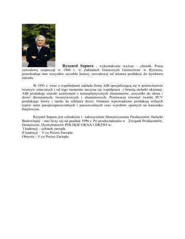 Ryszard Szpura - wykształcenie wyższe – chemik. Pracę zawodową rozpoczął w 1966 r. w Zakładach Gumowych Górnictwaw w Bytomiu, przechodząc tam wszystkie szczeble kariery zawodowej od mistrza produkcji do dyrektora odziału. W 1991 r. wraz z wspólnikami zakłada firmę AIB specjalizującą się w przetwórstwie tworzyw sztucznych i od tego momentu zaczyna się współpraca z branżą stolarki okiennej. AIB produkuje szeroki asortyment z termoplastycznych elastomerów, uszczelki do okien i drzwi drewnianych, tworzywowych i aluminiowych. Przetwarza również twarde PCV produkując listwy i ramki do szklenia drzwi. Ostatnio wprowadzono produkcję różnych typów taśm paroprzepuszczalnych i paroszczelnych oraz wyrobów opartych na kauczuku butylowym. Ryszard Szpura jest członkiem i założycielem Stowarzyszenia Producentów Stolarki Budowlanej – staż liczy się od grudnia 1996 r. Po przekształceniu w Związek Producentów, Dostawców, Dystrybutorów POLSKIE OKNA I DRZWI w: I kadencji – członek zarządu II kadencji – V-ce Prezes Zarządu Obecnie - V-ce Prezes Zarządu
