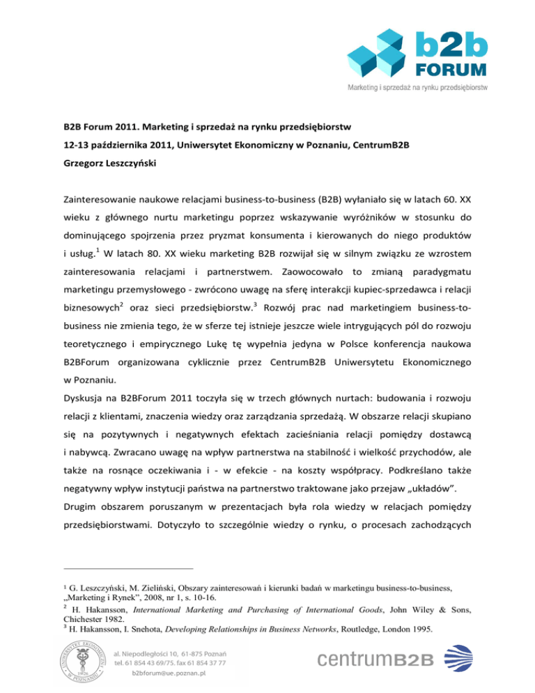 B2B Forum 2011. Marketing i sprzedaż na rynku przedsiębiorstw 12-13 października 2011, Uniwersytet Ekonomiczny w Poznaniu, CentrumB2B Grzegorz Leszczyński Zainteresowanie naukowe relacjami business-to-business (B2B) wyłaniało się w latach 60. XX wieku z głównego nurtu marketingu poprzez wskazywanie wyróżników w stosunku do dominującego spojrzenia przez pryzmat konsumenta i kierowanych do niego produktów i usług.1 W latach 80. XX wieku marketing B2B rozwijał się w silnym związku ze wzrostem zainteresowania relacjami i partnerstwem. Zaowocowało to zmianą paradygmatu marketingu przemysłowego - zwrócono uwagę na sferę interakcji kupiec-sprzedawca i relacji biznesowych2 oraz sieci przedsiębiorstw.3 Rozwój prac nad marketingiem business-tobusiness nie zmienia tego, że w sferze tej istnieje jeszcze wiele intrygujących pól do rozwoju teoretycznego i empirycznego Lukę tę wypełnia jedyna w Polsce konferencja naukowa B2BForum organizowana cyklicznie przez CentrumB2B Uniwersytetu Ekonomicznego w Poznaniu. Dyskusja na B2BForum 2011 toczyła się w trzech głównych nurtach: budowania i rozwoju relacji z klientami, znaczenia wiedzy oraz zarządzania sprzedażą. W obszarze relacji skupiano się na pozytywnych i negatywnych efektach zacieśniania relacji pomiędzy dostawcą i nabywcą. Zwracano uwagę na wpływ partnerstwa na stabilność i wielkość przychodów, ale także na rosnące oczekiwania i - w efekcie - na koszty współpracy. Podkreślano także negatywny wpływ instytucji państwa na partnerstwo traktowane jako przejaw „układów”. Drugim obszarem poruszanym w prezentacjach była rola wiedzy w relacjach pomiędzy przedsiębiorstwami. Dotyczyło to szczególnie wiedzy o rynku, o procesach zachodzących 1 G. Leszczyński, M. Zieliński, Obszary zainteresowań i kierunki badań w marketingu business-to-business, „Marketing i Rynek”, 2008, nr 1, s. 10-16. 2 H. Hakansson, International Marketing and Purchasing of International Goods, John Wiley & Sons, Chichester 1982. 3 H. Hakansson, I. Snehota, Developing Relationships in Business Networks, Routledge, London 1995. [email protected] wewnątrz przedsiębiorstw i umiejętności łączenia ich z procesami po stronie klienta oraz wartości wiedzy przekazywanej klientom w trakcie szkoleń. W ramach rozważań nad zarządzaniem sprzedażą uczestnicy B2BForum zwracali uwagę na pewną odrębność rozwiązań stosowanych w tym względzie w Polsce w stosunku do innych krajów europejskich i czerpanie ze wzorców pochodzących ze Stanów Zjednoczonych. Skupiano się też na problemach zarządzania siłami sprzedażowymi i organizacji systemów sprzedaży. Omówione nurty dyskusji ogniskowały się w specjalnej sesji branżowej poświęconej marketingowi i sprzedaży na rynku budowlanym. Omawiano na niej ograniczenia zacieśnianie relacji pomiędzy przedsiębiorstwami (m.in. rozwiązania przetargowe), ale także rozwiązania czerpiące z marketingu partnerskiego i pozytywne efekty, do których prowadzą. Na tegoroczną konferencję B2BForum 2011 odbywającą się w październiku br. przyjęto 40 referatów z polskich uczelni. Liczba ta jest większa w porównaniu do poprzedniej edycji, widoczne jest także większe zainteresowanie ze strony pracowników uczelni technicznych. Istotnym wyróżnikiem B2BForum jest łączenie dyskusji nad wynikami badań naukowych z rozwiązaniami stosowanym w przedsiębiorstwach. W tegorocznej edycji konferencji brało udział 40 menadżerów, a połowa wystąpień przypadała na praktyczne aspekty marketingu i sprzedaży business-to-business. Efektem konferencji jest 40 referatów przyjętych do publikacji w zeszycie naukowym oraz książka ze studiami przypadków dotyczące marketingu i sprzedaży w polskich przedsiębiorstwach. Wydawnictwa te będą cennym źródłem informacji na (skromnym pod względem publikacji dotyczących marketingu i sprzedaży na rynku przedsiębiorstw) polskim rynku wydawniczym. B2BForum 2011 zostało zorganizowane przy wsparciu organizacyjnym Advertiva s.c., finansowym Talex SA i Kompanii Piwowarskiej oraz patronów medialnych: „Marketing i Rynek”, „Treco” oraz „Marketing przy Kawie”. [email protected]