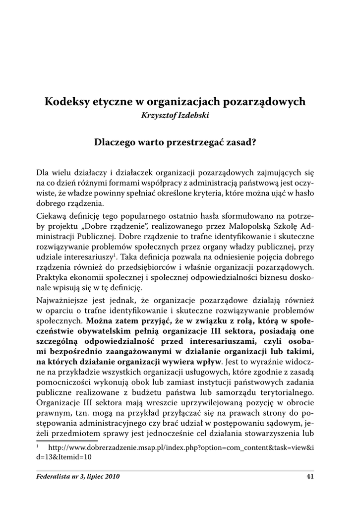 Kodeksy etyczne w organizacjach pozarządowych Krzysztof Izdebski Dlaczego warto przestrzegać zasad? Dla wielu działaczy i działaczek organizacji pozarządowych zajmujących się na co dzień różnymi formami współpracy z administracją państwową jest oczywiste, że władze powinny spełniać określone kryteria, które można ująć w hasło dobrego rządzenia. Ciekawą definicję tego popularnego ostatnio hasła sformułowano na potrzeby projektu „Dobre rządzenie”, realizowanego przez Małopolską Szkołę Administracji Publicznej. Dobre rządzenie to trafne identyfikowanie i skuteczne rozwiązywanie problemów społecznych przez organy władzy publicznej, przy udziale interesariuszy1. Taka definicja pozwala na odniesienie pojęcia dobrego rządzenia również do przedsiębiorców i właśnie organizacji pozarządowych. Praktyka ekonomii społecznej i społecznej odpowiedzialności biznesu doskonale wpisują się w tę definicję. Najważniejsze jest jednak, że organizacje pozarządowe działają również w oparciu o trafne identyfikowanie i skuteczne rozwiązywanie problemów społecznych. Można zatem przyjąć, że w związku z rolą, którą w społeczeństwie obywatelskim pełnią organizacje III sektora, posiadają one szczególną odpowiedzialność przed interesariuszami, czyli osobami bezpośrednio zaangażowanymi w działanie organizacji lub takimi, na których działanie organizacji wywiera wpływ. Jest to wyraźnie widoczne na przykładzie wszystkich organizacji usługowych, które zgodnie z zasadą pomocniczości wykonują obok lub zamiast instytucji państwowych zadania publiczne realizowane z budżetu państwa lub samorządu terytorialnego. Organizacje III sektora mają wreszcie uprzywilejowaną pozycję w obrocie prawnym, tzn. mogą na przykład przyłączać się na prawach strony do postępowania administracyjnego czy brać udział w postępowaniu sądowym, jeżeli przedmiotem sprawy jest jednocześnie cel działania stowarzyszenia lub 1 http://www.dobrerzadzenie.msap.pl/index.php?option=com_content&task=view&i d=13&Itemid=10 Federalista nr 3, lipiec 2010 41 fundacji. Wreszcie, konstrukcja tzw. 1% stanowi nie tylko zastrzyk finansowy z pieniędzy podatników, ale jest wyrazem zaufania obywateli i obywatelek dla działań konkretnej organizacji. Te wszystkie przywileje rodzą szczególną odpowiedzialność organizacji – za powierzone i wykonywane zadanie, sposób wydatkowania pieniędzy publicznych, ale również wobec prywatnego sponsora, czy odpowiedzialność za dobro wspólne sensu largo – reprezentując interesy różnych grup obywateli. Nie bez znaczenia jest również fakt, że organizacje pozarządowe odgrywają coraz istotniejszą rolę w kształtowaniu polityki społecznej i kierunku rozwoju instytucji państwowych.2 Ten wpływ jest coraz bardziej widoczny w Polsce – mimo negatywnych przykładów – istnieje dużo obszarów współpracy instytucji I i III sektora (Rada Pożytku Publicznego, Komisje Dialogu Społecznego, Programy Współpracy, Komitety Monitorujące itd.). Trzeba spojrzeć na tę kwestię również z perspektywy lobbingu organizacji pozarządowych. Według badań przeprowadzonych przez amerykańską organizację OMB Watch, „78% organizacji typu non–profit zadeklarowało zachęcanie swoich członków do pisania, wysyłania faksów lub e–maili do decydentów politycznych, 74% oświadczyło, że lobbowało za lub przeciwko projektowi ustawy lub innej propozycji politycznej, a 71% zadeklarowało, że składało zeznania w ramach postępowania ustawodawczego lub administracyjnego.”3 Nie można też pominąć szczególnej pozycji ekonomicznej organizacji pozarządowych. Szacuje się, że światowy sektor organizacji non-profit jest wart około 100 miliardów dolarów.4 Jeżeli przedstawiciele i przedstawicielki organizacji pozarządowych wymagają od władz przestrzegania zasad dobrego rządzenia, to w przypadku dzielenia z władzami obowiązków w realizowaniu zadań publicznych muszą zgodzić się na ponoszenie tej samej lub podobnej odpowiedzialności za prowadzone działania. Wśród zasad dobrego rządzenia, które – jak przyjęliśmy – jest pojęciem odnoszonym również do organizacji pozarządowych, wymienia się przede wszystkim następujące elementy: a) otwartość, b) rozliczalność, 2 L.Jordan & P. van Tuijl, NGO Accountability: Politcs, Principles and Innovations, London, Earthscan 2006. 3 Sean Moulton, OMB Watch, Odpowiedzialne działania na rzecz interesu pub- licznego a jawność. Tekst powstał na potrzeby seminarium Budowanie zaufania dla organizacji strażniczych. 4 42 Marie Chene, Developing a code of conduct for NGOs. U4 Expert Answer 2009. Federalista nr 3, lipiec 2010 c) efektywność i skuteczność, d) spójność.5 Chociaż zasady te odnoszą się bezpośrednio do instytucji państwowych, to organizacje pozarządowe, jako podmioty pretendujące do pełnienia podobnej (ale nie identycznej) roli, powinny prowadząc swoje działania gwarantować, że będą to robić w oparciu o gotowość do poniesienia odpowiedzialności za jakość swoich – szeroko pojętych – usług publicznych. Temu służyć mają m.in. kodeksy etyki czyli zbiory unormowań, zasad, czy też standardów działania wybranego podmiotu. „Międzynarodowa deklaracja zasad”, opracowana w 1993 roku przez John Hopkins International Philatrophy Fellows, zwraca uwagę na potrzebę realizowania misji publicznej. Jest to zresztą wyróżnik organizacji III sektora, gdyż o ile dla sektora prywatnego miarą odpowiedzialności jest zysk, dla sektora publicznego wybory i prawne mechanizmy kontroli, to dla organizacji pozarządowych tą miarą jest zmiana społeczna, której mierzalność jest problematyczna6. W dalszych punktach deklaracji pojawia się ważny dla wszystkich organizacji aksjomat dobra publicznego – organizacje pozarządowe muszą służyć przede wszystkim dobru publicznemu, nie zaś wąskim interesom prywa