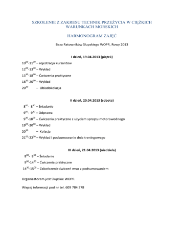 SZKOLENIE Z ZAKRESU TECHNIK PRZEŻYCIA W CIĘŻKICH WARUNKACH MORSKICH HARMONOGRAM ZAJĘĆ Baza Ratowników Słupskiego WOPR, Rowy 2013 I dzień, 19.04.2013 (piątek) 1000-1130 – rejestracja kursantów 1200-1330 – Wykład 1330-1800 – Ćwiczenia praktyczne 1830-2000 – Wykład 2030 – Obiadokolacja II dzień, 20.04.2013 (sobota) 800- 830 – Śniadanie 900- 930 – Odprawa 930-1800 – Ćwiczenia praktyczne z użyciem sprzętu motorowodnego 1900-2000 – Wykład 2030 – Kolacja 2100-2230 – Wykład i podsumowanie dnia treningowego III dzień, 21.04.2013 (niedziela) 800- 830 – Śniadanie 900-1400 – Ćwiczenia praktyczne 1430-1500 – Zakończenie ćwiczeń wraz z podsumowaniem Organizatorem jest Słupskie WOPR. Więcej informacji pod nr tel. 609 784 378