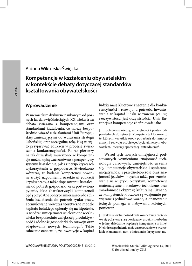 202 VARIA Aldona Wiktorska-Święcka Kompetencje w kształceniu obywatelskim w kontekście debaty dotyczącej standardów kształtowania obywatelskości Wprowadzenie W niemieckim dyskursie naukowym od późnych lat dziewięćdziesiątych XX wieku trwa debata związana z kompetencjami oraz standardami kształcenia, co należy bezpośrednio wiązać z działaniami Unii Europejskiej zmierzającymi do wdrażania strategii lizbońskiej oraz szczególną rolą, jaką zaczęto przypisywać edukacji w procesie zwiększania konkurencyjności. Po raz pierwszy na tak dużą skalę zauważono, że kompetencje można opisywać zarówno z perspektywy systemu kształcenia, jak i z perspektywy ich wykorzystania w gospodarce. Stwierdzono wówczas, że badania kompetencji powinny służyć uzgodnieniu oczekiwań edukacji i rynku pracy, a także dopasowaniu kształcenia do potrzeb gospodarki, oraz postawiono pytanie, jakie charakterystyki kompetencji będą przydatne polityce zmierzającej do zbliżenia kształcenia do potrzeb rynku pracy. Formułowane wówczas teoretyczne modele kapitału ludzkiego opierały się na hipotezie, iż wiedza i umiejętności ucieleśnione w człowieku bezpośrednio zwiększają produktywność i zdolność gospodarki do rozwoju oraz adaptowania nowych technologii1. Takie założenie oznaczało, że inwestycje w kapitał WROCŁAWSKIE STUDIA POLITOLOGICZNE 13/2012 WSP_13_29.05.indb 202 ludzki mają kluczowe znaczenie dla konkurencyjności i rozwoju, a potrzeba inwestowania w kapitał ludzki w zmieniającej się rzeczywistości jest oczywistością. Unia Europejska kompetencje zdefiniowała jako […] połączenie wiedzy, umiejętności i postaw odpowiednich do sytuacji. Kompetencje kluczowe to te, których wszystkie osoby potrzebują do samorealizacji i rozwoju osobistego, bycia aktywnym obywatelem, integracji społecznej i zatrudnienia2. Wśród tych nowych umiejętności podstawowych wymieniono znajomość technologii cyfrowych, umiejętność uczenia się, kompetencje obywatelskie i społeczne, inicjatywność i przedsiębiorczość oraz znajomość języków obcych, a także porozumiewanie się w języku ojczystym, kompetencje matematyczne i naukowo-techniczne oraz świadomość i ekspresję kulturalną. Uznano, że kompetencje kluczowe są wzajemnie powiązane i jednakowo ważne, a opanowanie jednych pomaga w nabywaniu kolejnych, ponieważ [...] zakresy wielu spośród tych kompetencji częściowo się pokrywają i są powiązane, aspekty niezbędne w jednej dziedzinie wspierają kompetencje w innej. Niektóre zagadnienia mają zastosowanie we wszystkich elementach ram odniesienia: krytyczne my- Wrocławskie Studia Politologiczne 13, 2012 © for this edition by CNS 2012-10-09 10:05:00 203 ślenie, kreatywność, inicjatywność, rozwiązywanie problemów, ocena ryzyka, podejmowanie decyzji i konstruktywne kierowanie emocjami są istotne we wszystkich ośmiu kompetencjach kluczowych3. VARIA Tak rozumiane kompetencje kluczowe budują ważny kapitał ludzki jednostki, pomocny w osiąganiu przez nią osobistego samospełnienia i rozwoju, aktywnego włączania się w społeczeństwo oraz znajdowania zatrudnienia. W ten sposób ujmowany kapitał ludzki rozumiany bywa jako czynnik kapitału społecznego. W kontekście powyższych rozważań szczególne znaczenie miały prowadzone w tym okresie debaty związane z kształceniem obywatelskim. Kształcenie obywatelskie w Niemczech jest współcześnie rozumiane bardzo szeroko; w istotnych stanowiskach przyjęto, że jest to pojęcie zbiorcze, obejmujące wszystkie zaplanowane, zorganizowane, systematyczne działania mające na celu wyposażenie jednostki w niezbędną wiedzę i umiejętności do uczestnictwa w życiu politycznym i społecznym (w sensie klasycznego „wychowania” i „edukacji”), jak również gwarantujące jej samodoskonalenie (w sensie „ukształcowalności”, „kształtowania”). Kształcenie obywatelskie to kształcenie do aktywności obywatelskiej w sferze publicznej, w tym politycznej4. Już w ramach wcześniejszej debaty nad programami nauczania w latach sześćdziesiątych XX wieku wyrażano głębokie przekonanie, iż jakość można polepszyć dzięki podniesieniu kwalifikacji. W kształceniu obywatelskim z lat osiemdziesiątych nawiązano do tego przekonania, prowadząc dyskusję nad tym, jakie wnioski można wyciągnąć z tzw. kluczowych problemów (Schlüsselprobleme) i ich rozwiązywania5. Uznawano wówczas, iż należy zająć się głównymi problemami6, mającymi znaczenie dla ludzkiej egzystencji7. Jednak dopiero pod koniec lat dziewięćdziesiątych XX wieku odbyła się zasadnicza dyskusja o kwalifikacjach, jakie należy nabyć w procesie kształcenia obywatelskiego, co doprowadziło do rozwinięcia wielu modeli kompetencyjnych8. Uwzględnić należy tu podział na tzw. kompetencje ogólne (bazowe, podstawowe) oraz specyficzne/specjalistyczne (przedmiotowe), charakterystyczne dla kształcenia obywatelskiego, jak kompetencja kształtowania osądu politycznego9 czy kompetencja demokratyczna i kompetencja politycznej zdolności do działania10. Opracowanie wspomnianych modeli było niezbędne, ponieważ pojęcie kwalifikacji okazało się zbyt wąskie. Wprowadzono wówczas pojęcie kompetencji w szerszym kontekście niż związany wyłącznie z nabywaniem umiejętności zawodowych. Zaczęło ono oznaczać ogólne predyspozycje jednostki do rozwiązywania problemów codzienności, do których zaliczono między innymi zdolność do uczestnictwa w społecznej komunikacji (por. ugruntowane w latach osiemdziesiątych XX wieku pojęcie kompetencji komunikacyjnej sformułowane przez Habermasa). Ponieważ zarysowana problematyka nie znajduje się jak dotąd w centrum debaty dotyczącej kształcenia obywatelskiego w naszym kraju, warto więc upowszechniać zagadnienie kompetencji, szczególnie w kontekście kształcenia obywatelskiego, co ma miejsce w Niemczech po 1990 roku i co z pewnością przyczyn