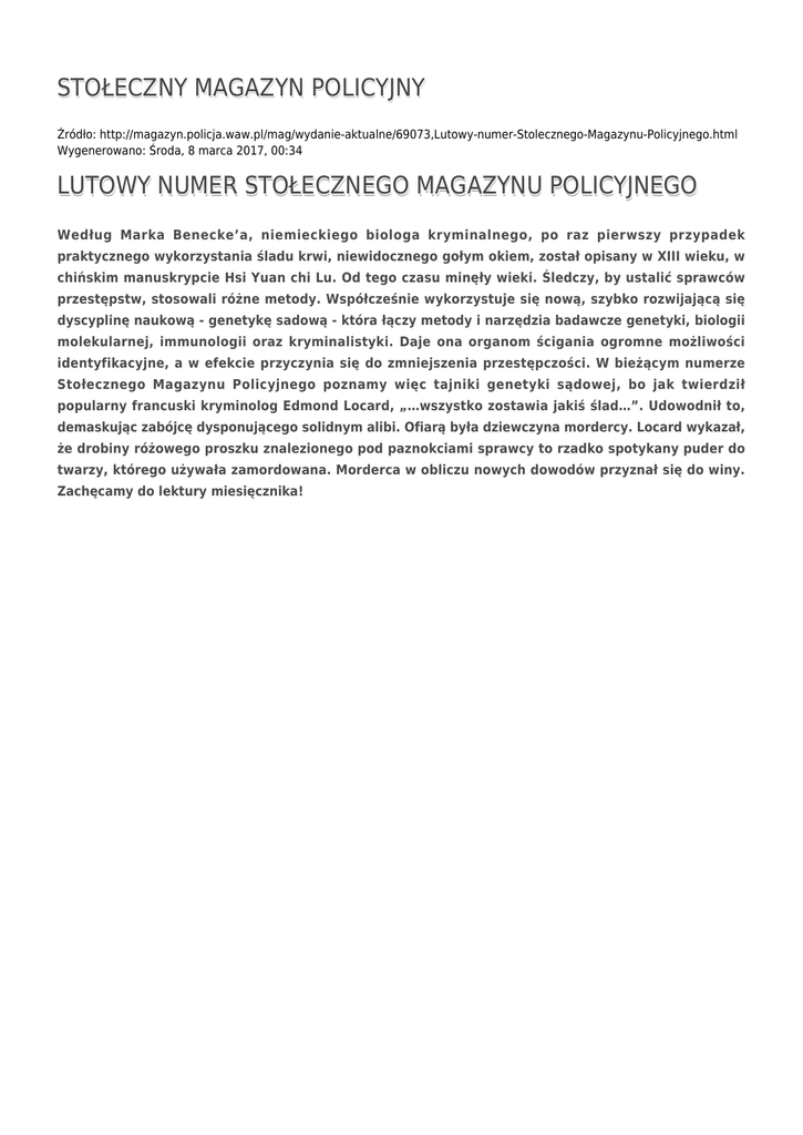 STOŁECZNY MAGAZYN POLICYJNY Źródło: http://magazyn.policja.waw.pl/mag/wydanie-aktualne/69073,Lutowy-numer-Stolecznego-Magazynu-Policyjnego.html Wygenerowano: Środa, 8 marca 2017, 00:34 LUTOWY NUMER STOŁECZNEGO MAGAZYNU POLICYJNEGO Według Marka Benecke’a, niemieckiego biologa kryminalnego, po raz pierwszy przypadek praktycznego wykorzystania śladu krwi, niewidocznego gołym okiem, został opisany w XIII wieku, w chińskim manuskrypcie Hsi Yuan chi Lu. Od tego czasu minęły wieki. Śledczy, by ustalić sprawców przestępstw, stosowali różne metody. Współcześnie wykorzystuje się nową, szybko rozwijającą się dyscyplinę naukową - genetykę sadową - która łączy metody i narzędzia badawcze genetyki, biologii molekularnej, immunologii oraz kryminalistyki. Daje ona organom ścigania ogromne możliwości identyfikacyjne, a w efekcie przyczynia się do zmniejszenia przestępczości. W bieżącym numerze Stołecznego Magazynu Policyjnego poznamy więc tajniki genetyki sądowej, bo jak twierdził popularny francuski kryminolog Edmond Locard, „…wszystko zostawia jakiś ślad…”. Udowodnił to, demaskując zabójcę dysponującego solidnym alibi. Ofiarą była dziewczyna mordercy. Locard wykazał, że drobiny różowego proszku znalezionego pod paznokciami sprawcy to rzadko spotykany puder do twarzy, którego używała zamordowana. Morderca w obliczu nowych dowodów przyznał się do winy. Zachęcamy do lektury miesięcznika! ZAŁĄCZNIKI DO STRONY Stołeczny Magazyn Policyjny - nr 2/2017 11.08 MB Ocena: 0/5 (0) Tweetnij