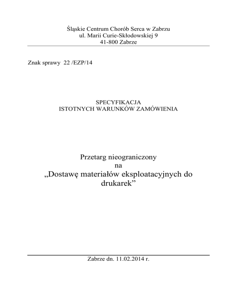 Śląskie Centrum Chorób Serca w Zabrzu ul. Marii Curie-Skłodowskiej 9 41-800 Zabrze Znak sprawy 22 /EZP/14 SPECYFIKACJA ISTOTNYCH WARUNKÓW ZAMÓWIENIA Przetarg nieograniczony na „Dostawę materiałów eksploatacyjnych do drukarek” Zabrze dn. 11.02.2014 r. Śląskie Centrum Chorób Serca w Zabrzu ul. Marii Curie-Skłodowskiej 9 41-800 Zabrze SPECYFIKACJA ISTOTNYCH WARUNKÓW ZAMÓWIENIA Przetarg nieograniczony na „Dostawę materiałów eksploatacyjnych do drukarek” Spis treści : Rozdział 1 Rozdział 2 Rozdział 3 Rozdział 4 Rozdział 5 Rozdział 6 Rozdział 7 Rozdział 8 Rozdział 9 Rozdział 10 Rozdział 11 Rozdział 12 Rozdział 13 Rozdział 14 Rozdział 15 Zamawiający Opis przedmiotu Zamówienia Opis sposobu przygotowania oferty Opis sposobu obliczania ceny oferty Wymagania Zamawiającego Dokumenty wymagane od Wykonawców Kryteria oceny Termin realizacji zamówienia Składanie ofert Tryb udzielania wyjaśnień Termin związania ofertą Otwarcie ofert Osoby upoważnione do kontaktów z Wykonawcami Zagadnienia dotyczące umowy Środki odwoławcze Załączniki ( 1 – 5) - załącznik nr 1 załącznik nr 2 załącznik nr 3 załącznik nr 4 załącznik nr 5 załącznik nr 6 formularz oferty oświadczenie zgodne z wymogami art. 22 ustawy pzp oświadczenie zgodne z wymogami art. 24 ustawy pzp projekt umowy Pakiet Wykaz dostaw 2 I. ZAMAWIAJĄCY Śląskie Centrum Chorób Serca w Zabrzu ul. Marii Curie-Skłodowskiej 9 , 41-800 Zabrze Tel. / Fax . 032/ 373-36-68 Strona internetowa : www.sccs.pl Adres e-mail do kontaktów z Zamawiającym : [email protected] II. OPIS PRZEDMIOTU ZAMÓWIENIA 1. Przedmiot zamówienia obejmuje dostawę materiałów eksploatacyjnych do drukarek zawartych w Pakiecie nr 1 - załącznik nr 5. Oferowane tonery i tusze muszą być oryginalne i nowe. Poprzez określenie "oryginalne i nowe" należy rozumieć tonery i tusze fabrycznie nowe, nieregenerowane, nierefabrykowane, wyprodukowane przez producenta drukarki lub kserokopiarki. Wykonawca posiada prawo przedstawienia w ofercie asortymentu równoważnego, pod warunkiem że posiada on takie same lub lepsze parametry techniczne, jakościowe, wydajnościowe, jak produkt wzorcowy. Wykonawca składając ofertę na materiały równoważne zobowiązany jest wpisać nazwę producenta i wydajność produktu w tabeli formularza cenowego. Zamawiający dokonując szczegółowego opisu przedmiotu zamówienia wskazał przykładowo nazwę handlową (nazwę producenta, typ produktu, wydajność), tym samym wskazał minimalne dopuszczalne parametry oferowanego asortymentu. Wskazana przez Zamawiającego wydajność określana jest zgodnie z normą ISO/IEC 19752 dla kaset z tonerem do drukarek monochromatycznych, ISO/IEC 19798 dla kaset z tonerem do kolorowych drukarek laserowych, oraz ISO/IEC 24711 i ISO/IEC 24712 dla wkładów atramentowych drukujących. W przypadku oferowania materiałów równoważnych, Wykonawca składa wraz z ofertą zaświadczenie producenta, potwierdzające, że wydajność, zgodnie z normą ISO/IEC 19752 dla kaset z tonerem do drukarek monochromatycznych, ISO/IEC 19798 dla kaset z tonerem do kolorowych drukarek laserowych, oraz ISO/IEC 24711 i ISO/IEC 24712 dla wkładów atramentowych drukujących, jest co najmniej taka jak materiału oryginalnego zalecanego przez producentów sprzętu Przez materiał eksploatacyjny równoważny Zamawiający rozumie produkt: fabrycznie nowy, nie regenerowany, pochodzący z bieżącej produkcji, wytworzony seryjnie w cyklu produkcyjnym, zgodnym z normą ISO 9001 oraz ISO 14001 lub normami równoważnymi, opakowany hermetycznie, nie noszący śladów użytkowania, 2. 3. 4. 5. 6. 3 7. 8. 9. 10. który zapewnia jakość wydruku co najmniej taką, jak materiał oryginalny, zalecany przez producenta sprzętu, który nie ogranicza pełnej współpracy z programem sprzętu, monitorującym stan zasobników z tuszem lub tonerem, który w żadnym stopniu nie narusza praw patentowych ani innej własności intelektualnej, w którym do produkcji materiałów eksploatacyjnych nie zostały użyte składniki poprzednio eksploatowane, uzupełniane bądź przerabiane lub pochodzące z recyklingu. Nie dopuszcza się materiałów eksploatacyjnych, w których obudowa, chip bądź jakikolwiek inny element był powtórnie wykorzystany w procesie produkcji materiału, w którym zastosowano toner / tusz dopasowany do pracy z danym urządzeniem. Asortyment równoważny musi spełniać obowiązujące normy i posiadać wszystkie wymagane prawem świadectwa, certyfikaty, charakterystyki. Wszystkie oferowane przez Wykonawcę materiały winny być opatrzone znakiem firmowym producenta, etykietą zawierającą numer katalogowy, kod kreskowy, listę modeli sprzętu do których jest przeznaczony oraz termin ważności. Jeżeli w trakcie realizacji zamówienia Zamawiający stwierdzi, że wydajność lub jakość dostarczonych materiałów eksploatacyjnych równoważnych (tzn. innych niż pochodzące od producenta sprzętu) niekorzystnie odbiega od parametrów produktu oryginalnego, Wykonawca na żądanie Zamawiającego winien oferowany towar wymienić na spełniający wymagania Zamawiającego bez zmiany ceny. Za wadliwy produkt równoważny, stanowiący przedmiot zamówienia, uznaje się w szczególności produkt: w którym stwierdza się wysypany lub wysypujący się tusz/toner, pobrudzone elementy obudowy lub części mechaniczne oferowanego produktu a także produkt brudzący papier po jego zainstalowaniu w urządzeniu drukującym lub części użyte do jego produkcji noszą ślady użytkowania generujący wszelkie pojawiające się na urządzeniu lub pulpicie roboczym stanowiska pracy informacje o braku możliwości zastosowanego tonera, tuszu powodujące niemożność skorzystania z funkcji drukowania lub kopiowania który po zainstalowaniu w sprzęcie, na monitorze oraz panelu kontrolnym sprzętu powoduje pojawienie się negatywnych komunikatów który w przypadku, gdy produkt oryginalny posiada wb
