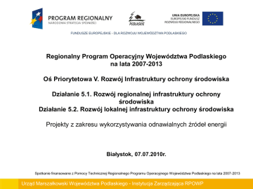 Regionalny Program Operacyjny Województwa Podlaskiego na lata 2007-2013 Oś Priorytetowa V. Rozwój Infrastruktury ochrony środowiska Działanie 5.1. Rozwój regionalnej infrastruktury ochrony środowiska Działanie 5.2. Rozwój lokalnej infrastruktury ochrony środowiska Projekty z zakresu wykorzystywania odnawialnych źródeł energii Białystok, 07.07.2010r. Spotkanie finansowane z Pomocy Technicznej Regionalnego Programu Operacyjnego Województwa Podlaskiego na lata 2007-2013 Urząd Marszałkowski Województwa Podlaskiego - Instytucja Zarządzająca RPOWP Cel główny Osi Priorytetowej V. Rozwój infrastruktury ochrony środowiska Zachowanie dziedzictwa środowiska naturalnego poprzez inwestycje infrastrukturalne zmniejszające negatywne skutki cywilizacji Cel ten zostanie osiągnięty dzięki poprawie jakości powietrza poprzez zmniejszenie ilości zanieczyszczeń, poprawie jakości wód powierzchniowych i podziemnych, minimalizowaniu ilości wytwarzanych odpadów oraz wprowadzeniu systemu ich odzyskiwania i unieszkodliwiania, wzrostowi wykorzystania niekonwencjonalnych źródeł energii, poprawie stanu infrastruktury technicznej na obszarach słabiej rozwiniętych. Spotkanie finansowane z Pomocy Technicznej Regionalnego Programu Operacyjnego Województwa Podlaskiego na lata 2007-2013 Urząd Marszałkowski Województwa Podlaskiego - Instytucja Zarządzająca RPOWP W ramach Działania 5.1. Rozwój regionalnej infrastruktury ochrony środowiska wsparcie otrzymają projekty na obszarach nie objętych interwencją PROW. W ramach Działania 5.2. Rozwój lokalnej infrastruktury ochrony środowiska wsparcie otrzymają projekty na obszarach objętych interwencją PROW. W przypadku, gdy projekt dotyczy działań zarówno na obszarze objętym interwencją PROW, jak i nie objętym interwencją PROW, a Wnioskodawcą jest podmiot inny niż mikro, mały i średni przedsiębiorca o zakwalifikowaniu do Działania 5.1. lub 5.2. decyduje siedziba Wnioskodawcy, zaś w pozostałych przypadkach lokalizacja inwestycji. W przypadku gdy Wnioskodawcą jest mikro, mały i średni przedsiębiorca o zakwalifikowaniu do Działania 5.1. lub 5.2. decyduje lokalizacja inwestycji. Spotkanie finansowane z Pomocy Technicznej Regionalnego Programu Operacyjnego Województwa Podlaskiego na lata 2007-2013 Urząd Marszałkowski Województwa Podlaskiego - Instytucja Zarządzająca RPOWP Zgodnie z zapisami dokumentu Linia demarkacyjna ….. w ramach Programu Rozwoju Obszarów Wiejskich pomoc może być przyznawana na projekty realizowane: w miejscowościach należących do gminy wiejskiej, albo w miejscowościach należących do gminy miejsko-wiejskiej, z wyłączeniem miast powyżej 5 tys. mieszkańców, albo w miejscowościach gminy miejskiej o liczbie mieszkańców mniejszej niż 5 tys. Spotkanie finansowane z Pomocy Technicznej Regionalnego Programu Operacyjnego Województwa Podlaskiego na lata 2007-2013 Urząd Marszałkowski Województwa Podlaskiego - Instytucja Zarządzająca RPOWP BUDŻET DZIAŁANIA i KONKURSU Środki EFRR przeznaczone na Działanie 5.1. Rozwój regionalnej infrastruktury ochrony środowiska – 31 810 394 Euro; Środki EFRR przeznaczone na Działanie 5.2. Rozwój lokalnej infrastruktury ochrony środowiska – 31 810 394 Euro; Środki w ramach konkursu: Działanie 5.1. Rozwój regionalnej infrastruktury ochrony środowiska – 7 000 000 Euro, co na dzień ogłaszania konkursu stanowi 28 430 500 PLN, Działanie 5.2. Rozwój lokalnej infrastruktury ochrony środowiska – 8 000 000 Euro, co na dzień ogłoszenia konkursu stanowi 32 492 000 PLN. Spotkanie finansowane z Pomocy Technicznej Regionalnego Programu Operacyjnego Województwa Podlaskiego na lata 2007-2013 Urząd Marszałkowski Województwa Podlaskiego - Instytucja Zarządzająca RPOWP BUDŻET DZIAŁANIA i KONKURSU c.d. Rezerwa na odwołania w ramach Działania 5.1. Rozwój regionalnej infrastruktury ochrony środowiska – wynosi 10% alokacji tj. 700 000 Euro, co na dzień ogłoszenia konkursu stanowi 2 843 050 PLN; Działania 5.2. Rozwój lokalnej infrastruktury ochrony środowiska – wynosi 10% alokacji tj. 800 000 Euro, co na dzień ogłoszenia konkursu stanowi 3 249 200 PLN. Maksymalny udział środków z UE w wydatkach kwalifikowalnych na poziomie projektu wynosi: − projekty nie objęte pomocą publiczną – max. 85% kosztów kwalifikowalnych, − projekty objęte pomocą publiczną – zgodnie z obowiązującymi w tym zakresie zasadami. W przypadku mikro, małych i średnich przedsiębiorstw zgodnie z Rozporządzeniem MRR z dnia 7 grudnia 2009 r. maksymalna intensywność pomocy wynosi: − 60% kosztów kwalifikowalnych - w przypadku średniego przedsiębiorcy; − 70% kosztów kwalifikowalnych – w przypadku mikroprzedsiębiorcy i małego przedsiębiorcy. Spotkanie finansowane z Pomocy Technicznej Regionalnego Programu Operacyjnego Województwa Podlaskiego na lata 2007-2013 Urząd Marszałkowski Województwa Podlaskiego - Instytucja Zarządzająca RPOWP BUDŻET DZIAŁANIA i KONKURSU c.d. Minimalny wkład własny Beneficjenta: − − projekty nie objęte pomocą publiczną – min. 15% kosztów kwalifikowanych, projekty objęte pomocą publiczną - zgodnie z obowiązującymi w tym zakresie zasadami. W przypadku mikro, małych i średnich przedsiębiorstw zgodnie z Rozporządzeniem MRR z dnia 7 grudnia 2009 r. beneficjent powinien wnieść wkład własny odpowiadający co najmniej 25% wydatków kwalifikowalnych, pochodzący ze środków własnych lub z zewnętrznych źródeł finansowania, w formie pozbawionej wsparcia ze środków publicznych. Dla Beneficjenta będącego jednostką samorządu terytorialnego lub jednostką podległą - we wkładzie własnym środki własne stanowić mają min. 5%. Spotkanie finansowane z Pomocy Technicznej Regionalnego Programu Operacyjnego Województwa Podlaskiego na lata 2007-2013 Urząd Marszałkowski Województwa Podlaskiego - Instytucja Zarządzająca RPOWP Maksymalna / minimalna wartość pr