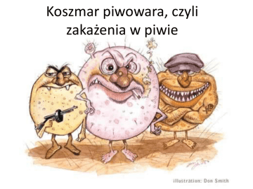 Koszmar piwowara, czyli zakażenia w piwie Plan wykładu • • • • • • • • • • • • • • Parę słów wstępu Objawy zakażenia Charakterystyka zakażających drobnoustrojów: -dzikie drożdże -bakterie Gram ujemne -bakterie Gram dodatnie -killer yeast -inne możliwe zakażenia Biofilm Metody rozpoznawania zakażenia, izolacji i identyfikacji Jak i kiedy dochodzi do zakażenia Wpływ charakterystyki piwa na możliwość zakażenia Minimalizowanie ryzyka Celowe zakażenie piwa – „sour is new hoppy” O co chodzi z zakażeniami w piwie? • Za PWN: zakażenie, infekcja, med. wtargnięcie do ustroju i rozwój w nim zakaźnego czynnika chorobotwórczego • Zakażenia zmieniają właściwości sensoryczne piwa, zazwyczaj w niepożądany sposób • W ekstremalnych przypadkach mogą być niebezpieczne dla zdrowia konsumenta Piwo nie jest przyjaznym środowiskiem • • • • • Niskie pH (około 4,5) Niska zawartość tlenu (warunki beztlenowe) Zawartość alkoholu Chmiel Mała zawartość składników odżywczych • Co innego brzeczka… Zakażenia piw domowych • Zjawisko znacznie bardziej powszechne, niż się sądzi! • „Stopnie” zakażenia: 1. Piwo do wylania, obrzydliwe, niepijalne 2. Piwo pijalne, ale coś w nim nie do końca pasuje 3. Piwo w porządku, osoba po dogłębym szkoleniu sensorycznym wykrywa wadę wynikającą z zakażenia 4. Piwo smakuje lepiej niż nie zakażone Zachowanie drobnoustrojów w piwie E. Żyrek(2008) Zagrożenia mikrobiologiczne przy „aseptycznym” rozlewie piwa Objawy zakażeń • • • • • • • Zmętnienie Smak i zapach octu Zgniłe jaja Kwaśność Wysoki poziom diacetylu Gushing Końska derka/skóra/wełna Dzikie drożdże Bakteria Brettanomyces B. anomalus B. bruxellensis B. claussenii B. custersianus B. lambicus B. naardenensis B. nanuss Opis Efekty zakażenia Preferowane warunki wzrostu podobne jak u drożdży piwnych, potrafią fermentować dekstryny http://withfriendship.com/images/e/21277/ Gushing, aromaty ananasa, jabłka, gruszki, końskiej derki stajni, dymu, apteczne, fekalne. Tworzą błonę na powierzchni http://investigadores.uncoma.edu.ar/ http://www.homebrewtalk.com http://www.homebrewtalk.com http://www.homebrewtalk.com Dzikie drożdże Bakteria Opis Efekty zakażenia Saccharomyces S. cerevisiae var. diastaticus i inne S. bayanus S. pastorianus Preferowane warunki wzrostu podobne jak u drożdży piwnych, potrafią fermentować dekstryny Przegazowanie piwa, aromaty apteczne, goździkowe. Candida, Torulaspora, Pichia, Kluyveromyces Tlenowce, nie potrafią przeprowadzać fermentacji Zmętnienie, produkcja błony na powierzchni, kwas octowy Rhodotorula, Cryptococcus Często wykrywane, ale w normalnych warunkach nie są w stanie zepsuć piwa Zmętnienie Bakterie Obligatoryjne/fakultatywne tlenowce/beztlenowce http://www.e-biotechnologia.pl/ Bakterie Gram ujemne Bakteria Opis Bakterie octowe: Acetobacter A. aceti A. liquefacies A. pastorianus A. hansenii Gluconobacter oxydans Obligatoryjne tlenowce Komórki w postaci pałeczek, występujących w parach bądź łańcuchach. Optymalne warunki wzrostu: 25-30°C, pH 5,4-6,3, wysoka tolerancja na alkohol (G. oxydans nawet do 13%) www.jimsbeerkit.co.uk Efekty zakażenia Zmętnienie i śliskie błony na powierzchni piwa. Utlenianie etanolu, produkcja kwasu octowego i octanów – smak i zapach octu. www.homebrewtalk.com Bakterie Gram ujemne Bakteria Opis Efekty zakażenia Zymomonas mobilis Krótkie pałeczki występujące pojedynczo, w parach lub łańcuchach. Fakultatywne beztlenowce, fermentujące glukozę i fruktozę (ale nie maltozę). Optymalna temperatura wzrostu: 25-30°C, tolerancja alkoholu do 13% Produkcja siarkowodoru i aldehydu octowego, powodują tzw. smak „zgniłego jabłka”. Wytwarzają także etanol, kwas octowy, kwas mlekowy, acetoinę (masło) Obesumbacterium proteus, dawniej Hafnia protea Krótkie pałeczki. Rośnie razem z drożdżami, często obecny w gęstwie. Infekuje wyłącznie brzeczkę, wrażliwe na alkohol, odporne na chmiel. Powoduje niskie odfermentowanie i wysokie pH w piwie. Produkuje DMS, diacetyl i alkohole wyższe. Produkuje także N-nitrosaminy (czynnik kancerogenny) Bakterie Gram ujemne Bakteria Opis Efekty zakażenia Citrobacter freundii Cienkie pałeczki występujące pojedynczo lub w parach, fakultatywnie beztlenowe, fermentują glukozę. Wrażliwe na alkohol, odporne na chmiel. Przyspieszona fermentacja w początkowych stadiach, produkcja kwasów organicznych i DMS. Enterobacter (Rahnella) R. aquatilis E. agglomerans Krótkie pałeczki, fermentują glukozę z produkcją kwasów i gazów. Niska tolerancja na alkohol, odporne na chmiel. Podobne do Obesumbacterium , zakaża gęstwy drożdżowe. Produkuje wysokie ilości diacetylu. Klebsiella terrigena Klebisella oxytoca Cienkie pałeczki występujące pojedynczo, lub w krótkich łańcuchach. Fakultatywne beztlenowce, fermentują glukozę. Wrażliwe na alkohol, odporne na chmiel. Przetwarzają kwas ferulikowy na 4-winylo gwajakol Bakterie Gram ujemne Bakteria Opis Efekty zakażenia Pectinatus cerevisiiphilus Bardzo cienkie zakręcone pałeczki występujące pojedynczo lub w parach. Obligatoryjne beztlenowce, odporne na chmiel. Produkuje siarkowodór i inne związki siarki. Megasphaera cerevisiae Ziarniaki występujące Zapach i smak zgnilizny, pojedynczo lub w krótkich produkcja związków siarki, łańcuchach, obligatoryjne kwasu masłowego. beztlenowce. Wrażliwe na alkohol (powyżej 4%), odporne na chmiel. Bakterie Gram dodatnie Bakteria Opis Efekty zakażenia Lactobacillus L. brevis L. casei L. plantarum L. fermentum L. buchneri L. delbrückii Cienkie pałeczki. Fakultatywne Zmętnienie w piwie, niektóre beztlenowe. Niektóre odporne gatunki produkują na związki chmielu. polisacharydy, co daje efekt lepkiej zawiesiny. Produkują kwas mlekowy, a także kwas octowy, etanol i dwutlenek węgla, potrafią zakwasić brzeczkę Pediococcus P. damnosus P. inopi