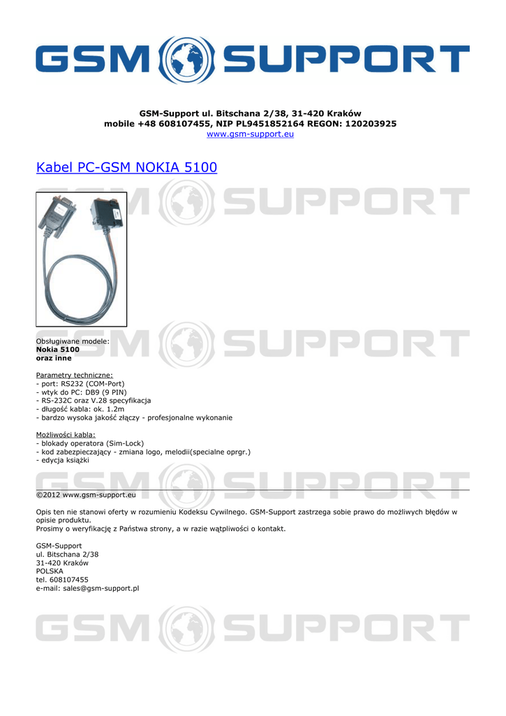GSM-Support ul. Bitschana 2/38, 31-420 Kraków mobile +48 608107455, NIP PL9451852164 REGON: 120203925 www.gsm-support.eu Kabel PC-GSM NOKIA 5100 Obsługiwane modele: Nokia 5100 oraz inne Parametry techniczne: - port: RS232 (COM-Port) - wtyk do PC: DB9 (9 PIN) - RS-232C oraz V.28 specyfikacja - długość kabla: ok. 1.2m - bardzo wysoka jakość złączy - profesjonalne wykonanie Możliwości kabla: - blokady operatora (Sim-Lock) - kod zabezpieczający - zmiana logo, melodii(specialne oprgr.) - edycja książki ©2012 www.gsm-support.eu Opis ten nie stanowi oferty w rozumieniu Kodeksu Cywilnego. GSM-Support zastrzega sobie prawo do możliwych błędów w opisie produktu. Prosimy o weryfikację z Państwa strony, a w razie wątpliwości o kontakt. GSM-Support ul. Bitschana 2/38 31-420 Kraków POLSKA tel. 608107455 e-mail: [email protected] Powered by TCPDF (www.tcpdf.org)