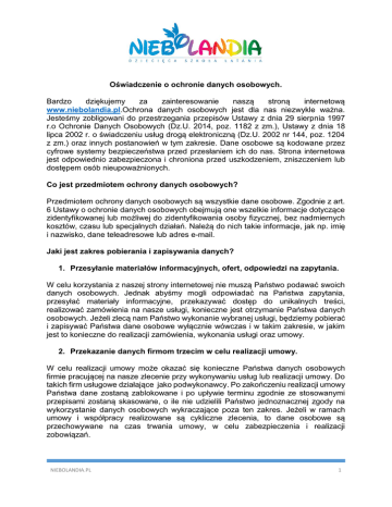 Oświadczenie o ochronie danych osobowych. Bardzo dziękujemy za zainteresowanie naszą stroną internetową www.niebolandia.pl.Ochrona danych osobowych jest dla nas niezwykle ważna. Jesteśmy zobligowani do przestrzegania przepisów Ustawy z dnia 29 sierpnia 1997 r.o Ochronie Danych Osobowych (Dz.U. 2014, poz. 1182 z zm.), Ustawy z dnia 18 lipca 2002 r. o świadczeniu usług drogą elektroniczną (Dz.U. 2002 nr 144, poz. 1204 z zm.) oraz innych postanowień w tym zakresie. Dane osobowe są kodowane przez cyfrowe systemy bezpieczeństwa przed przesłaniem ich do nas. Strona internetowa jest odpowiednio zabezpieczona i chroniona przed uszkodzeniem, zniszczeniem lub dostępem osób nieupoważnionych. Co jest przedmiotem ochrony danych osobowych? Przedmiotem ochrony danych osobowych są wszystkie dane osobowe. Zgodnie z art. 6 Ustawy o ochronie danych osobowych obejmują one wszelkie informacje dotyczące zidentyfikowanej lub możliwej do zidentyfikowania osoby fizycznej, bez nadmiernych kosztów, czasu lub specjalnych działań. Należą do nich takie informacje, jak np. imię i nazwisko, dane teleadresowe lub adres e-mail. Jaki jest zakres pobierania i zapisywania danych? 1. Przesyłanie materiałów informacyjnych, ofert, odpowiedzi na zapytania. W celu korzystania z naszej strony internetowej nie muszą Państwo podawać swoich danych osobowych. Jednak abyśmy mogli odpowiadać na Państwa zapytania, przesyłać materiały informacyjne, przekazywać dostęp do unikalnych treści, realizować zamówienia na nasze usługi, konieczne jest otrzymanie Państwa danych osobowych. Jeżeli zlecą nam Państwo wykonanie wybranej usługi, będziemy pobierać i zapisywać Państwa dane osobowe wyłącznie wówczas i w takim zakresie, w jakim jest to konieczne do realizacji zamówienia, wykonania usługi oraz umowy. 2. Przekazanie danych firmom trzecim w celu realizacji umowy. W celu realizacji umowy może okazać się konieczne Państwa danych osobowych firmie pracującej na nasze zlecenie przy wykonywaniu usług lub realizacji umowy. Do takich firm usługowe działające jako podwykonawcy. Po zakończeniu realizacji umowy Państwa dane zostaną zablokowane i po upływie terminu zgodnie ze stosowanymi przepisami zostaną skasowane, o ile nie udzielili Państwo jednoznacznej zgody na wykorzystanie danych osobowych wykraczające poza ten zakres. Jeżeli w ramach umowy i współpracy realizowane są cykliczne zlecenia, to dane osobowe są przechowywane na czas trwania umowy, w celu zabezpieczenia i realizacji zobowiązań. NIEBOLANDIA.PL 1 3. Wysyłka newslettera. Jeżeli podali Państwo swój adres e-mail w celu przesyłania przez nas newslettera, będziemy wykorzystywać go również dla celów marketingowych, wybiegających poza dystrybucję newslettera, do momentu żądania przez Państwa usunięcia danych z listy subskrypcyjnej. Mogą Państwo w każdej chwili wypisać się z listy subskrypcyjnej zaznaczając odpowiedni tekst w polu otrzymanej wiadomości. 4. Zgłoszenia uczestnictwa w szkoleniach i webinarach Rejestracja uczestnictwa w wydarzeniu wymaga podania danych osobowych, które będą wykorzystywane w celu komunikacji bezpośredniej z uczestnikiem, przesłaniu potwierdzenia uczestnictwa, materiałów informacyjnych, agendy spotkania, dostępu do szkolenia online oraz przypomnienia o zbliżającym się terminie wydarzenia. Dane te będziemy wykorzystywać również w celu przekazywania informacji o nadchodzących wydarzeniach oraz innych reklamowych. Mogą Państwo w każdej chwili wypisać się z listy odbiorców powiadomień zaznaczając odpowiedni tekst w polu otrzymanej wiadomości. Jak są zbierane i wykorzystywane dane użytkowników naszego serwisu www? W celu optymalizacji naszej strony internetowej zbieramy i zapisujemy dane, takie jak np. data wejścia na stronę, strona przekierowująca, z której przeszli Państwo do naszej strony i zbliżone informacje, o ile nie odmówią Państwo zgody na ten rodzaj pobierania i zapisywania danych. Dane te są pobierane anonimowo, bez identyfikowania każdego użytkownika strony. Tworzone są wyłącznie segmenty/ profile użytkowników. Nie ma miejsca łączenia osoby fizycznej oznaczonej danym profilu z zebranymi danymi użytkowymi. W celu gromadzenia i zapisu danych o wykorzystywaniu naszego serwisu www wykorzystujemy pliki cookie. To małe pliki tekstowe zapisywane na Państwa komputerze i służące do zapamiętywania informacji statystycznych, takich jak system operacyjny, przeglądarka internetowa, adres IP, poprzednio oglądana strona internetowa oraz czas wizyty na stronie internetowej. Dane te zbieramy wyłącznie do celów statystycznych i optymalizacyjnych naszej strony www oraz aby uatrakcyjnić naszą ofertę oraz publikowane na niej treści. Dane są zbierane i zapisywane wyłącznie w postaci anonimowej i nie można na ich przypisać do konkretnej osoby. Bez używania Cookies Strony internetowe można również przeglądać bez używania cookies. Jeżeli nie życzą sobie Państwo, abyśmy rozpoznawali Państwa komputer należy wybrać w przeglądarce opcję "nie akceptuj plików cookies". Konsekwencją braku akceptacji na wykorzystywanie plików cookies, może być ograniczenie funkcjonalności naszej strony internetowej i brak dostępu do użytecznych, publikowanych na stronie treści. Mogą Państwo zapobiec instalacji plików cookie przez wprowadzenie odpowiednich NIEBOLANDIA.PL 2 ustawień w swojej przeglądarce internetowej. W tym celu należy wyłączyć funkcję zapisywania cookies. Więcej informacji znajduje się w instrukcji użytkowania każdej przeglądarki internetowej. Możliwości zastosowania danych wyłącznie do określonych celów Przestrzegamy zasad dotyczących wykorzystania danych do określonych celów: dane osobowe naszych klientów przetwarzamy i zapisujemy wyłącznie w celach, dla jakich zostały nam one przekazane. Bez jednoznacznej zgody klienta dane osobowe nie są przekazywane osobom trzecim,