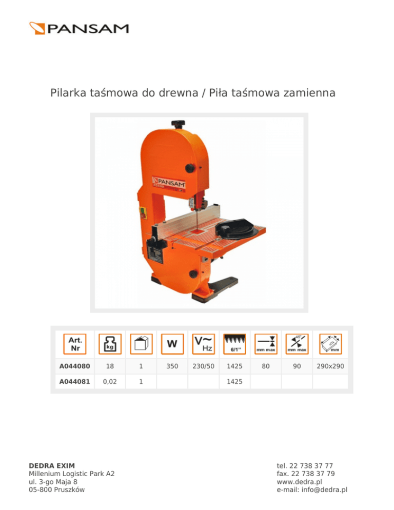 Pilarka taśmowa do drewna / Piła taśmowa zamienna A044080 18 1 A044081 0,02 1 DEDRA EXIM Millenium Logistic Park A2 ul. 3-go Maja 8 05-800 Pruszków 350 230/50 1425 80 90 290x290 1425 tel. 22 738 37 77 fax. 22 738 37 79 www.dedra.pl e-mail: [email protected]