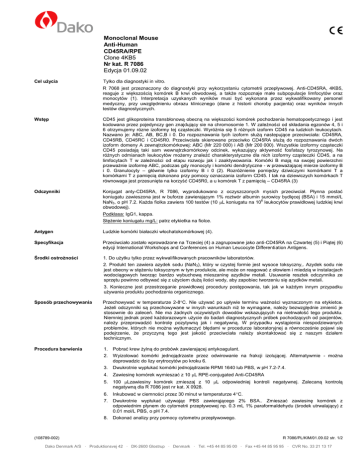 Monoclonal Mouse Anti-Human CD45RA/RPE Clone 4KB5 Nr kat. R 7086 Edycja 01.09.02 Cel użycia Tylko dla diagnostyki in vitro. R 7068 jest przeznaczony do diagnostyki przy wykorzystaniu cytometrii przepływowej. Anti-CD45RA, 4KB5, reaguje z większością komórek B krwi obwodowej, a także rozpoznaje małe subpopulacje limfocytów oraz monocytów (1). Interpretacja uzyskanych wyników musi być wykonana przez wykwalifikowany personel medyczny, przy uwzględnieniu obrazu klinicznego (dane z historii choroby pacjenta) oraz wyników innych testów diagnostycznych. Wstęp CD45 jest glikoproteina transbłonową obecną na większości komórek pochodzenia hematopoetycznego i jest kodowana przez pojedynczy gen znajdujący sie na chromosomie 1. W zależności od składania egzonów 4, 5 i 6 otrzymujemy rózne izoformy tej cząsteczki. Wyróżnia się 5 różnych izoform CD45 na ludzkich leukocytach. Nazwano je: ABC, AB, BC,B i 0. Do rozpoznawania tych izoform służą nastepujące przeciwciała: CD45RA, CD45RB, CD45RC i CD45R0. Przeciwciała skierowane przeciwko CD45RA służą do rozpoznawania dwóch izoform domeny A zewnątrzkomórkowej: ABC (Mr 220 000) i AB (Mr 200 000). Wszystkie izoformy cząsteczki CD45 posiadają taki sam wewnątrzkomórkowy odcinek, wykazujący aktywność fosfatazy tyrozynowej. Na różnych odmianach leukocytów możemy znaleźć charakterystyczne dla nich izoformy cząsteczki CD45, a na limfocytach T w zależności od etapu rozwoju jak i zaaktywowania. Komórki B mają na swojej powierzchni przeważnie izoformę ABC, podczas gdy monocyty i komórki dendrytyczne - w przeważającej mierze izoformy B i 0. Granulocyty – głównie tylko izoformy B i 0 (2). Rozróżnienie pomiędzy dziwiczymi komórkami T a komórkami T z pamięcią dokonano przy pomocy oznaczania izoform CD45. I tak na dziewiczych komórkach T równowaga jest przesunięta na korzyść CD45R0, a u komórek T z pamięcią – CD45RA (3) Odczynniki Konjugat anty-CD45RA, R 7086, wyprodukowano z oczyszczonych mysich przeciwciał. Płynna postać koniugatu zawieszona jest w buforze zawierającym 1% roztwór albumin surowicy bydlęcej (BSA) i 15 mmol/L NaN3, o pH 7.2. Każda fiolka zawiera 100 testów (10 L koniugatu na 106 leukocytów prawidłowej ludzkiej krwi obwodowej). Podklasa: IgG1, kappa. Stężenie koniugatu mg/L: patrz etykietka na fiolce. Antygen Ludzkie komórki białaczki włochatokomórkowej (4). Specyfikacja Przeciwciało zostało wprowadzone na Trzeciej (4) a zagrupowane jako anti-CD45RA na Czwartej (5) i Piątej (6) edycji International Workshops and Conferences on Human Leucocyte Differentiation Antigens. Środki ostrożności 1. Do użytku tylko przez wykwalifikowanych pracowników laboratoriów. 2. Produkt ten zawiera azydek sodu (NaN3), który w czystej formie jest wysoce toksyczny,. Azydek sodu nie jest obecny w stężeniu toksycznym w tym produkcie, ale może on reagować z ołowiem i miedzią w instalacjach wodociągowych tworząc bardzo wybuchową mieszaninę azydków metali. Usuwanie resztek odczynnika ze sprzętu powinno odbywać się z użyciem dużą ilości wody, aby zapobiec tworzeniu się azydków metali. 3. Konieczne jest przestrzeganie prawidłowej procedury postępowania, tak jak w każdym innym przypadku używania produktu pochodzenia organicznego. Sposób przechowywania Przechowywać w temperaturze 2-8C. Nie używać po upływie terminu ważności wyznaczonym na etykietce. Jeżeli odczynniki są przechowywane w innych warunkach niż te wymagane, należy bezwzględnie zmienić je stosownie do zaleceń. Nie ma żadnych oczywistych dowodów wskazujących na nietrwałość tego produktu. Niemniej jednak przed każdorazowym użycie do badań diagnostycznych próbek pochodzących od pacjentów, należy przeprowadzić kontrolę pozytywną jak i negatywną. W przypadku wystąpienia niespodziewanych problemów, których nie można wytłumaczyć błędami w procedurze laboratoryjnej a równocześnie pojawi się podejrzenie, że przyczyną tego jest jakość przeciwciała należy skontaktować się z naszym działem technicznym. Procedura barwienia 1. Pobrać krew żylną do probówk zawierającej antykoagulant. 2. Wyizolować komórki jednojądrzaste przez odwirowanie na frakcji izolującej. Alternatywmie - można doprowadzic do lizy erytrocytów po kroku 6. 3. Dwukrotnie wypłukać komórki jednojądrzaste RPMI 1640 lub PBS, w pH 7.2-7.4. 4. Zawiesinę komórek wymieszać z 10 L RPE-conjugated Anti-CD45RA 5. 100 Lzawiesiny komórek zmieszaj z 10 L odpowiedniej kontroli negatywnej. Zalecaną kontrolą negatywną dla R 7086 jest nr kat. X 0928. 6. Inkubować w ciemności przez 30 minut w temperaturze 4C. 7. Dwukrotnie wypłukać używając PBS zawierąjącego 2% BSA.. Zmieszać zawiesinę komórek z odpowiednim płynem do cytometrii przepływowej np. 0.3 mL 1% paraformaldehydu (środek utrwalający) z 0.01 mol/L PBS, o pH 7.4. 8. Dokonać analizy przy pomocy cytometru przepływowego. (108789-002) R 7086/PL/KIM/01.09.02 str. 1/2 Dako Denmark A/S · Produktionsvej 42 · DK-2600 Glostrup · Denmark · Tel. +45 44 85 95 00 · Fax +45 44 85 95 95 · CVR No. 33 21 13 17 Zaleca się wdrożenie odpowienio przygotowanych próbek, będących kontrolą pozytywną i negatywną dla procedury przygotowaczej oraz badanych próbek. Trzeba pamiętać, że roztwory zawierające fluorochromy są wrażliwe na światło, dlatego też próbki powinny być chronione przed światłem słonecznym przez cały czas w trakcie procedury barwienia aż do zakończenia analizy. Piśmiennictwo 1. Davey FR, Gatter KC, Ralfkiaer E, Pulford KAF, Krissansen GW, Mason DY. Immunophenotyping of nonHodgkin’s lymphomas using a panel of antibodies on paraffin-embedded tissues. Am J Pathol 1987;129: 54-63. 2. Sewell WA, Cooley MA, Hegen M. NL6. CD45 workshop panel report. In: Kishimoto T, Kikutani H, von dem Borne AEG, Goyert SM, Mason DY, Miyasaka M, et al., editors. Leucocyte typing VI. White cell differentiation antigens. 