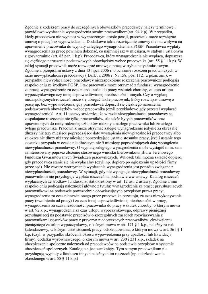Zgodnie z kodeksem pracy do szczególnych obowiązków pracodawcy należy terminowe i prawidłowe wypłacanie wynagrodzenia swoim pracownikom(art. 94 k.p). W przypadku, kiedy pracodawca nie wypłaca w wyznaczonym czasie pensji, pracownik może rozwiązać umowę o pracę bez wypowiedzenia. Dodatkowo takie rozwiązanie umowy nie ma wpływu na uprawnienie pracownika do wypłaty zaległego wynagrodzenia z FGŚP. Pracodawca wypłaty wynagrodzenia za pracę powinien dokonać, co najmniej raz w miesiącu, w stałym i ustalonym z góry terminie (art. 85 par. 1 k.p). Pracodawca, który wynagrodzenia nie wypłaca, dopuszcza się ciężkiego naruszenia podstawowych obowiązków wobec pracownika (art. 55.§ 11 k.p). W takiej sytuacji pracownik może rozwiązać umowę o pracę w trybie natychmiastowym. Zgodnie z przepisami ustawy z dnia 13 lipca 2006 r. o ochronie roszczeń pracowniczych w razie niewypłacalności pracodawcy ( Dz.U. z 2006 r. Nr 158, poz. 1121 z późn. zm.), w przypadku niewypłacalności pracodawcy niezaspokojone roszczenia pracownicze podlegają zaspokojeniu ze środków FGŚP. I tak pracownik może otrzymać z funduszu wynagrodzenie za pracę, wynagrodzenie za czas niezdolności do pracy wskutek choroby, za czas urlopu wypoczynkowego czy innej usprawiedliwionej nieobecności i innych. Czy o wypłatę niezaspokojonych roszczeń może się ubiegać także pracownik, który rozwiązał umowę o pracę np. bez wypowiedzenia, gdy pracodawca dopuścił się ciężkiego naruszenia podstawowych obowiązków wobec pracownika (czyli przykładowo gdy przestał wypłacać wynagrodzenie)? Art. 11 ustawy stwierdza, że w razie niewypłacalności pracodawcy są zaspakajane roszczenia nie tylko pracowników, ale także byłych pracowników oraz uprawnionych do renty rodzinnej członków rodziny zmarłego pracownika lub zmarłego byłego pracownika. Pracownik może otrzymać zaległe wynagrodzenie jedynie za okres nie dłuższy niż trzy miesiące poprzedzające datę wystąpienia niewypłacalności pracodawcy albo za okres nie dłuży niż trzy miesiące poprzedzające ustanie stosunku pracy, jeżeli ustanie tego stosunku przypada w czasie nie dłuższym niż 9 miesięcy poprzedzających datę wystąpienia niewypłacalności pracodawcy. O wypłatę zaległego wynagrodzenia może wystąpić m.in. sam zainteresowany poprzez złożenie stosownego wniosku kierownikowi Biura Terenowego Funduszu Gwarantowanych Świadczeń pracowniczych. Wniosek taki można składać dopiero, gdy pracodawca stanie się niewypłacalny (czyli np. dopiero po ogłoszeniu upadłości firmy przez sąd). Nie zawsze wstrzymanie wypłacania wynagrodzenia jest ponadto związane z niewypłacalnością pracodawcy. W sytuacji, gdy nie występuje niewypłacalność pracodawcy pracownikom nie przysługuje wypłata roszczeń na podstawie ww ustawy. Katalog roszczeń wypłacanych ze środków funduszu został określony w art. 12 ust. 2 ustawy. Zgodnie z nim zaspokojeniu podlegają należności główne z tytułu: wynagrodzenia za pracę; przysługujących pracownikowi na podstawie powszechnie obowiązujących przepisów prawa pracy: wynagrodzenia za czas niezawinionego przez pracownika przestoju, za czas niewykonywania pracy (zwolnienia od pracy) i za czas innej usprawiedliwionej nieobecności w pracy, wynagrodzenia za czas niezdolności pracownika do pracy wskutek choroby, o którym mowa w art. 92 k.p., wynagrodzenia za czas urlopu wypoczynkowego, odprawy pieniężnej przysługującej na podstawie przepisów o szczególnych zasadach rozwiązywania z pracownikami stosunków pracy z przyczyn niedotyczących pracowników, ekwiwalentu pieniężnego za urlop wypoczynkowy, o którym mowa w art. 171 § 1 k.p., należny za rok kalendarzowy, w którym ustał stosunek pracy, odszkodowania, o którym mowa w art. 361 § 1 k.p. (czyli w przypadku skrócenia okresu wypowiedzenia przy upadłości lub likwidacji firmy), dodatku wyrównawczego, o którym mowa w art. 230 i 231 k.p., składek na ubezpieczenia społeczne należnych od pracodawców na podstawie przepisów o systemie ubezpieczeń społecznych. Katalog ten jest zamknięty. Tym samym pracownikom nie przysługują wypłaty z funduszu innych należnych im roszczeń (np. odszkodowania określonego w art. 55 § 11 k.p.) Zwolnienie dyscyplinarne w okresie wypowiedzenia. Według przepisów kodeksu pracy pracodawca, który rozwiązał z pracownikiem umowę o pracę za wypowiedzeniem, ma też prawo rozwiązać z nim tę umowę w trybie natychmiastowym (bez wypowiedzenia). W sytuacji niezgodnego z prawem zwolnienia w trybie natychmiastowym w okresie wypowiedzenia pracownikowi nie przysługuje roszczenie o przywrócenie do pracy na poprzednich warunkach. Może jednak wystąpić o odszkodowanie. Podstawowym oraz najczęściej stosowanym sposobem rozwiązania umowy o pracę jest jej rozwiązanie za wypowiedzeniem. Strony mogą rozwiązać w ten sposób umowy zawarte na czas nieokreślony oraz na okres próbny. Ponadto w ten sposób może zostać rozwiązana także umowa na czas określony, ale tylko w sytuacji, gdy jest ona zawarta na okres dłuższy niż 6 miesięcy oraz informacja o takim rozwiązaniu znalazła się w umowie. Rozwiązanie umowy w powyższy sposób następuje z upływem okresu wypowiedzenia. Oznacza to, że przez cały okres wypowiedzenia pracownik musi pracować na dotychczasowych warunkach, a pracodawca musi go przez ten okres zatrudniać i wypłacać mu należne wynagrodzenie. Okres wypowiedzenia jest różny w zależności od rodzaju zawartej umowy oraz okresu zatrudnienia pracownika. W przypadku umów na czas nieokreślony wynosi 2 tygodnie jeżeli pracownik był zatrudniony krócej niż 6 miesięcy; 1 miesiąc - jeżeli pracownik był zatrudniony co najmniej 6 miesięcy; 3 miesiące - jeżeli pracownik był zatrudniony co najmniej 3 lata. Kodeks pracy przewiduje ponadto także m.in. rozwiązanie umowy bez wypowiedzenia z winy pracownika w razie: ciężkiego naruszenia przez pr