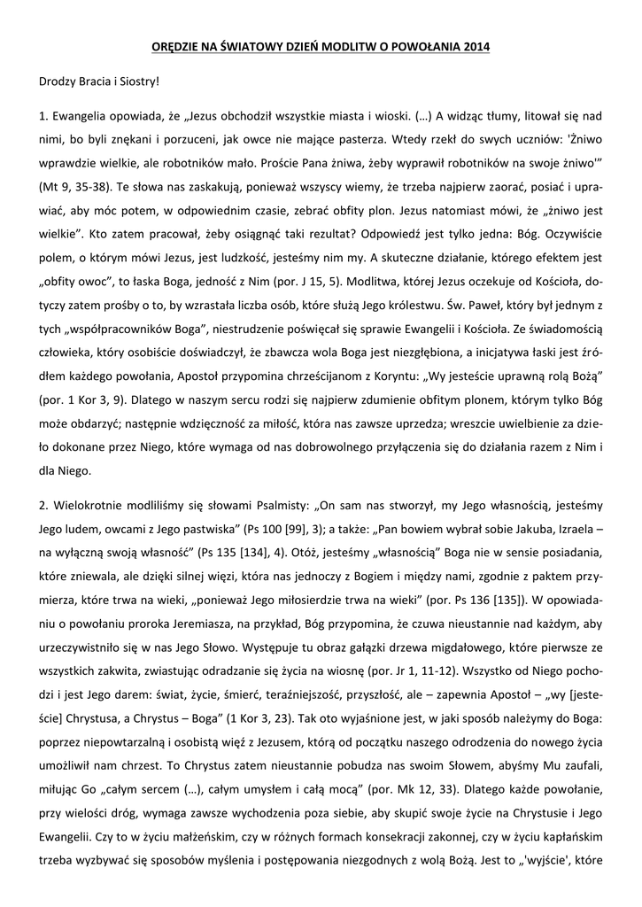 ORĘDZIE NA ŚWIATOWY DZIEŃ MODLITW O POWOŁANIA 2014 Drodzy Bracia i Siostry! 1. Ewangelia opowiada, że „Jezus obchodził wszystkie miasta i wioski. (…) A widząc tłumy, litował się nad nimi, bo byli znękani i porzuceni, jak owce nie mające pasterza. Wtedy rzekł do swych uczniów: 'Żniwo wprawdzie wielkie, ale robotników mało. Proście Pana żniwa, żeby wyprawił robotników na swoje żniwo'” (Mt 9, 35-38). Te słowa nas zaskakują, ponieważ wszyscy wiemy, że trzeba najpierw zaorać, posiać i uprawiać, aby móc potem, w odpowiednim czasie, zebrać obfity plon. Jezus natomiast mówi, że „żniwo jest wielkie”. Kto zatem pracował, żeby osiągnąć taki rezultat? Odpowiedź jest tylko jedna: Bóg. Oczywiście polem, o którym mówi Jezus, jest ludzkość, jesteśmy nim my. A skuteczne działanie, którego efektem jest „obfity owoc”, to łaska Boga, jedność z Nim (por. J 15, 5). Modlitwa, której Jezus oczekuje od Kościoła, dotyczy zatem prośby o to, by wzrastała liczba osób, które służą Jego królestwu. Św. Paweł, który był jednym z tych „współpracowników Boga”, niestrudzenie poświęcał się sprawie Ewangelii i Kościoła. Ze świadomością człowieka, który osobiście doświadczył, że zbawcza wola Boga jest niezgłębiona, a inicjatywa łaski jest źródłem każdego powołania, Apostoł przypomina chrześcijanom z Koryntu: „Wy jesteście uprawną rolą Bożą” (por. 1 Kor 3, 9). Dlatego w naszym sercu rodzi się najpierw zdumienie obfitym plonem, którym tylko Bóg może obdarzyć; następnie wdzięczność za miłość, która nas zawsze uprzedza; wreszcie uwielbienie za dzieło dokonane przez Niego, które wymaga od nas dobrowolnego przyłączenia się do działania razem z Nim i dla Niego. 2. Wielokrotnie modliliśmy się słowami Psalmisty: „On sam nas stworzył, my Jego własnością, jesteśmy Jego ludem, owcami z Jego pastwiska” (Ps 100 [99], 3); a także: „Pan bowiem wybrał sobie Jakuba, Izraela – na wyłączną swoją własność” (Ps 135 [134], 4). Otóż, jesteśmy „własnością” Boga nie w sensie posiadania, które zniewala, ale dzięki silnej więzi, która nas jednoczy z Bogiem i między nami, zgodnie z paktem przymierza, które trwa na wieki, „ponieważ Jego miłosierdzie trwa na wieki” (por. Ps 136 [135]). W opowiadaniu o powołaniu proroka Jeremiasza, na przykład, Bóg przypomina, że czuwa nieustannie nad każdym, aby urzeczywistniło się w nas Jego Słowo. Występuje tu obraz gałązki drzewa migdałowego, które pierwsze ze wszystkich zakwita, zwiastując odradzanie się życia na wiosnę (por. Jr 1, 11-12). Wszystko od Niego pochodzi i jest Jego darem: świat, życie, śmierć, teraźniejszość, przyszłość, ale – zapewnia Apostoł – „wy [jesteście] Chrystusa, a Chrystus – Boga” (1 Kor 3, 23). Tak oto wyjaśnione jest, w jaki sposób należymy do Boga: poprzez niepowtarzalną i osobistą więź z Jezusem, którą od początku naszego odrodzenia do nowego życia umożliwił nam chrzest. To Chrystus zatem nieustannie pobudza nas swoim Słowem, abyśmy Mu zaufali, miłując Go „całym sercem (…), całym umysłem i całą mocą” (por. Mk 12, 33). Dlatego każde powołanie, przy wielości dróg, wymaga zawsze wychodzenia poza siebie, aby skupić swoje życie na Chrystusie i Jego Ewangelii. Czy to w życiu małżeńskim, czy w różnych formach konsekracji zakonnej, czy w życiu kapłańskim trzeba wyzbywać się sposobów myślenia i postępowania niezgodnych z wolą Bożą. Jest to „'wyjście', które skierowuje nas na drogę adoracji Pana i służenia Mu w braciach i w siostrach” (Przemówienie do Międzynarodowej Unii Przełożonych Generalnych, 8 maja 2013 r.). Dlatego wszyscy jesteśmy wezwani do adorowania Chrystusa w naszych sercach (por. 1 P 3, 15), aby mógł nas dosięgnąć impuls łaski, zawarty w ziarnie Słowa, które musi w nas wzrastać i przemieniać się w konkretną służbę bliźniemu. Nie powinniśmy się lękać: Bóg z pasją i umiejętnie opiekuje się dziełem, które wyszło spod Jego rąk, w każdej fazie życia. Nigdy nas nie opuszcza! Zależy Mu na tym, by urzeczywistnił się Jego zamysł w stosunku do nas, a w każdym razie zamierza go realizować za naszą zgodą i przy naszej współpracy. 3. Także dzisiaj Jezus żyje i wędruje w naszych realiach zwyczajnego życia, aby zbliżyć się do wszystkich, poczynając od ostatnich, i uzdrowić nas z naszych ułomności i chorób. Teraz zwracam się do osób, które są gotowe wsłuchiwać się w głos Chrystusa, rozbrzmiewający w Kościele, aby zrozumieć, jakie jest ich powołanie. Zachęcam was do słuchania Jezusa i pójścia za Nim, do pozwolenia, aby wasze wnętrze zostało przemienione przez Jego słowa, które „są duchem i są życiem” (J 6, 63). Maryja, Matka Jezusa i nasza, mówi także do nas: „Zróbcie wszystko, cokolwiek wam powie” (J 2, 5). Przyniesie wam pożytek włączenie się z ufnością w drogę wspólnotową, która potrafi wyzwolić w was i wokół was najlepsze energie. Powołanie jest owocem, który dojrzewa na dobrze uprawianym gruncie miłości wzajemnej, która wyraża się poprzez służenie sobie nawzajem w kontekście autentycznego życia kościelnego. Żadne powołanie nie rodzi się samo z siebie ani nie żyje dla siebie. Powołanie rodzi się z serca Boga i kiełkuje na dobrym gruncie wiernego ludu, w doświadczeniu miłości braterskiej. Czyż Jezus nie powiedział: „Po tym wszyscy poznają, żeście uczniami moimi, jeśli będziecie się wzajemnie miłowali” (J 13, 35)? 4. Drodzy bracia i siostry, życie według tej „wysokiej miary zwyczajnego życia chrześcijańskiego” (Jan Paweł II, List apostolski Novo millennio ineunte, 31) oznacza niekiedy, że trzeba iść pod prąd i można także napotykać przeszkody, poza nami i w nas. Sam Jezus nas przestrzega: dobre ziarno Słowa Bożego często zostaje skradzione przez Złego, stłumio