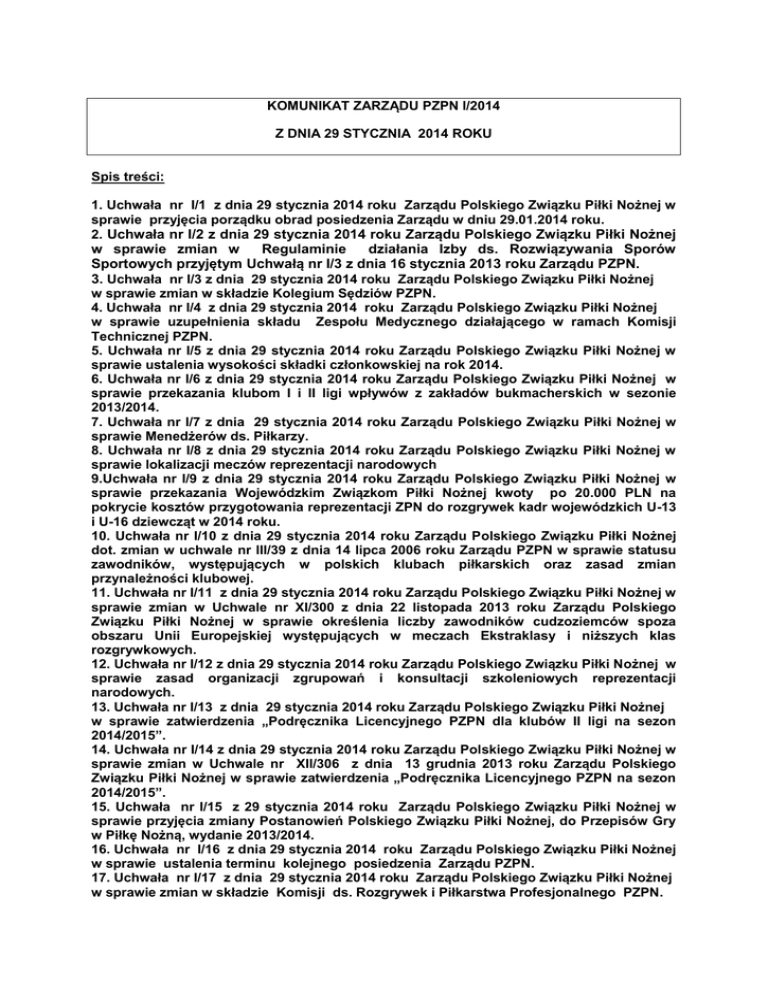 KOMUNIKAT ZARZĄDU PZPN I/2014 Z DNIA 29 STYCZNIA 2014 ROKU Spis treści: 1. Uchwała nr I/1 z dnia 29 stycznia 2014 roku Zarządu Polskiego Związku Piłki Nożnej w sprawie przyjęcia porządku obrad posiedzenia Zarządu w dniu 29.01.2014 roku. 2. Uchwała nr I/2 z dnia 29 stycznia 2014 roku Zarządu Polskiego Związku Piłki Nożnej w sprawie zmian w Regulaminie działania Izby ds. Rozwiązywania Sporów Sportowych przyjętym Uchwałą nr I/3 z dnia 16 stycznia 2013 roku Zarządu PZPN. 3. Uchwała nr I/3 z dnia 29 stycznia 2014 roku Zarządu Polskiego Związku Piłki Nożnej w sprawie zmian w składzie Kolegium Sędziów PZPN. 4. Uchwała nr I/4 z dnia 29 stycznia 2014 roku Zarządu Polskiego Związku Piłki Nożnej w sprawie uzupełnienia składu Zespołu Medycznego działającego w ramach Komisji Technicznej PZPN. 5. Uchwała nr I/5 z dnia 29 stycznia 2014 roku Zarządu Polskiego Związku Piłki Nożnej w sprawie ustalenia wysokości składki członkowskiej na rok 2014. 6. Uchwała nr I/6 z dnia 29 stycznia 2014 roku Zarządu Polskiego Związku Piłki Nożnej w sprawie przekazania klubom I i II ligi wpływów z zakładów bukmacherskich w sezonie 2013/2014. 7. Uchwała nr I/7 z dnia 29 stycznia 2014 roku Zarządu Polskiego Związku Piłki Nożnej w sprawie Menedżerów ds. Piłkarzy. 8. Uchwała nr I/8 z dnia 29 stycznia 2014 roku Zarządu Polskiego Związku Piłki Nożnej w sprawie lokalizacji meczów reprezentacji narodowych 9.Uchwała nr I/9 z dnia 29 stycznia 2014 roku Zarządu Polskiego Związku Piłki Nożnej w sprawie przekazania Wojewódzkim Związkom Piłki Nożnej kwoty po 20.000 PLN na pokrycie kosztów przygotowania reprezentacji ZPN do rozgrywek kadr wojewódzkich U-13 i U-16 dziewcząt w 2014 roku. 10. Uchwała nr I/10 z dnia 29 stycznia 2014 roku Zarządu Polskiego Związku Piłki Nożnej dot. zmian w uchwale nr III/39 z dnia 14 lipca 2006 roku Zarządu PZPN w sprawie statusu zawodników, występujących w polskich klubach piłkarskich oraz zasad zmian przynależności klubowej. 11. Uchwała nr I/11 z dnia 29 stycznia 2014 roku Zarządu Polskiego Związku Piłki Nożnej w sprawie zmian w Uchwale nr XI/300 z dnia 22 listopada 2013 roku Zarządu Polskiego Związku Piłki Nożnej w sprawie określenia liczby zawodników cudzoziemców spoza obszaru Unii Europejskiej występujących w meczach Ekstraklasy i niższych klas rozgrywkowych. 12. Uchwała nr I/12 z dnia 29 stycznia 2014 roku Zarządu Polskiego Związku Piłki Nożnej w sprawie zasad organizacji zgrupowań i konsultacji szkoleniowych reprezentacji narodowych. 13. Uchwała nr I/13 z dnia 29 stycznia 2014 roku Zarządu Polskiego Związku Piłki Nożnej w sprawie zatwierdzenia „Podręcznika Licencyjnego PZPN dla klubów II ligi na sezon 2014/2015”. 14. Uchwała nr I/14 z dnia 29 stycznia 2014 roku Zarządu Polskiego Związku Piłki Nożnej w sprawie zmian w Uchwale nr XII/306 z dnia 13 grudnia 2013 roku Zarządu Polskiego Związku Piłki Nożnej w sprawie zatwierdzenia „Podręcznika Licencyjnego PZPN na sezon 2014/2015”. 15. Uchwała nr I/15 z 29 stycznia 2014 roku Zarządu Polskiego Związku Piłki Nożnej w sprawie przyjęcia zmiany Postanowień Polskiego Związku Piłki Nożnej, do Przepisów Gry w Piłkę Nożną, wydanie 2013/2014. 16. Uchwała nr I/16 z dnia 29 stycznia 2014 roku Zarządu Polskiego Związku Piłki Nożnej w sprawie ustalenia terminu kolejnego posiedzenia Zarządu PZPN. 17. Uchwała nr I/17 z dnia 29 stycznia 2014 roku Zarządu Polskiego Związku Piłki Nożnej w sprawie zmian w składzie Komisji ds. Rozgrywek i Piłkarstwa Profesjonalnego PZPN. 18. Uchwała nr I/18 z dnia 29 stycznia 2014 roku Zarządu Polskiego Związku Piłki Nożnej w sprawie uzupełnienia składu Komisji Licencji Klubowych PZPN. 1 Uchwała nr I/1 z dnia 29 stycznia 2014 roku Zarządu Polskiego Związku Piłki Nożnej w sprawie przyjęcia porządku obrad posiedzenia Zarządu w dniu 29.01.2014 roku Na podstawie art. 36 § 1 pkt 23) Statutu PZPN postanawia się, co następuje: I.Przyjmuje się porządek obrad posiedzenia Zarządu w dniu 29.01.2014 roku, stanowiący załącznik do niniejszej Uchwały. II.Niniejsza Uchwała wchodzi w życie z dniem podjęcia. Prezes PZPN Zbigniew Boniek 2 Uchwała nr I/2 z dnia 29 stycznia 2014 roku Zarządu Polskiego Związku Piłki Nożnej w sprawie zmian w Regulaminie działania Izby ds. Rozwiązywania Sporów Sportowych przyjętym Uchwałą nr I/3 z dnia 16 stycznia 2013 roku Zarządu PZPN I.Na podstawie art. 36 § 1 pkt 8), w zw. z art. 46 § 10 i art. 45 §1 pkt 5) Statutu PZPN, wprowadza się następujące zmiany w Regulaminie działania Izby ds. Rozwiązywania Sporów Sportowych, przyjętym Uchwałą nr I/3 z dnia 16 stycznia 2013 roku Zarządu PZPN: 1.W art. 1 dodaje się ust. 3 w następującym brzmieniu: 3.Właściwość Izby ds. Rozwiązywania Sporów Sportowych jest wyłączona jedynie w przypadku, w którym do PZPN wpłynie żądanie wydania ITC (International Transfer Certifikate), a spór dotyczy tego wystąpienia. 2.W art. 3 dodaje się ust. 7 w następującym brzmieniu: 7.Izba ds. Rozwiązywania Sporów Sportowych orzeka na sesjach. Sesje powinny się odbywać raz w tygodniu w okresie przerw między rozgrywkami, zaś w pozostałym okresie - w razie konieczności. 3.W art. 6 w ust. 1 kropkę zastępuje się przecinkiem oraz dodaje się dalszą część zdania w następującym brzmieniu: w szczególności poprzez sprawdzenie w systemie TMS (Transfer Matching System), czy w odniesieniu do strony postępowania będącej zawodnikiem lub zawodniczką uprawiającym/ą sport piłki nożnej wpłynęło żądanie wydania ITC. 4.W art. 7 po ust. 1 dodaje się ust. 1a: 1a.Przewodniczący zapewni obsadę sesji poprzez wyznaczenie składów orzekających z uwzględnieniem równomiernego obciążenia członków Izby. 5.W art. 10 dodaje się ust. 4 i 5 w następującym brzmieniu: 4.Strona może złożyć wniosek o wyłączenie jedynie dwóch członków Izby. Dalsze wnioski o wyłączen