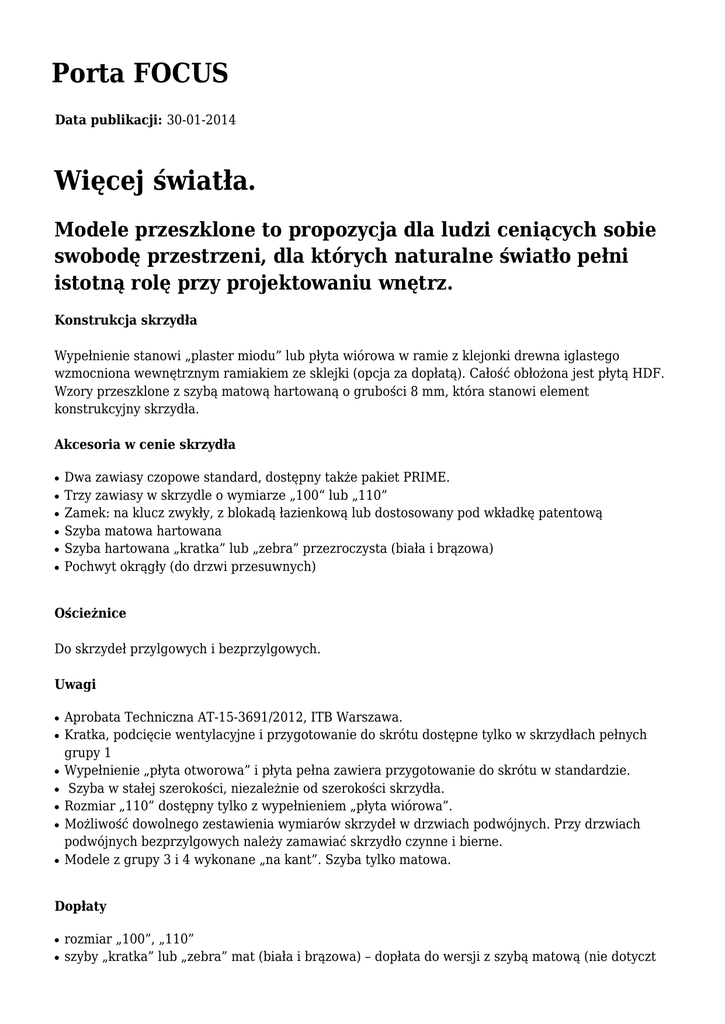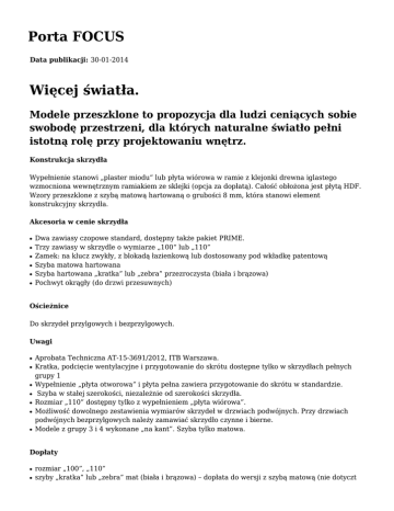Porta FOCUS Data publikacji: 30-01-2014 Więcej światła. Modele przeszklone to propozycja dla ludzi ceniących sobie swobodę przestrzeni, dla których naturalne światło pełni istotną rolę przy projektowaniu wnętrz. Konstrukcja skrzydła Wypełnienie stanowi „plaster miodu” lub płyta wiórowa w ramie z klejonki drewna iglastego wzmocniona wewnętrznym ramiakiem ze sklejki (opcja za dopłatą). Całość obłożona jest płytą HDF. Wzory przeszklone z szybą matową hartowaną o grubości 8 mm, która stanowi element konstrukcyjny skrzydła. Akcesoria w cenie skrzydła ● ● ● ● ● ● Dwa zawiasy czopowe standard, dostępny także pakiet PRIME. Trzy zawiasy w skrzydle o wymiarze „100“ lub „110” Zamek: na klucz zwykły, z blokadą łazienkową lub dostosowany pod wkładkę patentową Szyba matowa hartowana Szyba hartowana „kratka” lub „zebra” przezroczysta (biała i brązowa) Pochwyt okrągły (do drzwi przesuwnych) Ościeżnice Do skrzydeł przylgowych i bezprzylgowych. Uwagi ● ● ● ● ● ● ● Aprobata Techniczna AT-15-3691/2012, ITB Warszawa. Kratka, podcięcie wentylacyjne i przygotowanie do skrótu dostępne tylko w skrzydłach pełnych grupy 1 Wypełnienie „płyta otworowa” i płyta pełna zawiera przygotowanie do skrótu w standardzie. Szyba w stałej szerokości, niezależnie od szerokości skrzydła. Rozmiar „110” dostępny tylko z wypełnieniem „płyta wiórowa”. Możliwość dowolnego zestawienia wymiarów skrzydeł w drzwiach podwójnych. Przy drzwiach podwójnych bezprzylgowych należy zamawiać skrzydło czynne i bierne. Modele z grupy 3 i 4 wykonane „na kant”. Szyba tylko matowa. Dopłaty ● ● rozmiar „100”, „110” szyby „kratka” lub „zebra” mat (biała i brązowa) – dopłata do wersji z szybą matową (nie dotyczt ● ● ● ● ● ● ● ● modeli 4 A, 4 B) wypełnienie płytą wiórową otworową kratka, tuleje wentylacyjne lub podcięcie wentylacyjne zawiasy PRIME (dotyczy dedykowanych ościeżnic) zamek z czołem połysk (srebrny lub złoty) przy gotowanie do skrótu (maksymalnie 60 mm) zamek hakowy z pochwytami bocznymi (drzwi przesuwne) nakładki na zawiasy standard (komplet na jedną sztukę) klamka z szyldem Kolorystyka