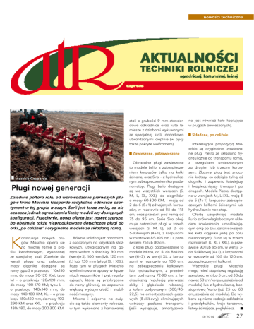 nowości techniczne stali o grubości 9 mm standardowe odkładnice oraz kute lemiesze z dziobami wykuwanymi ze specjalnej stali, dodatkowo utwardzanymi cieplnie (w opcji także pokryte wolframem). fot. Maschio Gaspardo Zawieszane, półzawieszane Maschio Gaspardo Pługi nowej generacji Zaledwie półtora roku od wprowadzenia pierwszych pługów firma Maschio Gaspardo radykalnie odświeża asortyment w tej grupie maszyn. Serii jest teraz mniej, co nie oznacza jednak ograniczenia liczby modeli czy dostępnych konfiguracji. Przeciwnie, nowa oferta jest nawet szersza, bo obejmuje także nieprodukowane dotychczas pługi do orki „po caliźnie” i oryginalne modele ze składaną ramą. K onstrukcja nowych pługów Maschio opiera się na mocnej ramie o profilu kwadratowym, wykonanej ze specjalnej stali. Zależnie do wersji pługa oraz zalecanej mocy ciągnika dostępne są ramy typu S o przekroju 110x110 mm, do mocy 90-120 KM; typu M – o przekroju 120x120 mm, do mocy 100-170 KM; typu L – o przekroju 140x140 mm, do mocy 140-180 KM; XL – o przekroju 150x150 mm, do mocy 190290 KM oraz XXL – o przekroju 180x180, do mocy 200-300 KM. Równie solidna jest obrotnica, z osadzonym na łożyskach stożkowych, utwardzanym na gorąco wałem o średnicy 90 mm (wersje S), 100 mm (M), 120 mm (L) lub 130 mm (pługi XL i XXL). Poza tym w pługach Maschio wyeliminowano spawy w łączeniach wsporników i płyt regulacyjnych, które są przykręcane do ramy głównej, co zapewnia większą wytrzymałość i stabilność maszyny. Mocne i odporne na zużycie są także elementy robocze, w tym wykonane z hartowanej Obracalne pługi zawieszane to modele Lelio, z zabezpieczeniem korpusów tylko na kołki ścinane, oraz Siro – z hydraulicznym zabezpieczeniem korpusów non-stop. Pługi Lelio dostępne są we wszystkich wersjach (S, M, L, XL, XXL), do ciągników o mocy 60-300 KM, i mają od 2 do 6 (5+1) zdwojonych korpusów, w rozstawie od 85 do 115 cm, oraz prześwit pod ramą od 75 do 95 cm. Seria Siro obejmuje natomiast pługi w trzech wersjach (S, M, L), od 2- do 5-skibowych (4+1), z korpusami w rozstawie 85-105 cm i z prześwitem 75 lub 80 cm. Z kolei pługi półzawieszane to modele Mirco, od 5- do 8-skibowe (6+2), w wersji XL, z korpusami w rozstawie co 100 cm, na zabezpieczeniu kołkowym lub hydraulicznym, z prześwitem pod ramą 72-90 cm, z hydrauliczną regulacją pierwszej skiby i głębokości roboczej, z kołem podporowym (500/4522,5) na amortyzatorach gazowych (8-skibowy) eliminujących wstrząsy podczas transportu (jeśli występuje, amortyzowa- ne jest również koło kopiujące w pługach zawieszanych). Składane, po caliźnie Interesująca propozycją Maschio są oryginalne, zawieszane pługi Pietro ze składaną hydraulicznie do transportu ramą, z przegubem umieszczonym za drugim lub trzecim korpusem. Złożony pług jest znacznie krótszy, co odciąża tylną oś ciągnika i zapewnia łatwiejszy i bezpieczniejszy transport po drogach. Modele Pietro, dostępne w wersjach M, L i XL, mają 3 do 5 (4+1) korpusów zabezpieczonych kołkami ścinanymi lub hydraulicznie non-stop. Ofertę uzupełniają modele Furio z równoległobocznym układem zawieszenia, umożliwiającym orkę po tzw. caliźnie (wszystkie koła ciągnika jadą po polu niezaoranym). Furio są w trzech rozmiarach (L, XL i XXL), o prześwicie 90 lub 95 cm, w wersji 3do 5-skibowej (4+1), z korpusami w rozstawie od 105 do 120 cm, zabezpieczonymi kołkami. Wszystkie pługi Maschio mogą mieć stopniową regulację szerokości orki (co 5 cm, od 30 do nawet 50 cm/korpus, zależnie od modelu) lub z hydrauliczną, bezstopniową Vario (już 25 do 60 cm, zależnie od modelu). Do wyboru są różne rodzaje odkładnic i przedpłużków, kroje tarczowe, listwy ścinające, pogłębiacz. 13/2014 27