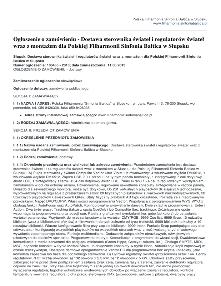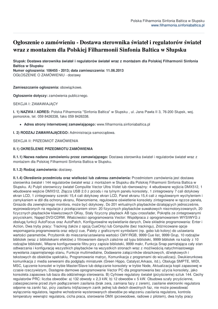 Polska Filharmonia Sinfonia Baltica w Słupsku www.filharmonia.sinfoniabaltica.pl Ogłoszenie o zamówieniu - Dostawa sterownika świateł i regulatorów świateł wraz z montażem dla Polskiej Filharmonii Sinfonia Baltica w Słupsku Słupsk: Dostawa sterownika świateł i regulatorów świateł wraz z montażem dla Polskiej Filharmonii Sinfonia Baltica w Słupsku Numer ogłoszenia: 106455 - 2013; data zamieszczenia: 11.06.2013 OGŁOSZENIE O ZAMÓWIENIU - dostawy Zamieszczanie ogłoszenia: obowiązkowe. Ogłoszenie dotyczy: zamówienia publicznego. SEKCJA I: ZAMAWIAJĄCY I. 1) NAZWA I ADRES: Polska Filharmonia "Sinfonia Baltica" w Słupsku , ul. Jana Pawła II 3, 76-200 Słupsk, woj. pomorskie, tel. 059 8426338, faks 059 8426338. Adres strony internetowej zamawiającego: www.filharmonia.sinfoniabaltica.pl I. 2) RODZAJ ZAMAWIAJĄCEGO: Administracja samorządowa. SEKCJA II: PRZEDMIOT ZAMÓWIENIA II.1) OKREŚLENIE PRZEDMIOTU ZAMÓWIENIA II.1.1) Nazwa nadana zamówieniu przez zamawiającego: Dostawa sterownika świateł i regulatorów świateł wraz z montażem dla Polskiej Filharmonii Sinfonia Baltica w Słupsku. II.1.2) Rodzaj zamówienia: dostawy. II.1.4) Określenie przedmiotu oraz wielkości lub zakresu zamówienia: Przedmiotem zamówienia jest dostawa sterownika świateł i 144 regulatorów świateł wraz z montażem w Słupsku dla Polskiej Filharmonii Sinfonia Baltica w Słupsku. A) Pulpit sterowniczy świateł Compulite Vector Ultra Violet lub równoważny: 4 wbudowane wyjścia DMX512, 1 wbudowane wejście DMX512, Złącza USB 2.0 z przodu i na tylnym panelu konsolety, 1 zintegrowany 7 cali dotykowy ekran LCD, 1 zintegrowany szeroki 15,4 cali dotykowy ekran LCD, Panel ekranu 15,4 cali z regulowanym wychyleniem i zamykaniem w dół dla ochrony ekranu, Równomierne, regulowane oświetlenie konsolety zintegrowane w rączce panela, Gniazdo dla zewnętrznego monitora, może być dotykowy, Do 201 wirtualnych playbacków działających jednocześnie, wyprowadzonych na regulacje z przełączaniem stron: 20 fizycznych playbacków suwakowych niezmotoryzowanych, 20 fizycznych playbacków klawiszowych QKey, Stały fizyczny playback AB typu crossfader, Pokrętła ze zintegrowanymi przyciskami, Napęd DVD/CDRW. Właściwości oprogramowania Vector: Współpraca z oprogramowaniem WYSIWYG z obsługą funkcji AutoFocus oraz AutoPatch, Konfigurowalne wyświetlanie danych, Dwie składnie programowania: Enter i Action, Dwa tryby pracy: Tracking (także z opcją CueOnly) lub Compulite (bez trackingu), Zróżnicowane opcje wspomagania programowania oraz edycji cue, Palety z graficznymi symbolami (np. gobo lub kolory) do ustawiania wartości parametrów, Przybornik do mieszania/ustawiania wartości CMY/RGB, 9999 Cue list, 9999 Grup, 10 rodzajów bibliotek (wraz z bibliotekami efektów) z filtrowaniem danych zależnie od typu biblioteki, 9999 bibliotek na każdy z 10 rodzajów biblioteki, Własne konfigurowanie filtru przy zapisie biblioteki, 9999 makr, Funkcja Snap pamiętająca cały stan odtwarzania i konfigurację wszystkich playbacków na wszystkich stronach wraz z możliwością natychmiastowego wywołania zapamiętanego stanu, Funkcje multimedialne, Dodawanie załączników obrazkowych, dźwiękowych i tekstowych do obiektów spektaklu, Programowanie matryc, Komunikacja z programami do wizualizacji, Dwukierunkowa komunikacja z media serwerami dla podglądu miniaturek (Green Hippo, Catalyst,Arkaos, itd.), Obsługa SMPTE, MIDI, MSC, Łączenie konsolet w trybie Master/Slave lub dołączanie konsolety w trybie Node, Aktualizacja kopii zapasowej w czasie rzeczywistym, Dostępne darmowe oprogramowanie Vector PC dla programowania bez użycia konsolety, jako konsoleta zapasowa lub baza dla oddzielnego sterowania. B) Cyfrowe regulatory świateł (przyścienne) sztuk 144. Cechy regulatorów PRC: liczba obwodów: a) 132 obwody x 2,3 kW, b) 12 obwodów x 5 kW. Obudowa szafy przyścienne, zabezpieczenie przed złym podłączeniem zasilania (brak zera, zamiana fazy z zerem), zasilanie elektroniki regulatora odporne na zaniki faz, przy zasilaniu trójfazowym zanik jednej lub dwóch dowolnych faz, nie może powodować wyłączenia regulatora, łagodne wchodzenie wysterowanych obwodów po włączeniu zasilania regulatora, kontrola temperatury wewnątrz regulatora, cicha praca, sterowanie DMX (przewodowe, radiowe z pilotem), dwa tryby pracy temperatury wewnątrz regulatora, cicha praca, sterowanie DMX (przewodowe, radiowe z pilotem), dwa tryby pracy regulatora: prosty i standardowy, wyświetlacz ustawień regulatora, podgląd napięć zasilających i temperatury regulatora, polska instrukcja obsługi, polskie lub angielskie menu i napisy na wyświetlaczu. Uwaga: a) montaż, połączenie i uruchomienie regulatorów i sterownika świateł w Słupsku należy do sprzedającego ww. sprzęt (regulatory świateł znajdują się na zapleczu sceny, natomiast sterownik świateł umieszczony jest w kabinie akustyka, elektryka po przeciwnej stronie sceny, na końcu sali widowiskowej), b) zamawiający oczekuje od sprzedającego przeprowadzenia podstawowego przeszkolenia pracowników Filharmonii w zakresie obsługi sterownika i regulatorów.. II.1.6) Wspólny Słownik Zamówień (CPV): 31.00.00.00-6. II.1.7) Czy dopuszcza się złożenie oferty częściowej: nie. II.1.8) Czy dopuszcza się złożenie oferty wariantowej: nie. II.2) CZAS TRWANIA ZAMÓWIENIA LUB TERMIN WYKONANIA: Zakończenie: 25.08.2013. SEKCJA III: INFORMACJE O CHARAKTERZE PRAWNYM, EKONOMICZNYM, FINANSOWYM I TECHNICZNYM III.1) WADIUM Informacja na temat wadium: Zamawiający nie wymaga wniesienia wadium III.2) ZALICZKI III.3) WARUNKI UDZIAŁU W POSTĘPOWANIU ORAZ OPIS SPOSOBU DOKONYWANIA OCENY SPEŁNIANIA TYCH WARUNKÓW III. 3.1) Uprawnienia do wykonywania określonej działalności lub czynności, jeżeli przepisy prawa nakładają obowiązek ich posiadania Opis sposobu dokonywania oceny spełniania tego warunku Ocena spełnienia warunku dokonana zostanie na podsta