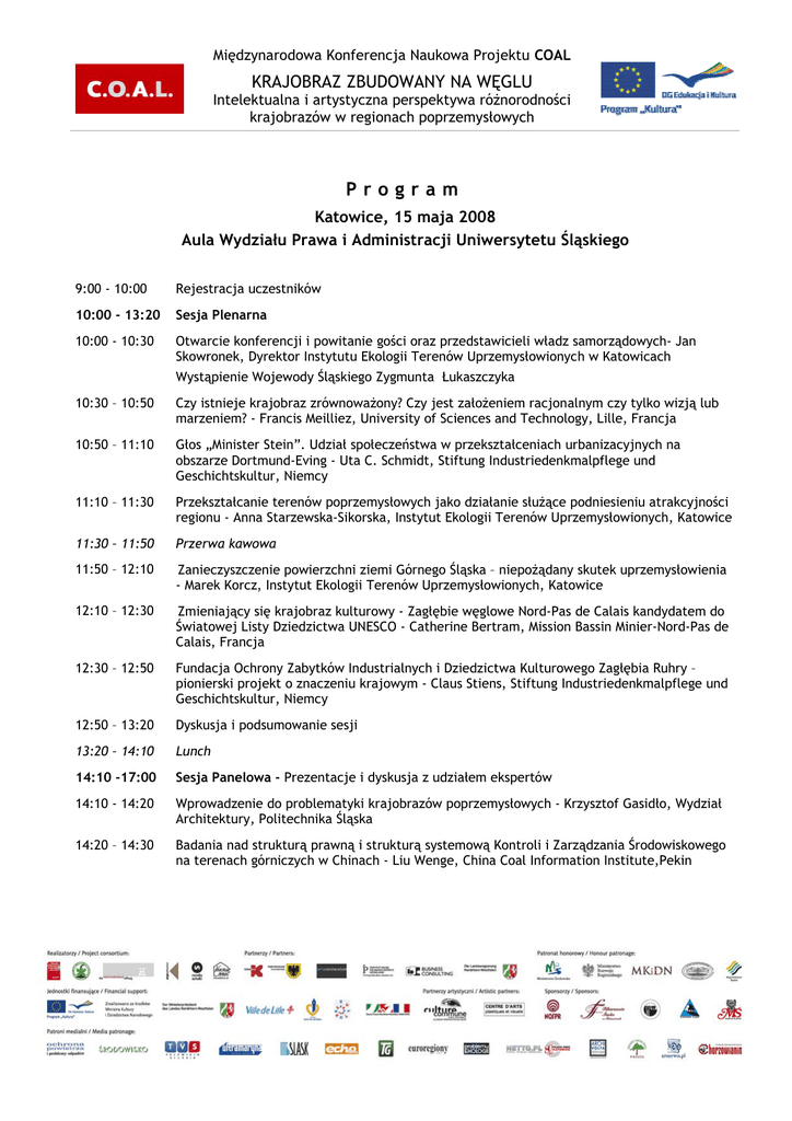 Międzynarodowa Konferencja Naukowa Projektu COAL KRAJOBRAZ ZBUDOWANY NA WĘGLU Intelektualna i artystyczna perspektywa różnorodności krajobrazów w regionach poprzemysłowych Program Katowice, 15 maja 2008 Aula Wydziału Prawa i Administracji Uniwersytetu Śląskiego 9:00 - 10:00 Rejestracja uczestników 10:00 - 13:20 Sesja Plenarna 10:00 - 10:30 Otwarcie konferencji i powitanie gości oraz przedstawicieli władz samorządowych- Jan Skowronek, Dyrektor Instytutu Ekologii Terenów Uprzemysłowionych w Katowicach Wystąpienie Wojewody Śląskiego Zygmunta Łukaszczyka 10:30 – 10:50 Czy istnieje krajobraz zrównoważony? Czy jest założeniem racjonalnym czy tylko wizją lub marzeniem? - Francis Meilliez, University of Sciences and Technology, Lille, Francja 10:50 – 11:10 Głos „Minister Stein”. Udział społeczeństwa w przekształceniach urbanizacyjnych na obszarze Dortmund-Eving - Uta C. Schmidt, Stiftung Industriedenkmalpflege und Geschichtskultur, Niemcy 11:10 – 11:30 Przekształcanie terenów poprzemysłowych jako działanie służące podniesieniu atrakcyjności regionu - Anna Starzewska-Sikorska, Instytut Ekologii Terenów Uprzemysłowionych, Katowice 11:30 – 11:50 Przerwa kawowa 11:50 – 12:10 Zanieczyszczenie powierzchni ziemi Górnego Śląska – niepożądany skutek uprzemysłowienia - Marek Korcz, Instytut Ekologii Terenów Uprzemysłowionych, Katowice 12:10 – 12:30 Zmieniający się krajobraz kulturowy - Zagłębie węglowe Nord-Pas de Calais kandydatem do Światowej Listy Dziedzictwa UNESCO - Catherine Bertram, Mission Bassin Minier-Nord-Pas de Calais, Francja 12:30 – 12:50 Fundacja Ochrony Zabytków Industrialnych i Dziedzictwa Kulturowego Zagłębia Ruhry – pionierski projekt o znaczeniu krajowym - Claus Stiens, Stiftung Industriedenkmalpflege und Geschichtskultur, Niemcy 12:50 – 13:20 Dyskusja i podsumowanie sesji 13:20 – 14:10 Lunch 14:10 -17:00 Sesja Panelowa - Prezentacje i dyskusja z udziałem ekspertów 14:10 - 14:20 Wprowadzenie do problematyki krajobrazów poprzemysłowych - Krzysztof Gasidło, Wydział Architektury, Politechnika Śląska 14:20 – 14:30 Badania nad strukturą prawną i strukturą systemową Kontroli i Zarządzania Środowiskowego na terenach górniczych w Chinach - Liu Wenge, China Coal Information Institute,Pekin Międzynarodowa Konferencja Naukowa Projektu COAL KRAJOBRAZ ZBUDOWANY NA WĘGLU Intelektualna i artystyczna perspektywa różnorodności krajobrazów w regionach poprzemysłowych Program Katowice, 15 maja 2008 Aula Wydziału Prawa i Administracji Uniwersytetu Śląskiego 14:10 -17:00 Sesja Panelowa - Prezentacje i dyskusja z udziałem ekspertów 14:30 – 14:40 MAGIA ENERGII- kreowanie nowej tożsamości dziedzictwa przemysłowego-przypadek Elektrownia Szombierki - Krzysztof Roman, Zespół Elektrociepłowni Bytom S.A. 14:40 – 14:50 Zabytki techniki jako element krajobrazu poprzemysłowego - Jacek Owczarek, Śląskie Centrum Dziedzictwa Kulturowego w Katowicach 14:50 – 15:00 W którym momencie rodzi się tożsamość miejsca? - Elżbieta Błeszyńska-Koclęga, Wydział Architektury, Politechnika Śląska 15:00 – 15:10 Heterogeniczna nowoczesność górnośląskiego "krajobrazu zbudowanego na węglu - Ryszard Niekonieczny, Wydział Architektury, Politechnika Śląska 15:10 – 15:40 Przerwa kawowa 15:40 – 15:50 „Wartość” przyrodnicza zwałowisk odpadów poprzemysłowych - Adam Rostański, Wydział Biologii, Uniwersytet Śląski 15:50 – 16:00 Druga zmiana - rewitalizacja nie tylko materialna - Monika Paca, Galeria Szyb Wilson 16:00 – 16:10 Przekształcenia krajobrazów postindustrialnych na przykładzie warsztatów studenckich pt. „Zagospodarowanie budynków i terenu po byłej KWK Wawel w Rudzie Śląskiej” - Aleksandra Postawa, Aneta Wiatr, Wydział Architektury, Politechnika Śląska 16:10 – 17:00 Podsumowanie i zamknięcie konferencji – Krzysztof Gasidło- Politechnika Śląska, Justyna Gorgoń - Instytut Ekologii Terenów Uprzemysłowionych
