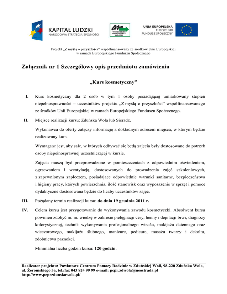 Projekt „Z myślą o przyszłości” współfinansowany ze środków Unii Europejskiej w ramach Europejskiego Funduszu Społecznego Załącznik nr 1 Szczegółowy opis przedmiotu zamówienia „Kurs kosmetyczny” I. Kurs kosmetyczny dla 2 osób w tym 1 osoby posiadającej umiarkowany stopień niepełnosprawności – uczestników projektu „Z myślą o przyszłości” współfinansowanego ze środków Unii Europejskiej w ramach Europejskiego Funduszu Społecznego. II. Miejsce realizacji kursu: Zduńska Wola lub Sieradz. Wykonawca do oferty załączy informację z dokładnym adresem miejsca, w którym będzie realizowany kurs. Wymagane jest, aby sale, w których odbywać się będą zajęcia były dostosowane do potrzeb osoby niepełnosprawnej uczestniczącej w kursie. Zajęcia muszą być przeprowadzone w pomieszczeniach z odpowiednim oświetleniem, ogrzewaniem i wentylacją, dostosowanych do prowadzenia zajęć szkoleniowych, z zapewnionym zapleczem, posiadające odpowiednie warunki sanitarne, bezpieczeństwa i higieny pracy, których powierzchnia, ilość stanowisk oraz wyposażenie w sprzęt i pomoce dydaktyczne dostosowana będzie do liczby uczestników zajęć. III. Pożądany termin realizacji kursu: do dnia 19 grudnia 2011 r. IV. Celem kursu jest przygotowanie do wykonywania zawodu kosmetyczki. Absolwent kursu powinien zdobyć m. in. wiedzę w zakresie pielęgnacji cery, henny i depilacji brwi, diagnozy kolorystycznej, technik wykonywania profesjonalnego wizażu, makijażu dziennego oraz wieczorowego, makijażu ślubnego, manicure, pedicure, masażu twarzy i dekoltu, zdobnictwa paznokci. Minimalna liczba godzin kursu: 120 godzin. Realizator projektu: Powiatowe Centrum Pomocy Rodzinie w Zduńskiej Woli, 98-220 Zduńska Wola, ul. Żeromskiego 3a, tel./fax 043 824 99 99 e-mail: [email protected] http://www.pcprzdunskawola.pl/ Projekt „Z myślą o przyszłości” współfinansowany ze środków Unii Europejskiej w ramach Europejskiego Funduszu Społecznego V. Kadra szkoląca W ramach organizacji i realizacji kursu wykonawca ma obowiązek zapewnić minimum 1 wykładowcę posiadającego odpowiednie kwalifikacje do przeprowadzenia kursu, który posiada kwalifikacje zawodowe, doświadczenie i wykształcenie umożliwiające realizację kursu. Kwalifikacje i umiejętności wykładowcy powinny być adekwatne do zakresu programowego prowadzonego przez niego zajęć. VI. Ponadto: 1. Wykonawca zapewni uczestnikom w dniach kursu drobny poczęstunek (np. kawa, herbata, woda mineralna, ciastka lub podobne) oraz ciepły posiłek, do czasu trwania kursu nie wlicza się przerw kawowych, przerw obiadowych, ani też innych przerw technicznych. 2. Wykonawca w koszcie kursu uwzględni wszelkie akcesoria kosmetyczne oraz materiały do stylizacji paznokci. 3. Wykonawca zobowiązany jest w przypadku organizacji kursu w Sieradzu zapewnić uczestnikom kursu transport ze Zduńskiej Woli (zbiórka pod siedzibą PCPR-u) do miejsca odbywania kursu i z powrotem. Koszty transportu należy ująć w koszcie kursu. 4. Wykonawca zobowiązany jest zapewnić ubezpieczenie uczestników w drodze na kurs, podczas jego trwania i z powrotem. Koszt ubezpieczenia NW należy ująć w koszcie kursu. 5. Wykonawca zobowiązany jest do przygotowania i druku materiałów dydaktycznych (dla każdego uczestnika kursu: program kursu i harmonogram zajęć zbindowane lub w inny sposób połączone, materiały szkoleniowe, długopis, notatnik, dodatkowe multimedialne lub/i papierowe materiały dydaktyczne oraz jeden komplet tak przygotowanych materiałów dla Zamawiającego, z naniesionymi odpowiednio logotypami, których wzór Wykonawca otrzyma od Zamawiającego. Realizator projektu: Powiatowe Centrum Pomocy Rodzinie w Zduńskiej Woli, 98-220 Zduńska Wola, ul. Żeromskiego 3a, tel./fax 043 824 99 99 e-mail: [email protected] http://www.pcprzdunskawola.pl/ Projekt „Z myślą o przyszłości” współfinansowany ze środków Unii Europejskiej w ramach Europejskiego Funduszu Społecznego 6. Wykonawca zobowiązuje się do przeprowadzenia wśród uczestników szkolenia ankiety ewaluacyjnej na początku i na zakończenie szkolenia, oznaczonej odpowiednimi logotypami, których wzór otrzyma od Zamawiającego. 7. Wykonawca jest odpowiedzialny za zebranie wszystkich wypełnionych przez uczestników szkolenia ankiet i przekazanie ich Zamawiającemu po zakończeniu szkolenia. 8. Wykonawca zobowiązany jest umożliwić Zamawiającemu oznakowanie miejsca szkolenia oraz sal, w których prowadzone będą zajęcia, logo Unii Europejskiej, Europejskiego Funduszu Społecznego, Wojewódzkiego Urzędu Pracy w Łodzi, nazwą realizatora, nazwą programu i tytułem projektu oraz zamieszczenia informacji o współfinansowaniu projektu ze środków Unii Europejskiej w ramach Europejskiego Funduszu Społecznego. 9. Wykonawca w uzgodnieniu z Zamawiającym, wystawi uczestnikowi kursu zaświadczenie (certyfikat) uczestnictwa w kursie z logo Unii Europejskiej, EFS, Wojewódzkiego Urzędu Pracy w Łodzi, nazwą realizatora, tytułem projektu i nazwą programu. 10. Uczestnik na zakończenie kursu otrzyma zaświadczenie potwierdzające jego ukończenie na druku zgodnym z §6 Rozporządzenia Ministra Edukacji i Nauki z dnia 3 lutego 2006 r. w sprawie uzyskiwania i uzupełniania przez osoby dorosłe wiedzy ogólnej, umiejętności i kwalifikacji zawodowych w formach pozaszkolnych (Dz. U. Nr 31, poz. 216). VII. 1. Zamawiający zastrzega sobie prawo do zmiany liczby uczestników szkolenia, w sytuacji wystąpienia okoliczności niezależnych i nie zawinionych od Zamawiającego. 2. Zamawiający zobowiązuje się do poinformowania Wykonawcy o ostatecznej liczbie uczestników szkolenia na dwa dni przed planowanym rozpoczęciem szkolenia. Realizator projektu: Powiatowe Centrum Pomocy Rodzinie w Zduńskiej Woli, 98-220 Zduńska Wola, ul. Żeromskiego 3a, tel./fax 043 824 99 99 e-mail: [email protected] http://www.pcprzdunskawola.pl/ Projekt „Z myślą o przyszłoś