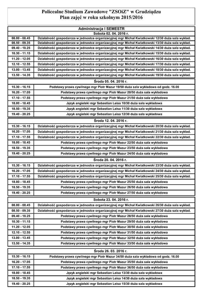 Policealne Studium Zawodowe "ZSOiZ" w Grudziądzu Plan zajęć w roku szkolnym 2015/2016 Administracja I SEMESTR Sobota 02. 04. 2016 r. 08.00 - 08.45 08.50 - 09.35 Działalność gospodarcza w jednostce organizacyjnej mgr Michał Kwiatkowski 12/30 duża sala wykład. Działalność gospodarcza w jednostce organizacyjnej mgr Michał Kwiatkowski 13/30 duża sala wykład. 09.40 - 10.25 Działalność gospodarcza w jednostce organizacyjnej mgr Michał Kwiatkowski 14/30 duża sala wykład. 10.30 - 11.15 Działalność gospodarcza w jednostce organizacyjnej mgr Michał Kwiatkowski 15/30 duża sala wykład. 11.20 - 12.05 Działalność gospodarcza w jednostce organizacyjnej mgr Michał Kwiatkowski 16/30 duża sala wykład. 12.10 - 12.55 Działalność gospodarcza w jednostce organizacyjnej mgr Michał Kwiatkowski 17/30 duża sala wykład. 13.00 - 13.45 Działalność gospodarcza w jednostce organizacyjnej mgr Michał Kwiatkowski 18/30 duża sala wykład. 13.50 - 14.35 Działalność gospodarcza w jednostce organizacyjnej mgr Michał Kwiatkowski 19/30 duża sala wykład. Środa 05. 04. 2016 r. 15.30 - 16.15 Podstawy prawa cywilnego mgr Piotr Mazur 19/50 duża sala wykładowa od godz. 16.00 16.20 - 17.05 Podstawy prawa cywilnego mgr Piotr Mazur 20/50 duża sala wykładowa 17.10 - 17.55 Podstawy prawa cywilnego mgr Piotr Mazur 21/50 duża sala wykładowa 18.00 - 18.45 Język angielski mgr Sebastian Leisa 10/30 duża sala wykładowa 18.50 - 19.35 Język angielski mgr Sebastian Leisa 11/30 duża sala wykładowa 19.40 - 20.25 Język angielski mgr Sebastian Leisa 12/30 duża sala wykładowa Środa 12. 04. 2016 r. 15.30 - 16.15 Działalność gospodarcza w jednostce organizacyjnej mgr Michał Kwiatkowski 20/30 duża sala wykład. 16.20 - 17.05 Działalność gospodarcza w jednostce organizacyjnej mgr Michał Kwiatkowski 21/30 duża sala wykład. 17.10 - 17.55 Działalność gospodarcza w jednostce organizacyjnej mgr Michał Kwiatkowski 22/30 duża sala wykład. 18.00 - 18.45 Podstawy prawa cywilnego mgr Piotr Mazur 22/50 duża sala wykładowa 18.50 - 19.35 Podstawy prawa cywilnego mgr Piotr Mazur 23/50 duża sala wykładowa 19.40 - 20.25 Podstawy prawa cywilnego mgr Piotr Mazur 24/50 duża sala wykładowa Środa 20. 04. 2016 r. 15.30 - 16.15 Działalność gospodarcza w jednostce organizacyjnej mgr Michał Kwiatkowski 23/30 duża sala wykład. 16.20 - 17.05 Działalność gospodarcza w jednostce organizacyjnej mgr Michał Kwiatkowski 24/30 duża sala wykład. 17.10 - 17.55 Działalność gospodarcza w jednostce organizacyjnej mgr Michał Kwiatkowski 25/30 duża sala wykład. 18.00 - 18.45 Podstawy prawa cywilnego mgr Piotr Mazur 25/50 duża sala wykładowa 18.50 - 19.35 Podstawy prawa cywilnego mgr Piotr Mazur 26/50 duża sala wykładowa 19.40 - 20.25 Podstawy prawa cywilnego mgr Piotr Mazur 27/50 duża sala wykładowa Sobota 23. 04. 2016 r. 08.00 - 08.45 Działalność gospodarcza w jednostce organizacyjnej mgr Michał Kwiatkowski 26/30 duża sala wykład. 08.50 - 09.35 Działalność gospodarcza w jednostce organizacyjnej mgr Michał Kwiatkowski 27/30 duża sala wykład. 09.40 - 10.25 Podstawy prawa cywilnego mgr Piotr Mazur 28/50 duża sala wykładowa 10.30 - 11.15 Podstawy prawa cywilnego mgr Piotr Mazur 29/50 duża sala wykładowa 11.20 - 12.05 Podstawy prawa cywilnego mgr Piotr Mazur 30/50 duża sala wykładowa 12.10 - 12.55 Podstawy prawa cywilnego mgr Piotr Mazur 31/50 duża sala wykładowa 13.00 - 13.45 Podstawy prawa cywilnego mgr Piotr Mazur 32/50 duża sala wykładowa 13.50 - 14.35 Podstawy prawa cywilnego mgr Piotr Mazur 33/50 duża sala wykładowa Środa 26. 03. 2016 r. 15.30 - 16.15 Podstawy prawa cywilnego mgr Piotr Mazur 34/50 duża sala wykładowa od godz. 16.00 16.20 - 17.05 Podstawy prawa cywilnego mgr Piotr Mazur 35/50 duża sala wykładowa 17.10 - 17.55 Podstawy prawa cywilnego mgr Piotr Mazur 36/50 duża sala wykładowa 18.00 - 18.45 Język angielski mgr Sebastian Leisa 13/30 duża sala wykładowa 18.50 - 19.35 Język angielski mgr Sebastian Leisa 14/30 duża sala wykładowa 19.40 - 20.25 Język angielski mgr Sebastian Leisa 15/30 duża sala wykładowa